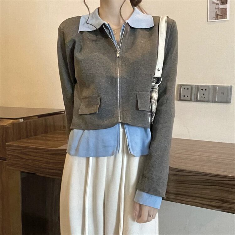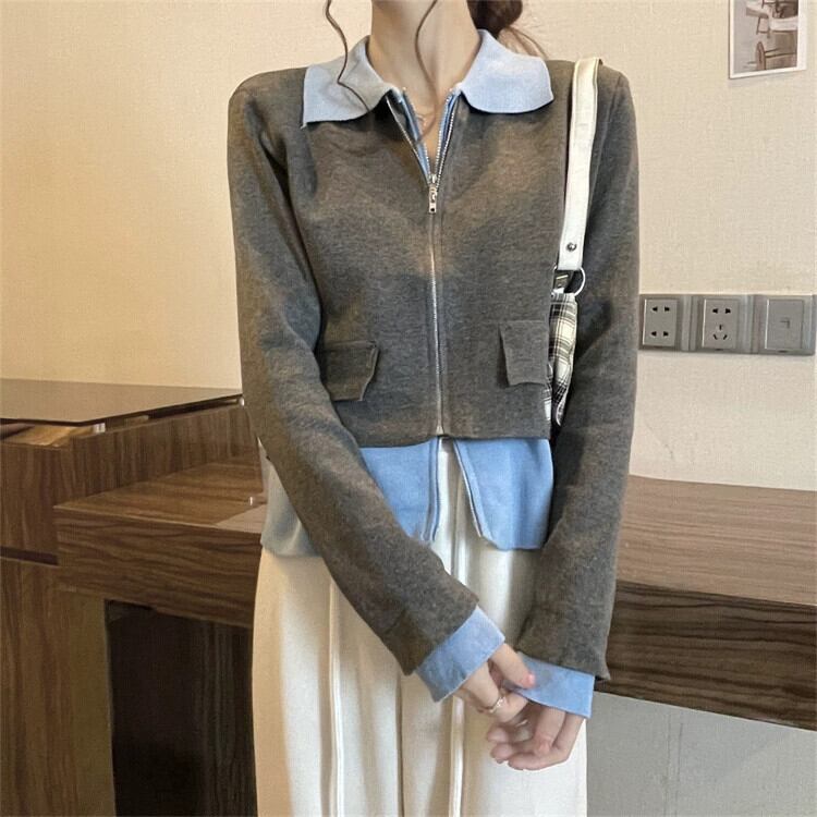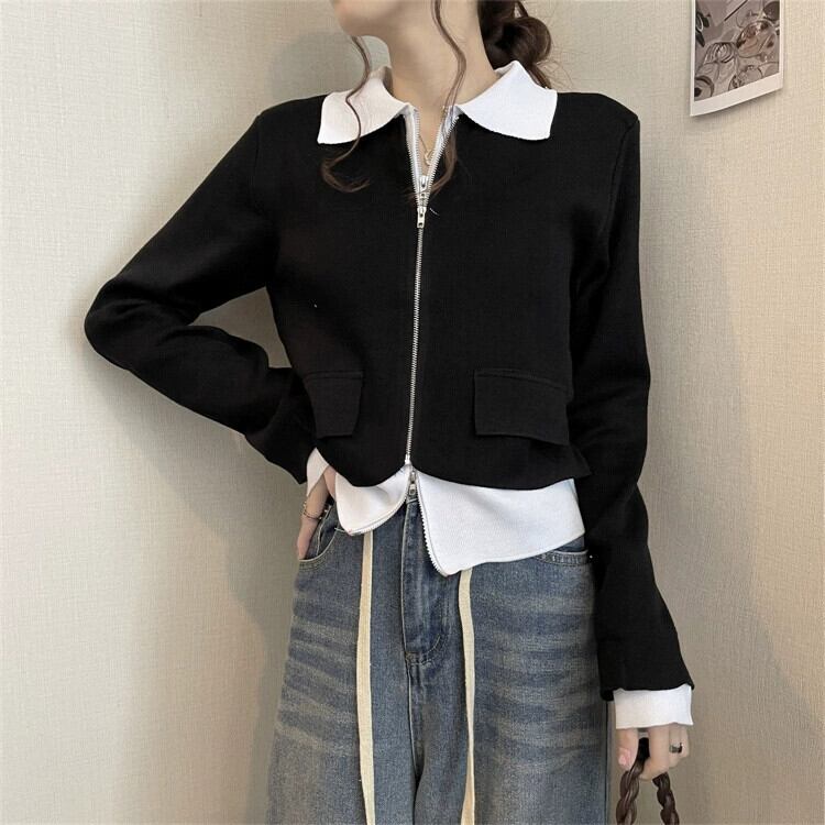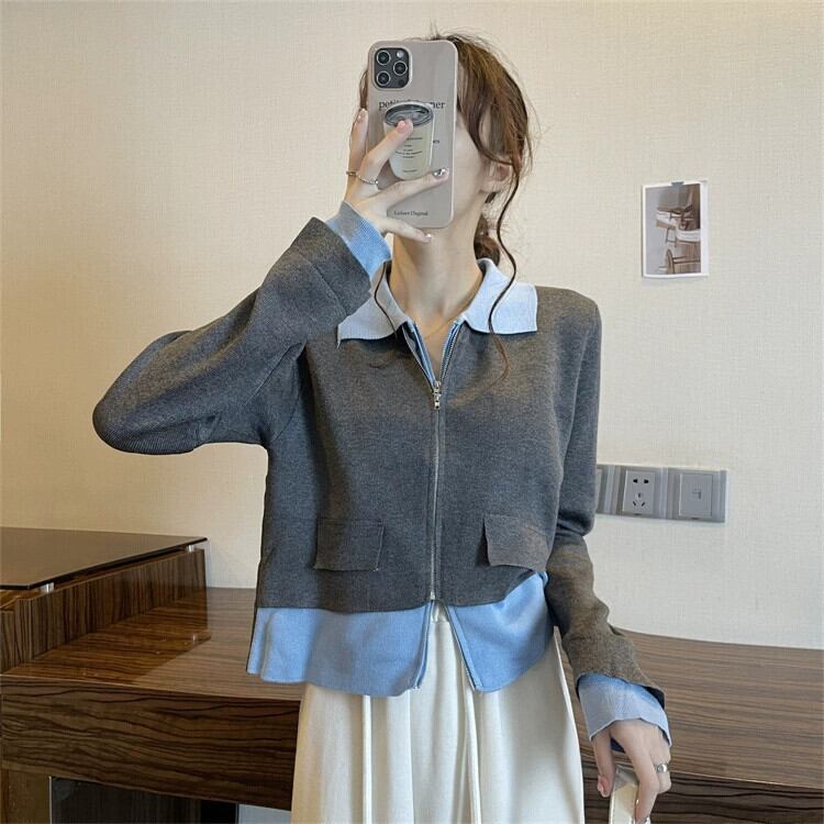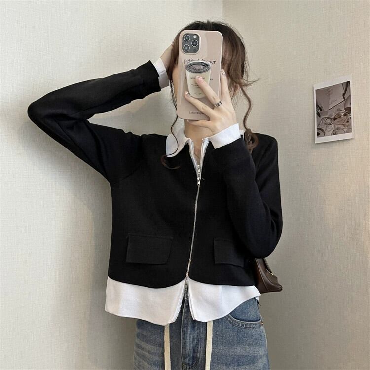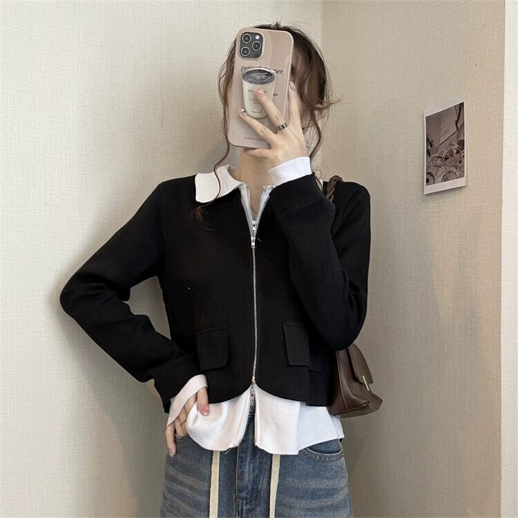 フェイクツーピースニットカーディガンジャケット女性の2023秋の新しいスタイルのユニークでユニークなデザインスタイルのショートトップ オータム 秋物 857165790797262