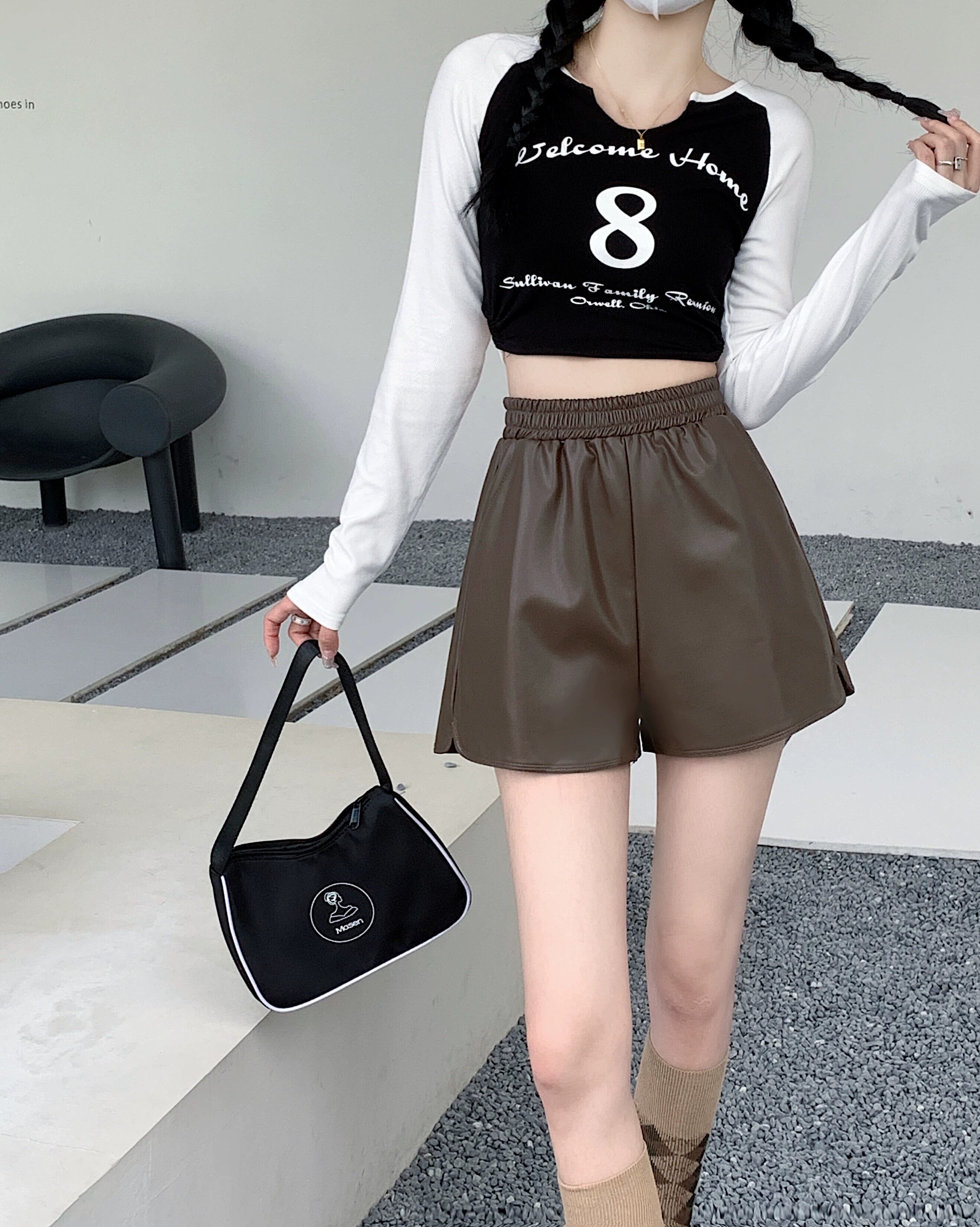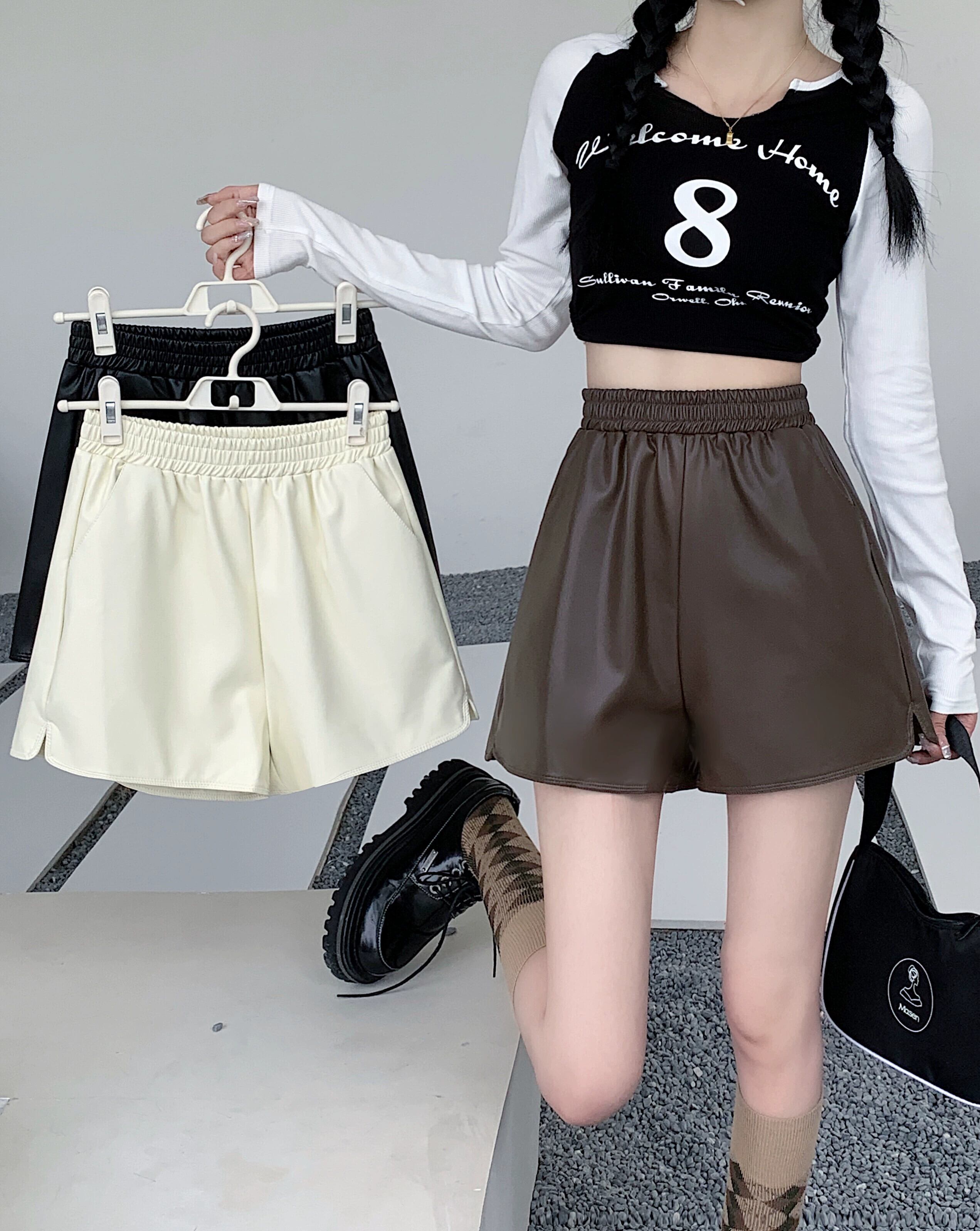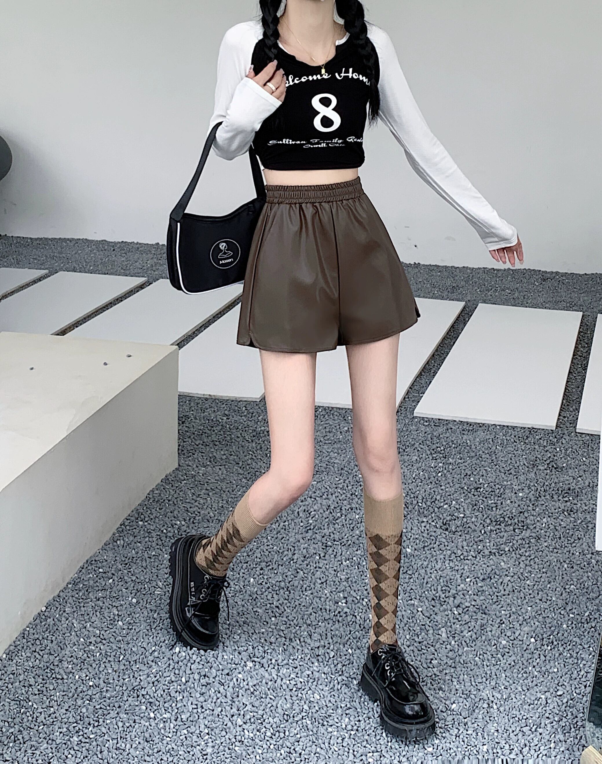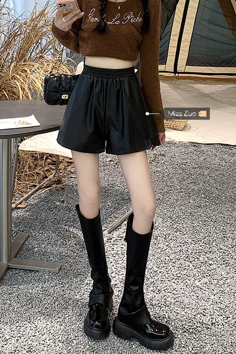 レザーショートパンツレディースルーズハイウエストワイドレッグパンツ2023秋冬新作ストレートカジュアルパンツスモールイントレンド オータム 秋物 ウィンター 冬物 ショーツ ブルマー 8571666645975213