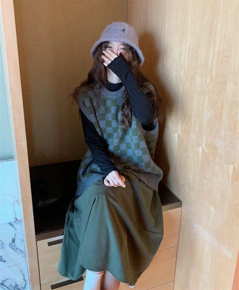 秋のチェック柄のニットベスト、レイヤードセーターベスト、フレンチレトロなノースリーブチョッキ、高級ベスト レッド 8571618531308731