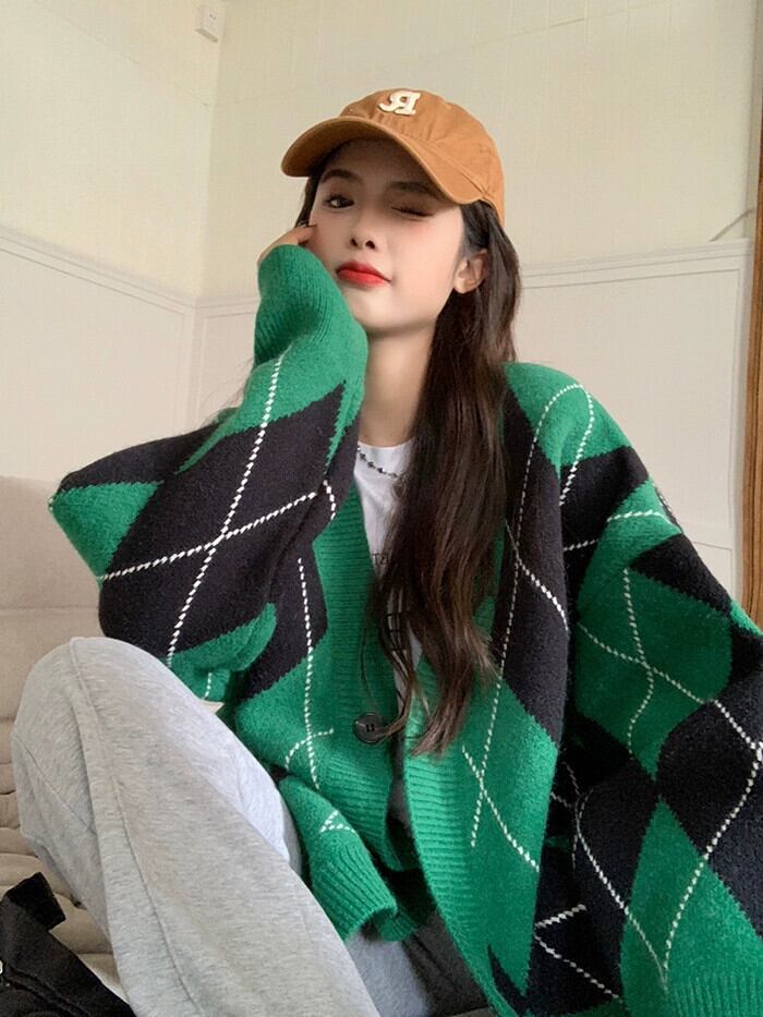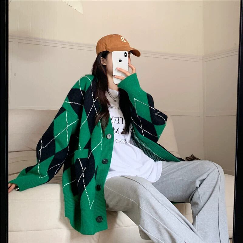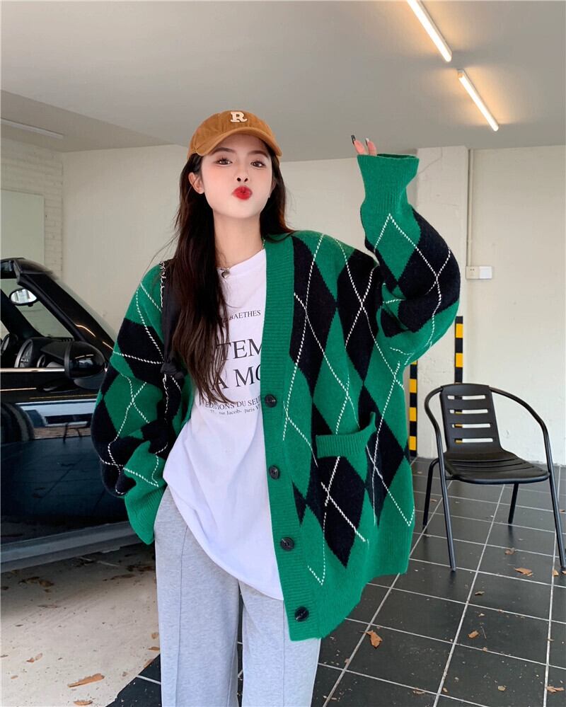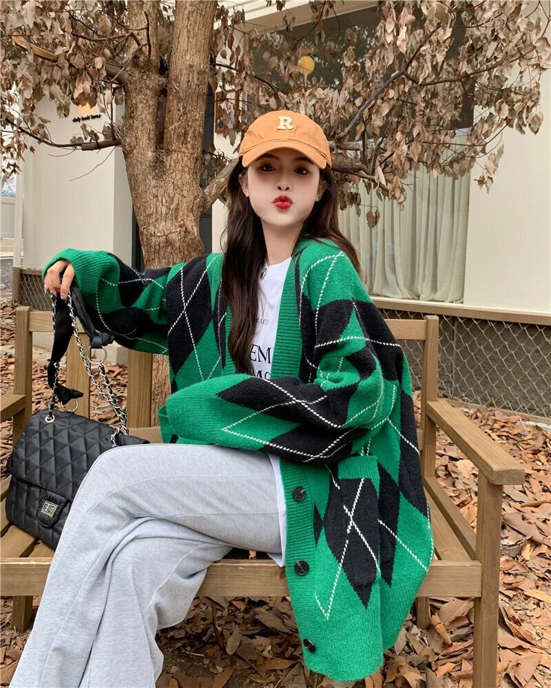 ダイヤモンドセータージャケット女性の秋 2023 新しい緩いレトロな怠惰なスタイルのミッドレングス V ネックニットカーディガン オータム 秋物 Vネック 8571637727809293
