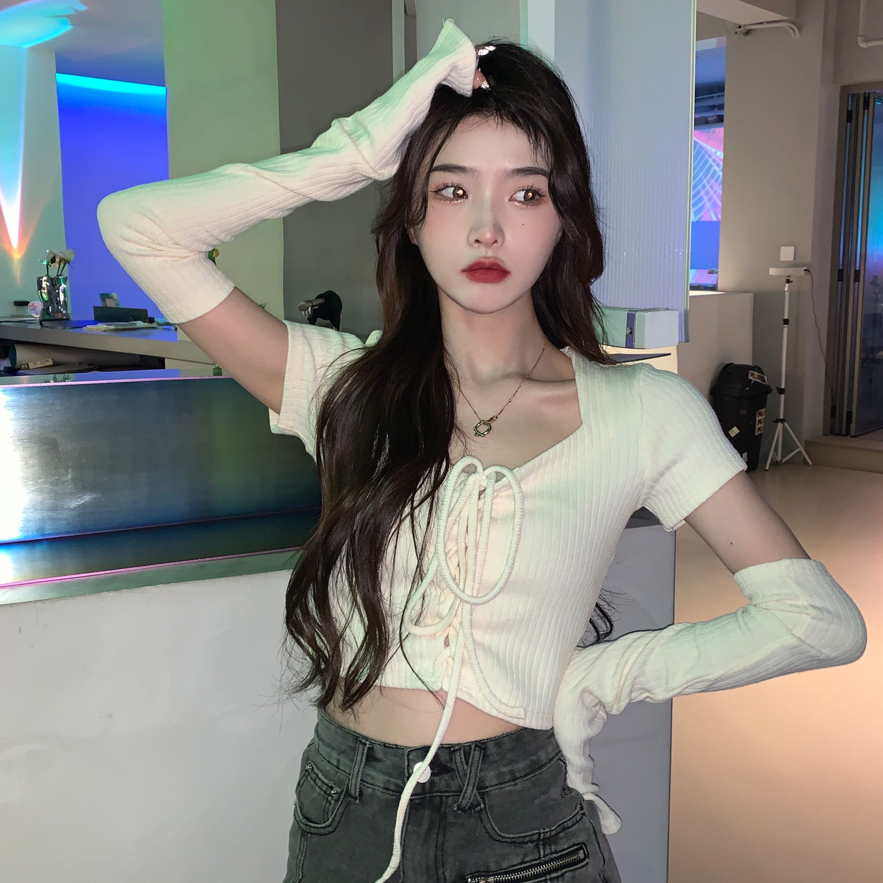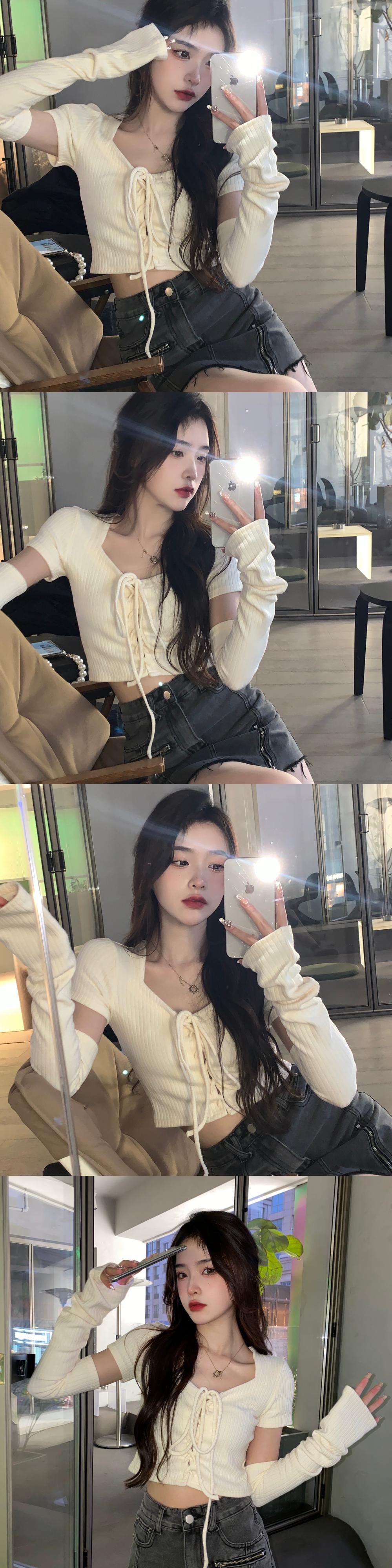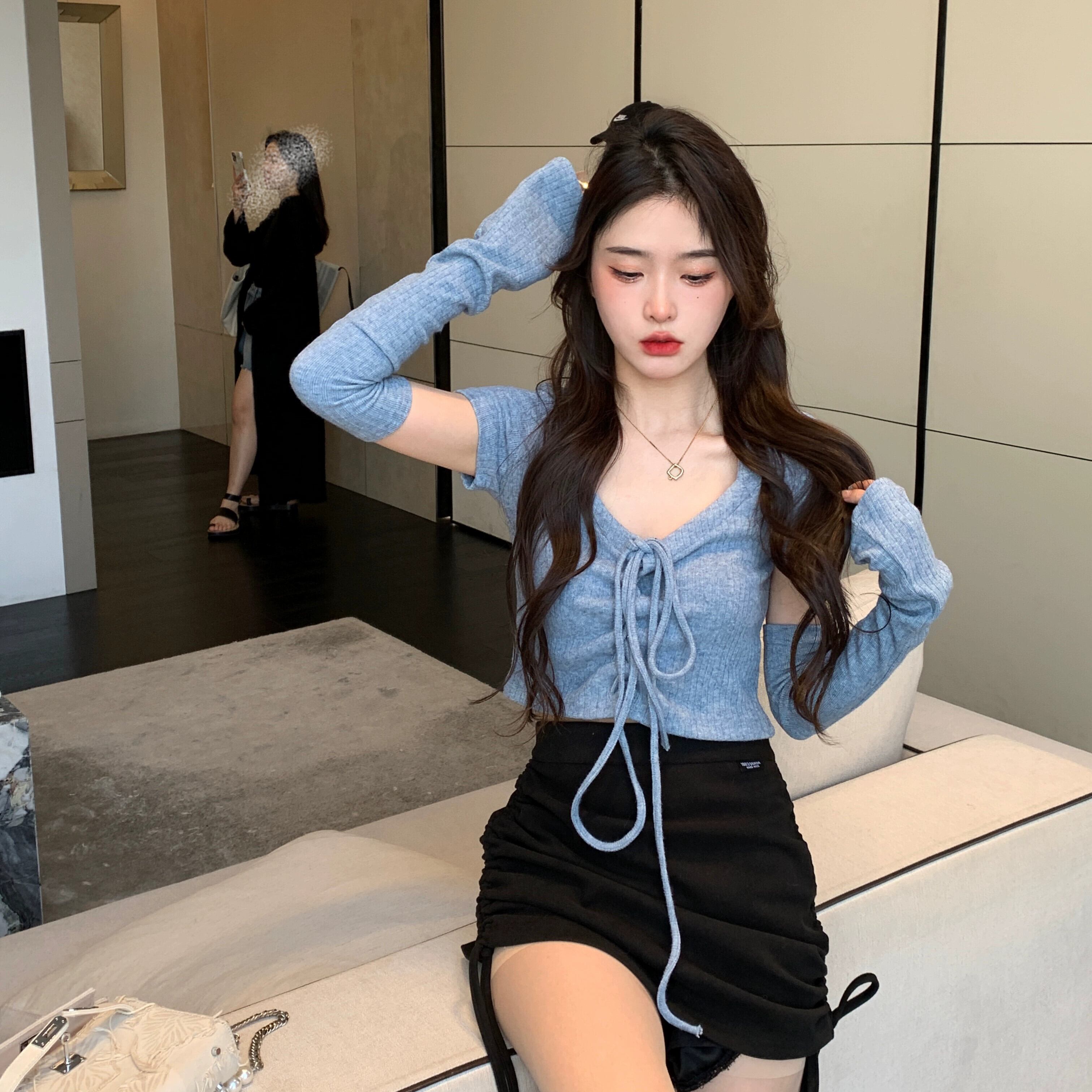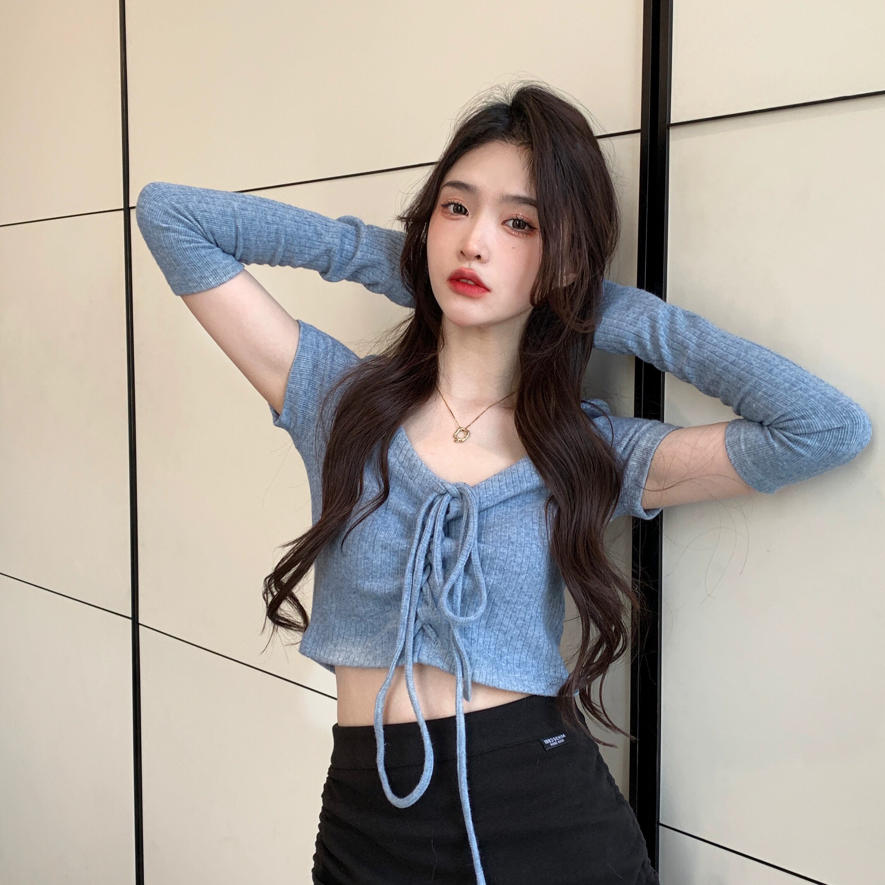 ブルースリーブ Tシャツ女性 2023 初秋の新スタイルの小さなセクシーな純粋な欲望ハイウエストスリムショートトップ ハイウェスト オータム 秋物 ピュア 8571660058010450