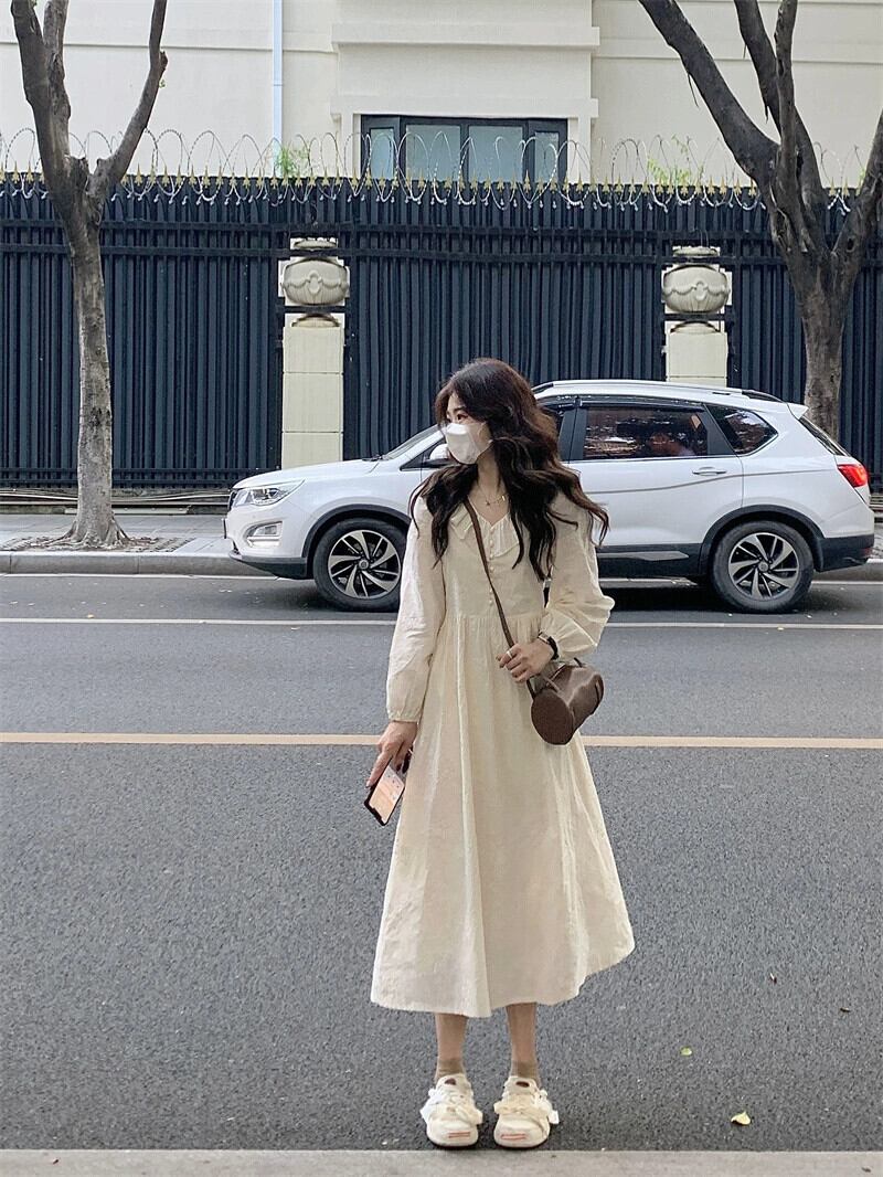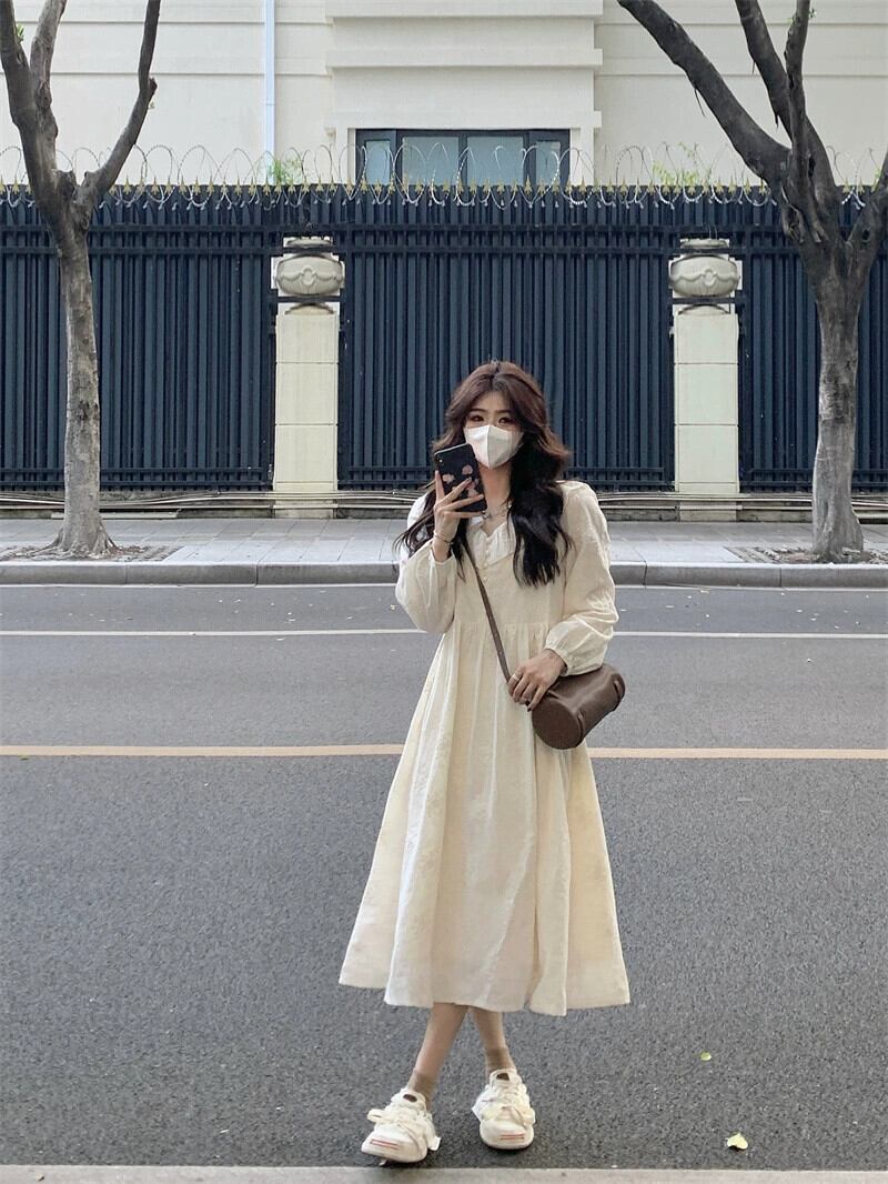アプリコット長袖ドレスの女性 2023 初秋の新しいスタイルの優しいスタイルのドレス、気質と高級感のある小柄な人 ロング オータム 秋物 8571690961164636