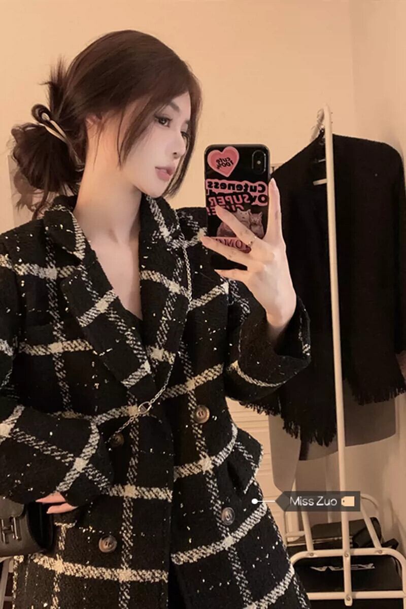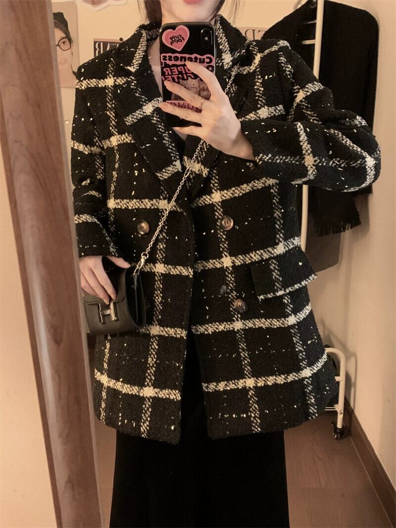 ミッドレングスのチェック柄ウールジャケット女性の秋肥厚ヘップバーンスタイルレトロハイエンドウールトップ小人 オータム 秋物 8571678138228478