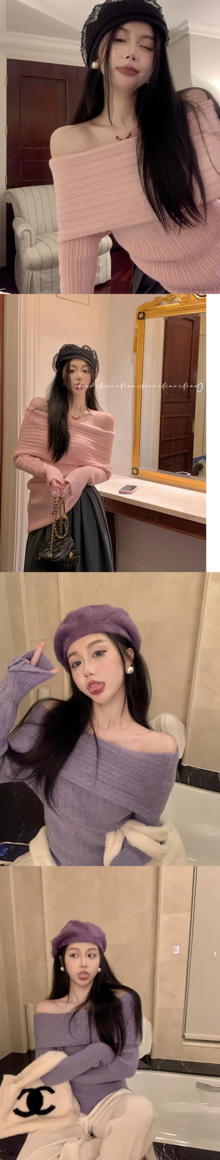 ワンショルダーセーターレディース、秋冬インナーレイヤリングトップ、ニッチデザイン、ユニークで美しいピンクのオフショルダーセーター オータム 秋物 ウィンター 冬物 8571649808549679