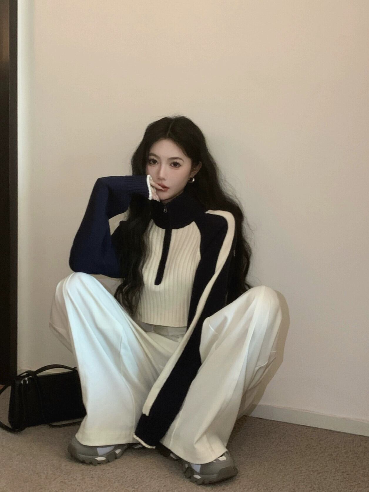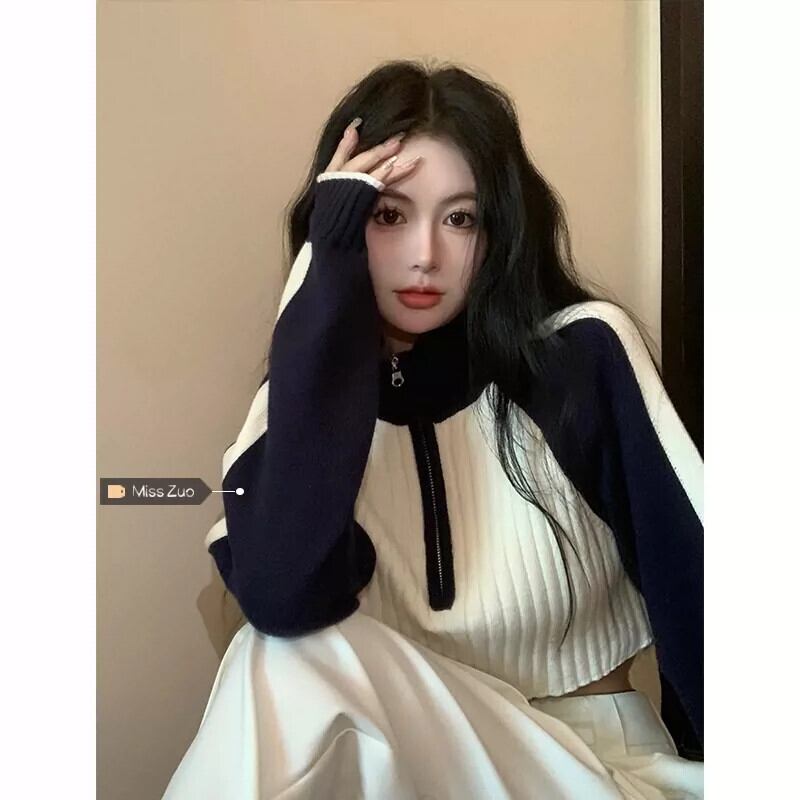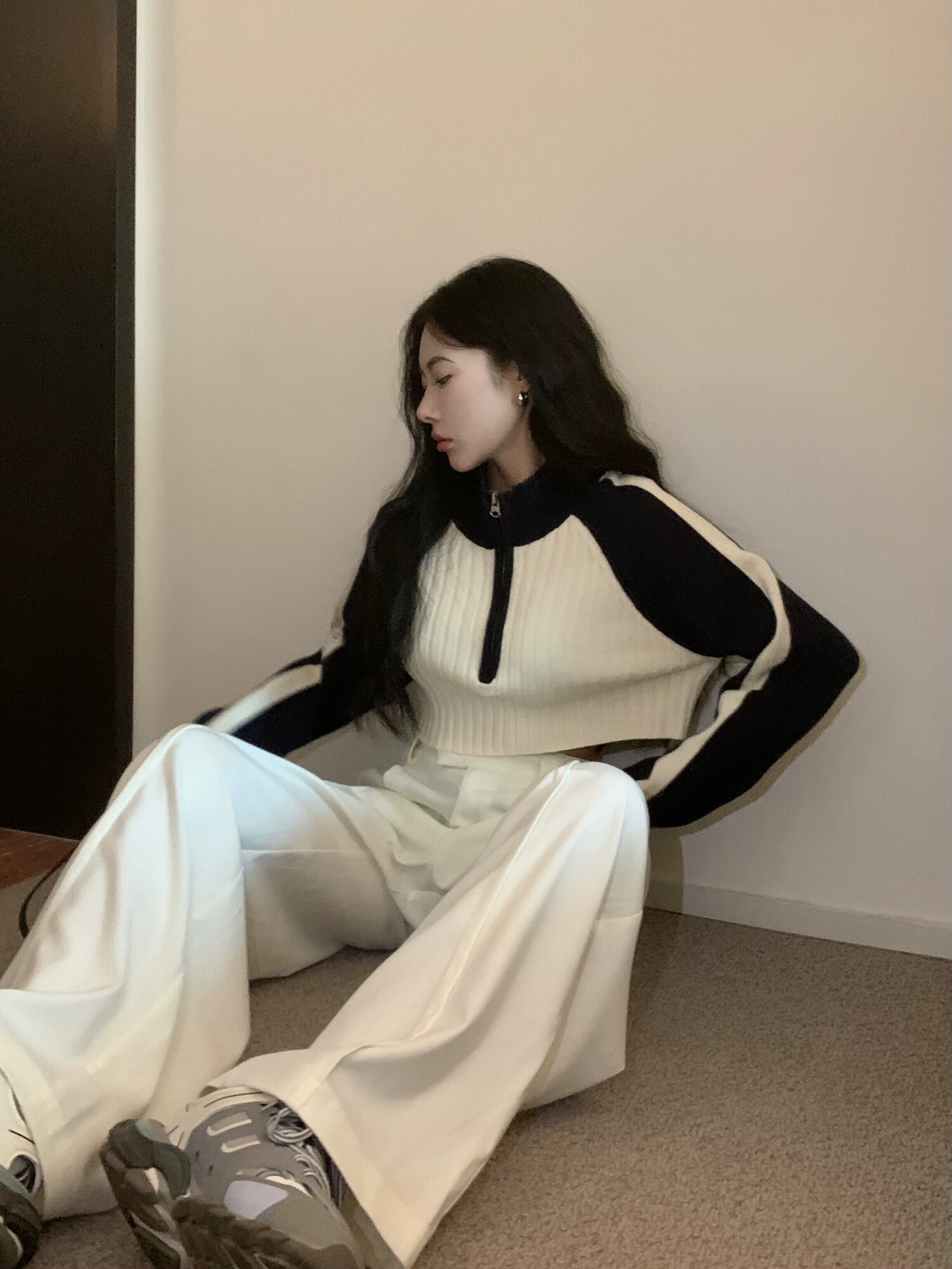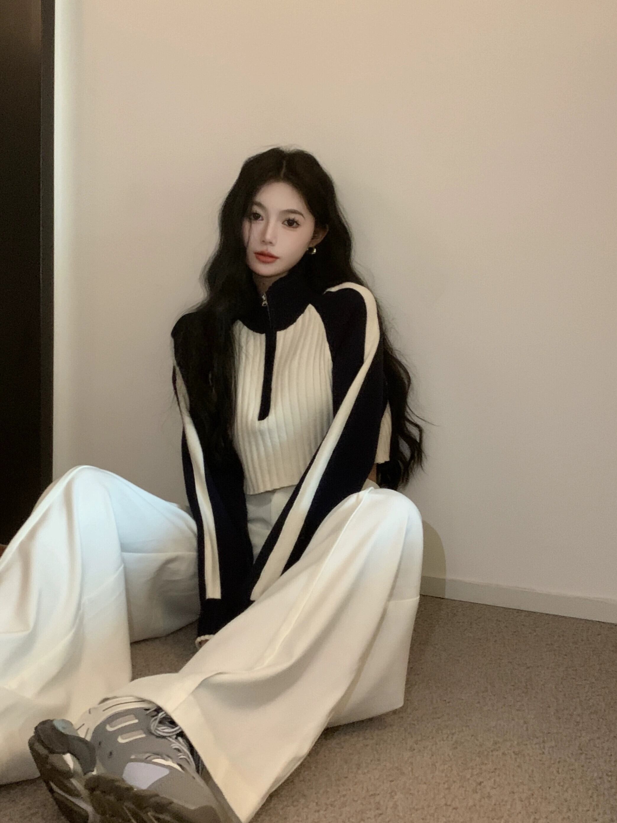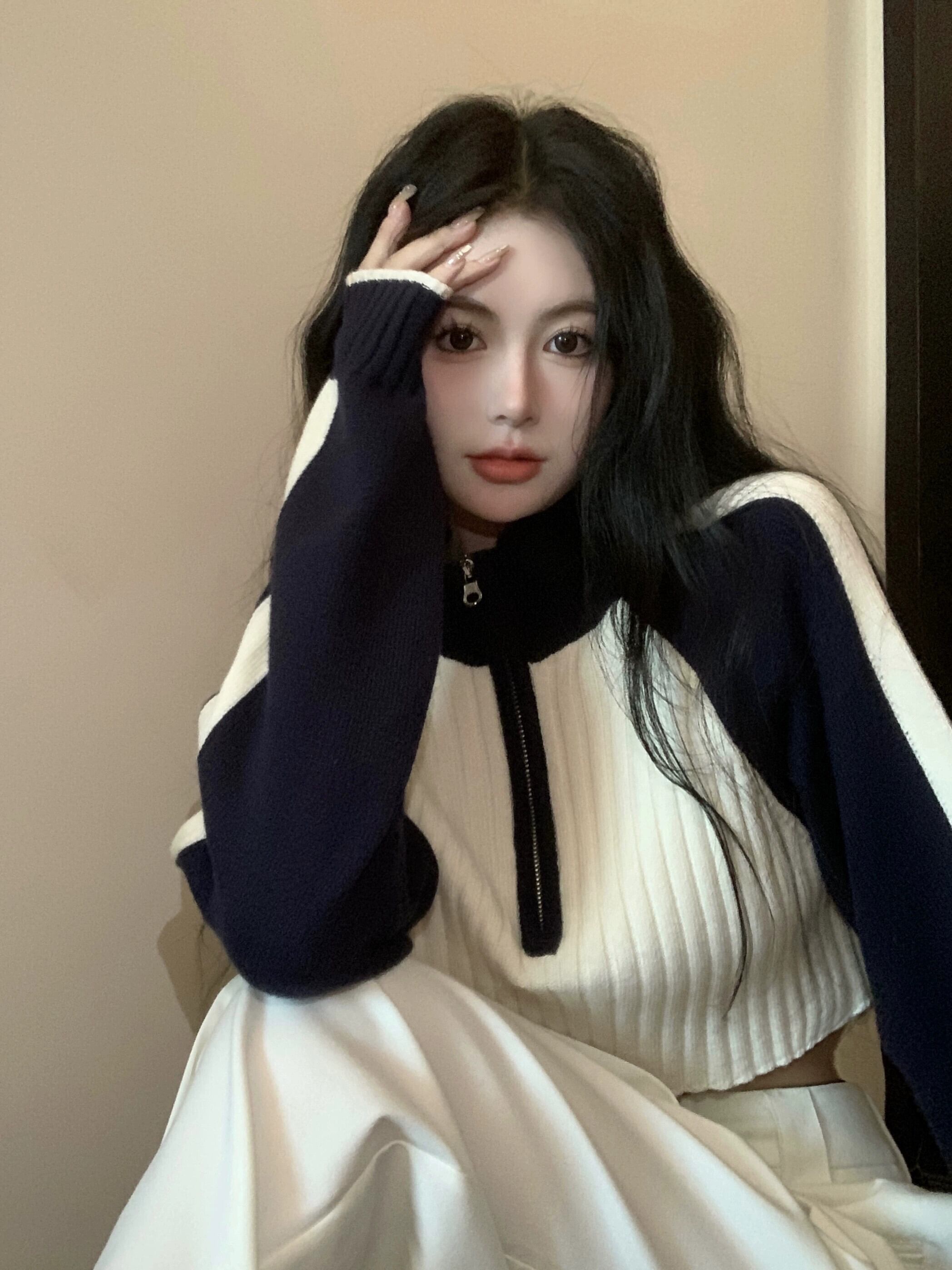 ホワイトハーフジップショートセーター女性秋冬2023新しいシックで甘いデザインニッチセーター 大人ガーリー スウィート キュート カジュアル オータム 秋物 ウィンター 冬物 8571698885950178