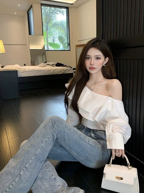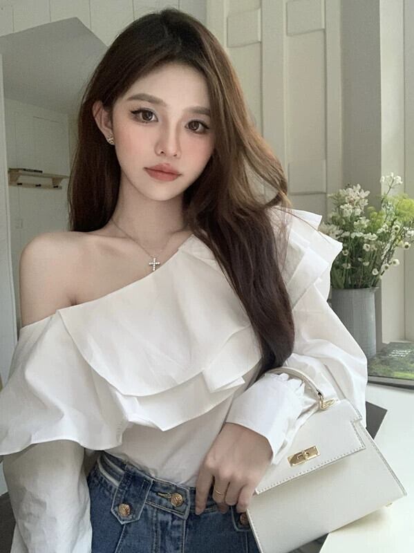 白いフリルシャツの女性の2023年初秋の新しいデザインのニッチでユニークなシックなオフショルダー長袖トップ ロング ホワイト オータム 秋物 8571678358906457