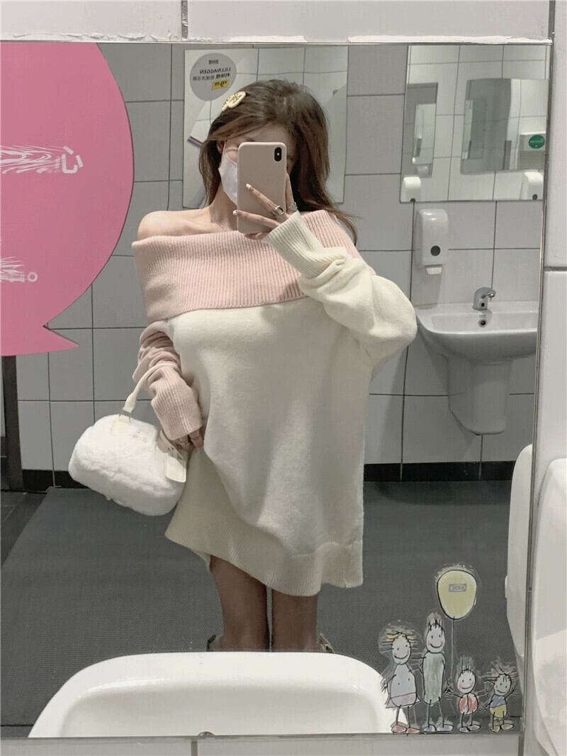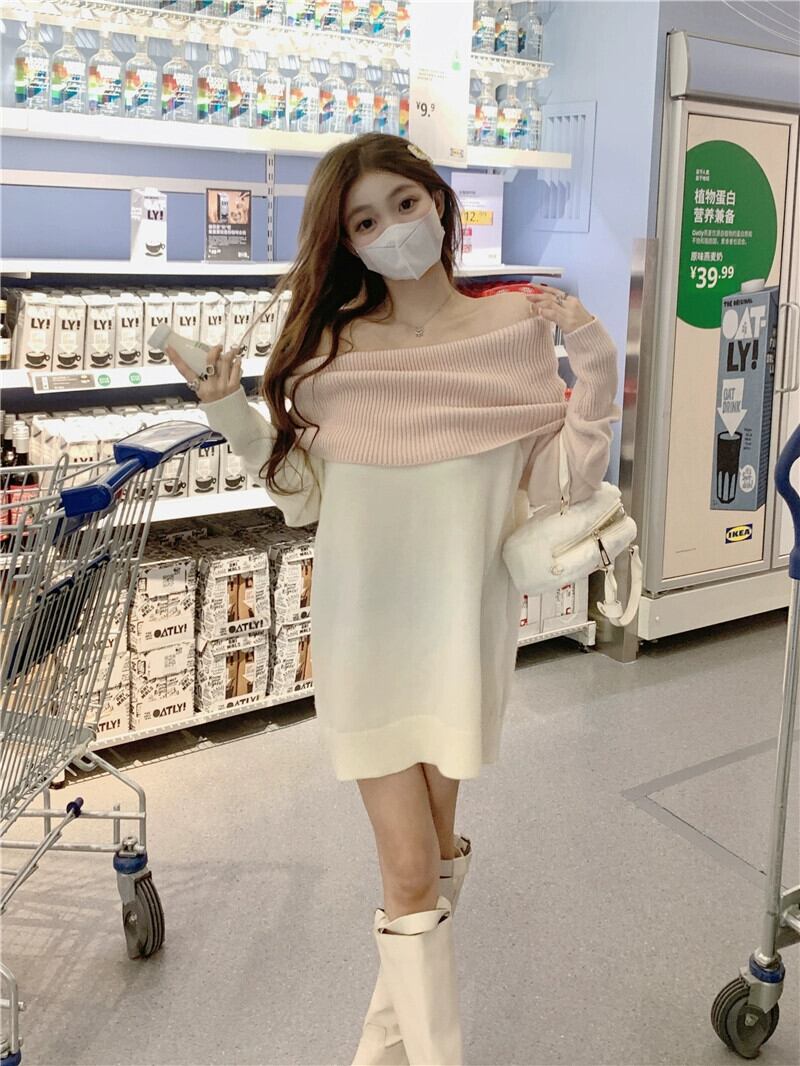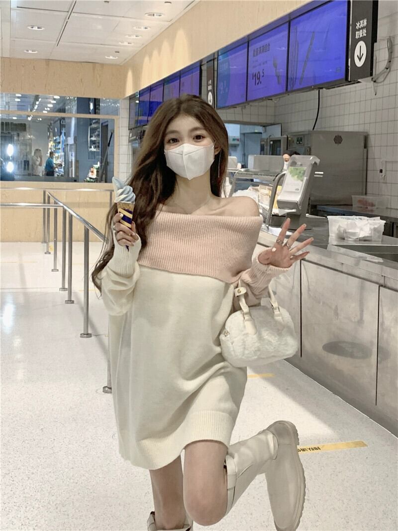 ワンショルダーセータードレス女性 2023 秋の新デザインの小さなオフショルダーインナーニットショートスカート オータム 秋物 8571657426573249