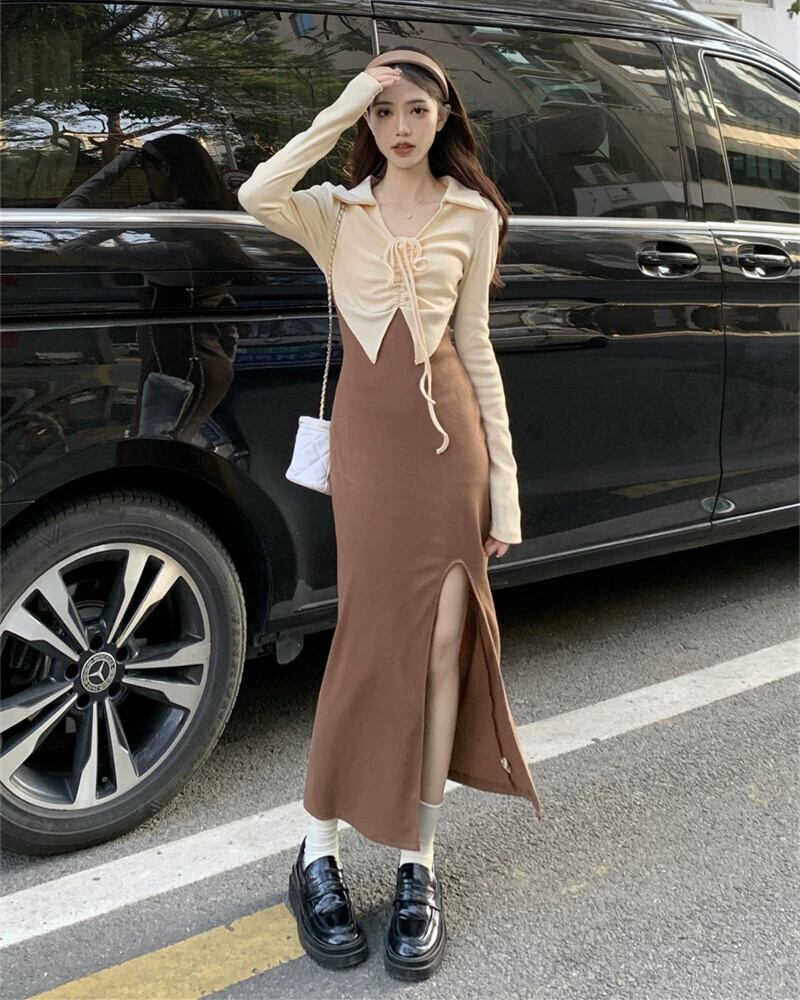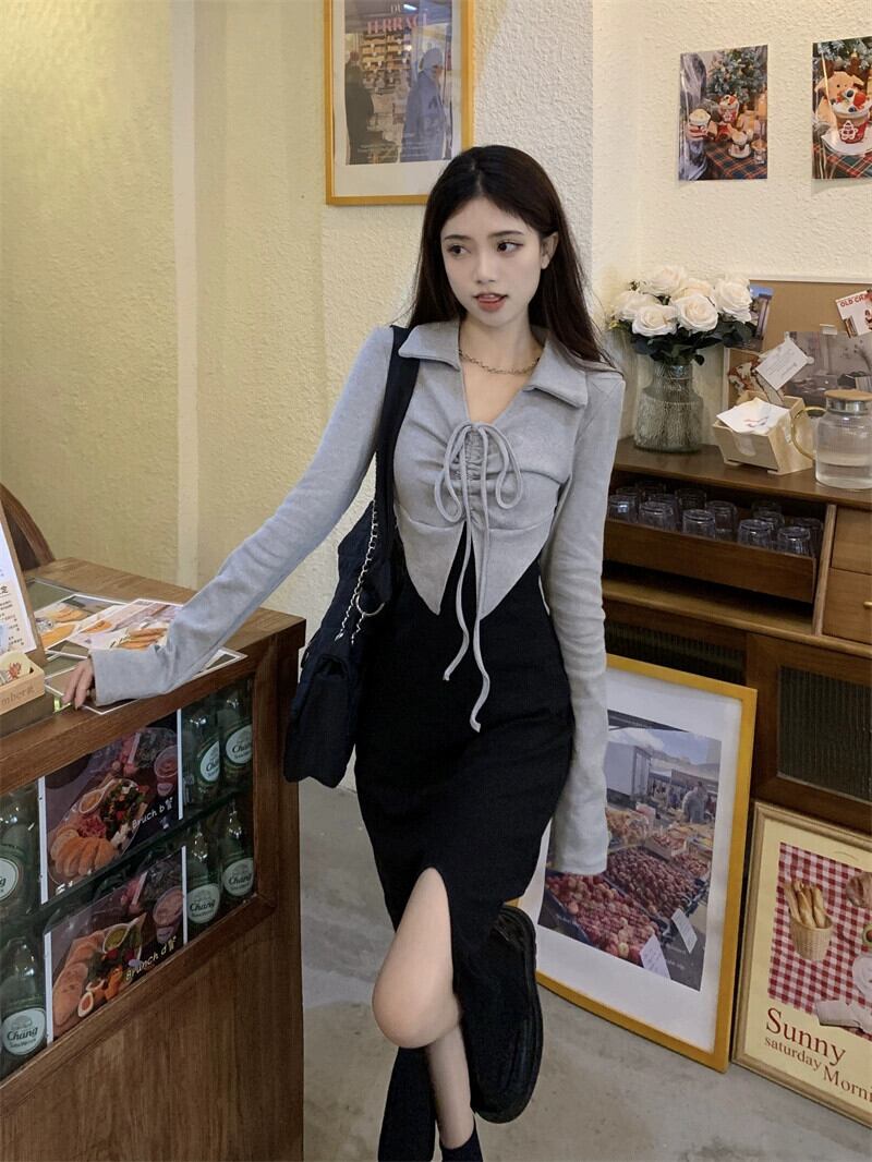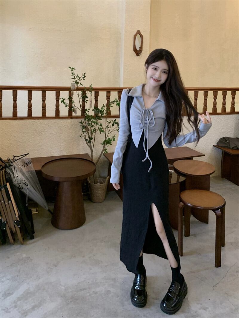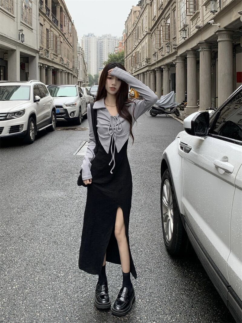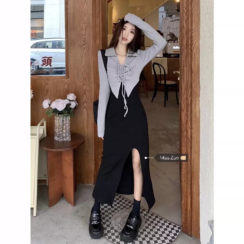 フェイクツーピース長袖ドレス女性のニッチデザイン2023秋の新作純粋な欲望スリットロングスカート オータム 秋物 ピュア 8571645711900608
