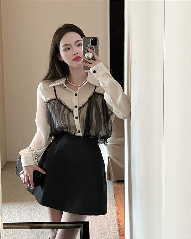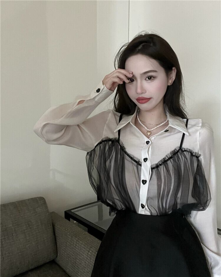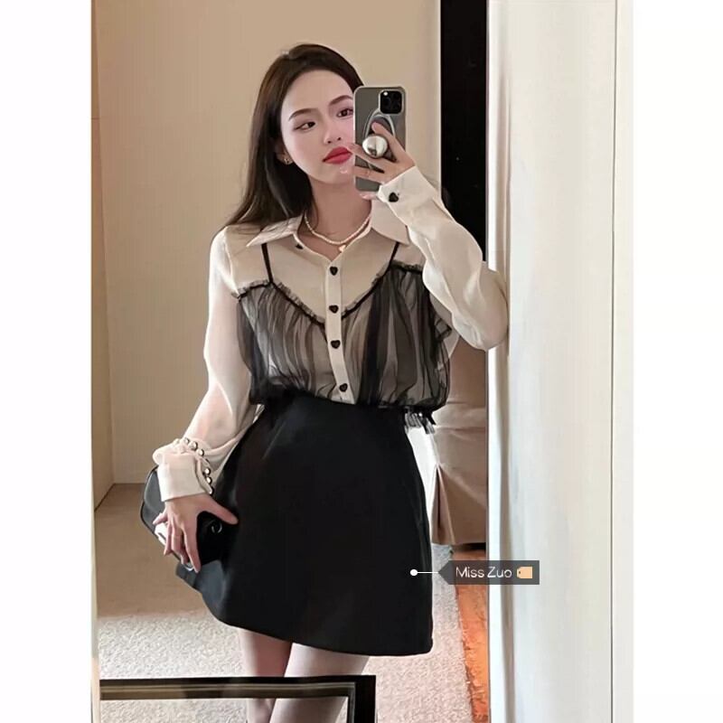 ニッチなデザインの偽ツーピース長袖シャツ女性、2023年秋の新しいスタイル、ユニークでユニークな、小さなトップ ロング オータム 秋物 8571694767300582