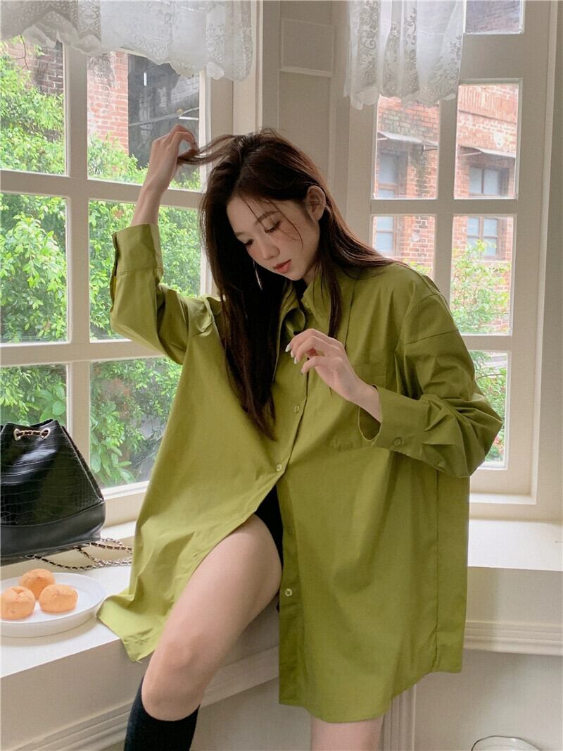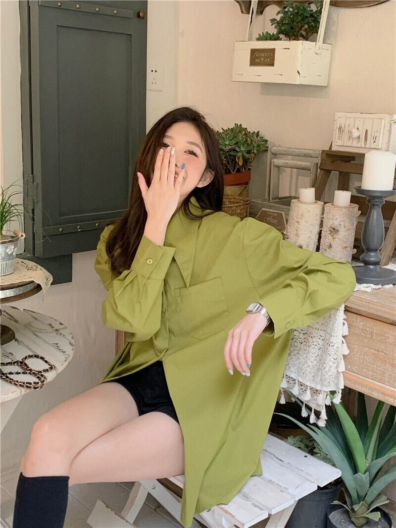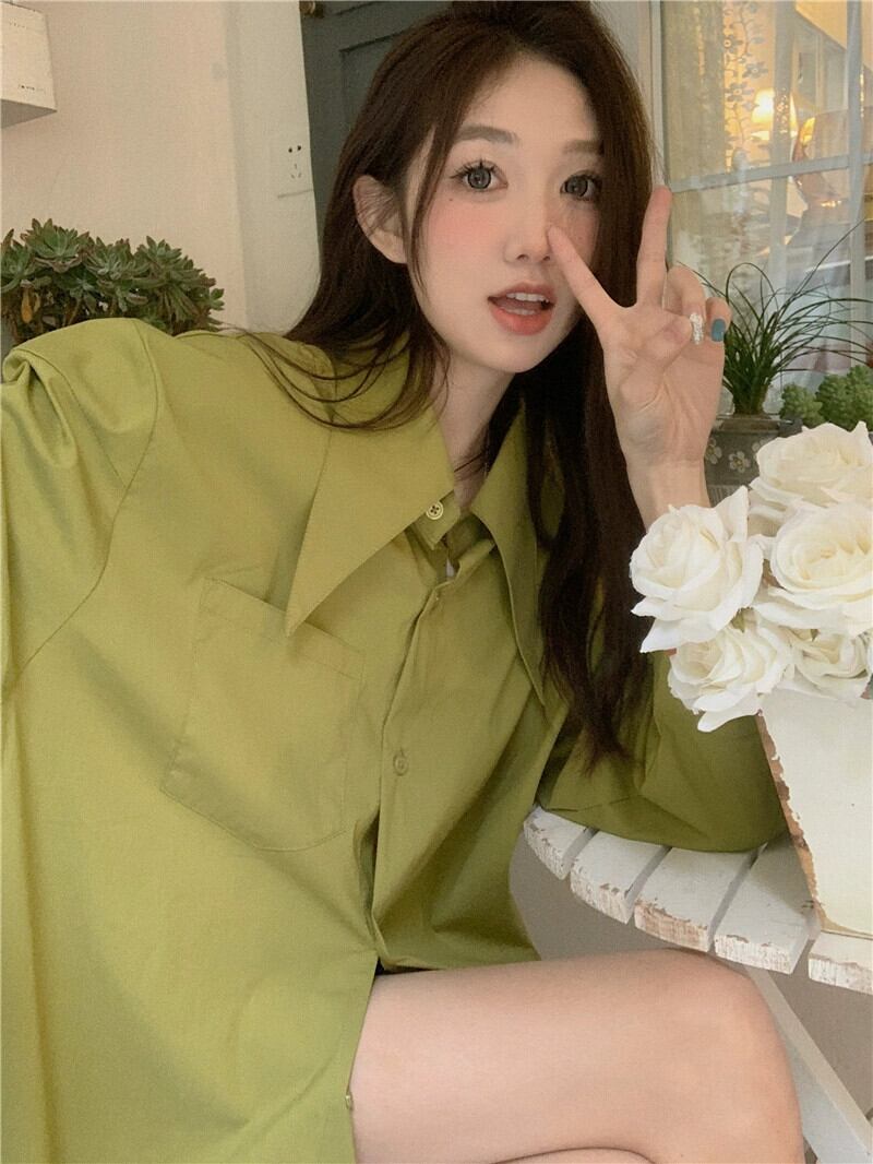 グリーン長袖シャツ女性のニッチデザインハイエンドシャツ2023秋の新しいスタイルのインナーレイヤリングトップ ロング オータム 秋物 8571685797613265