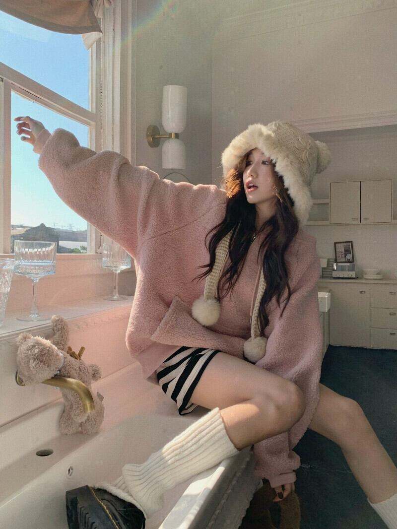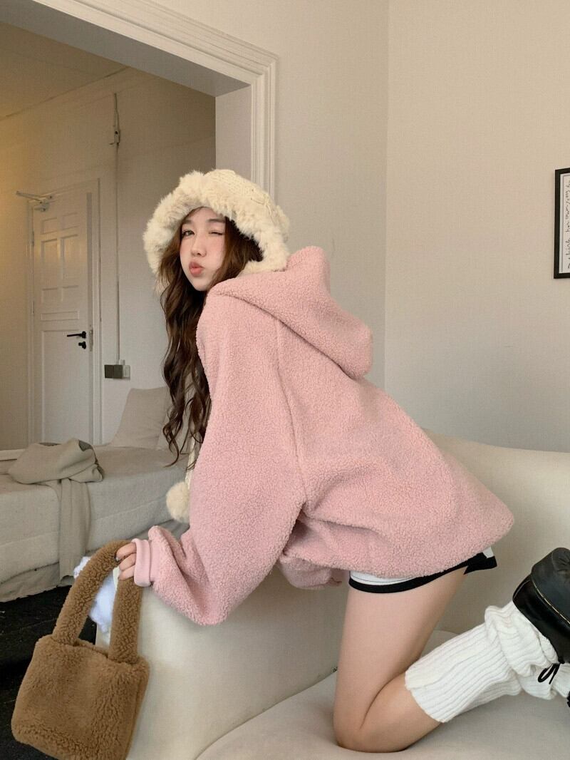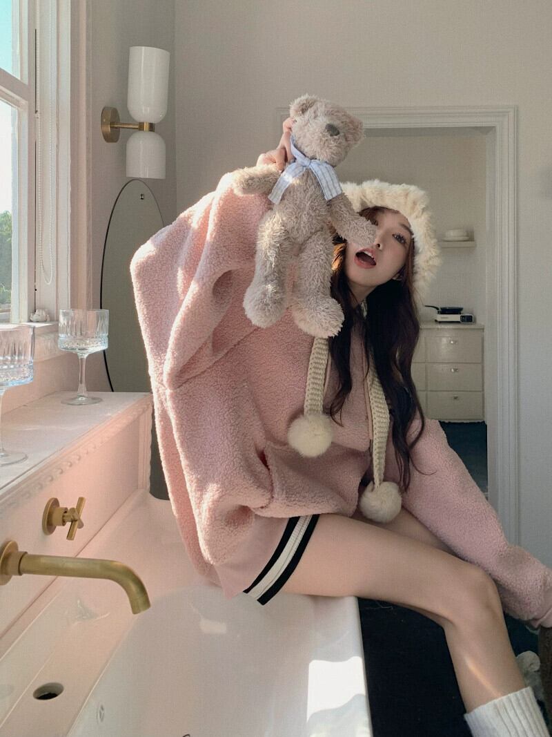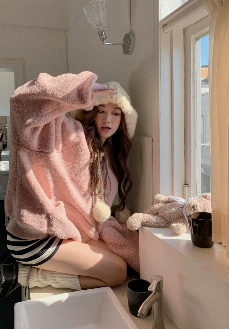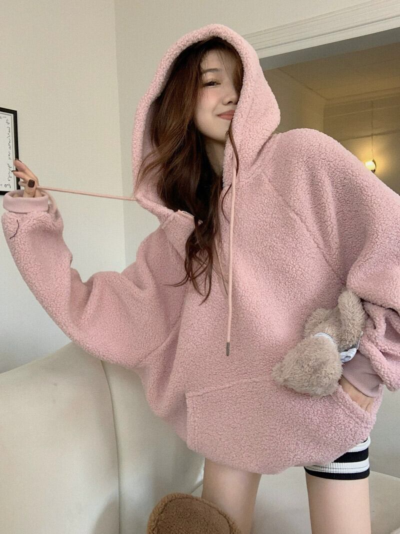 ピンクのラムウールのフード付きスウェットシャツの女性の冬ベルベット肥厚 2023 新しいミルキーな甘い多目的トップリトルピープル 大人ガーリー スウィート キュート カジュアル ウィンター 冬物 8571649771041232