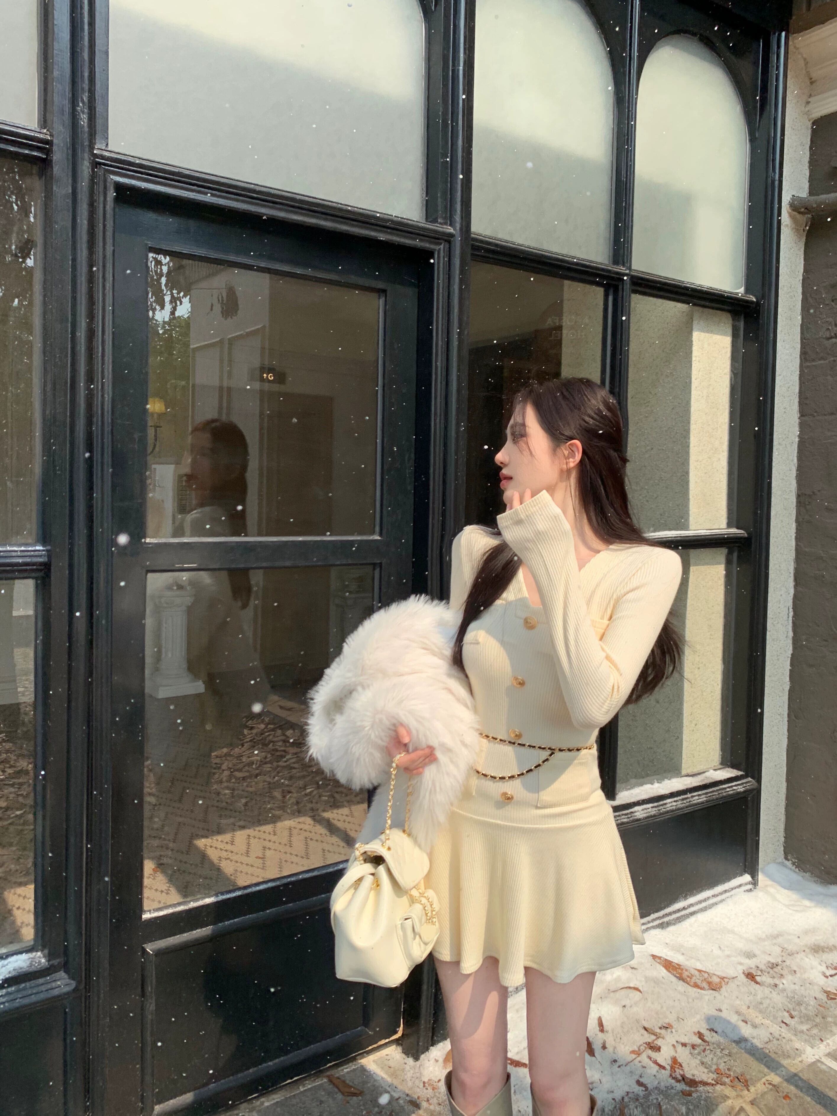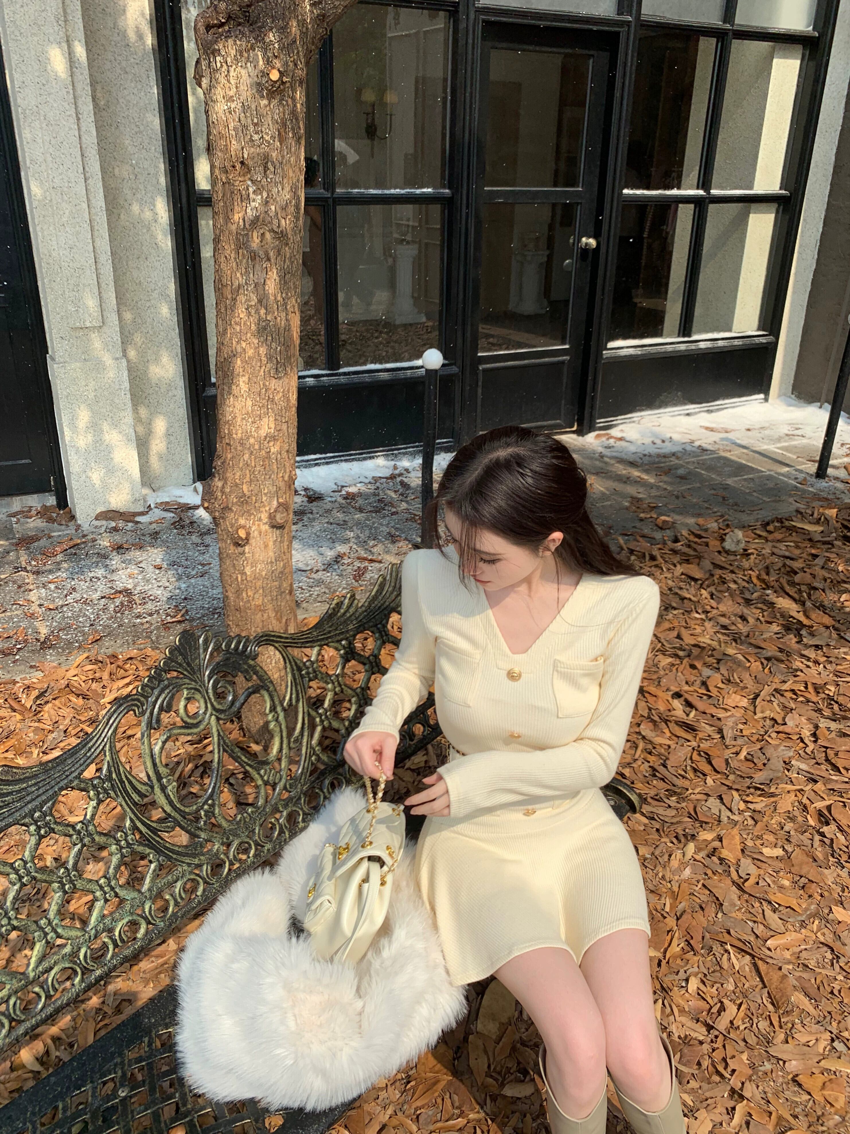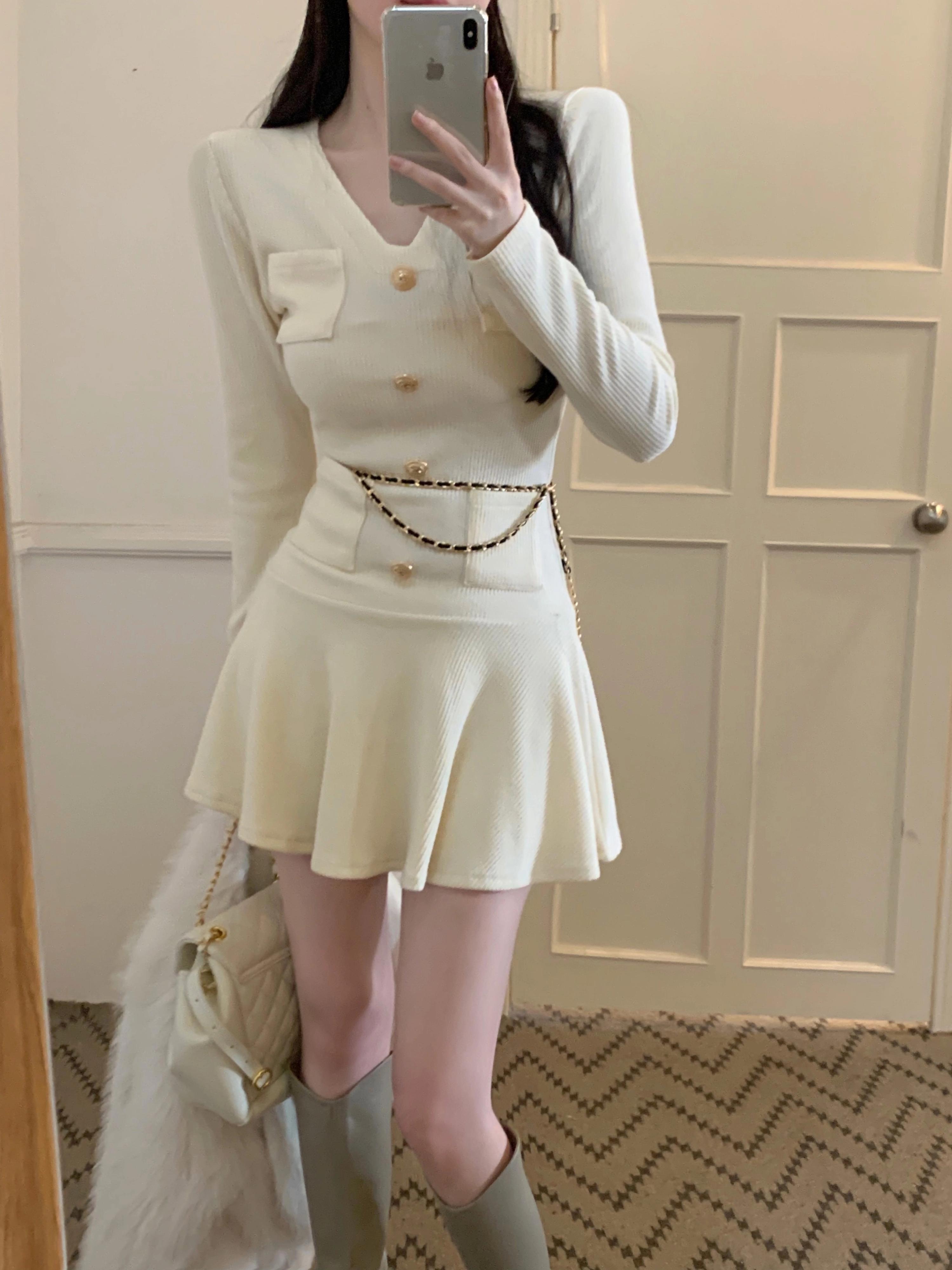 純粋な欲望スタイル V ネックニットドレスレディース秋デザインニッチインナーウェアスリムフィットボトリングスカート A ラインショートスカート オータム 秋物 Vネック Aライン 8571639227225892