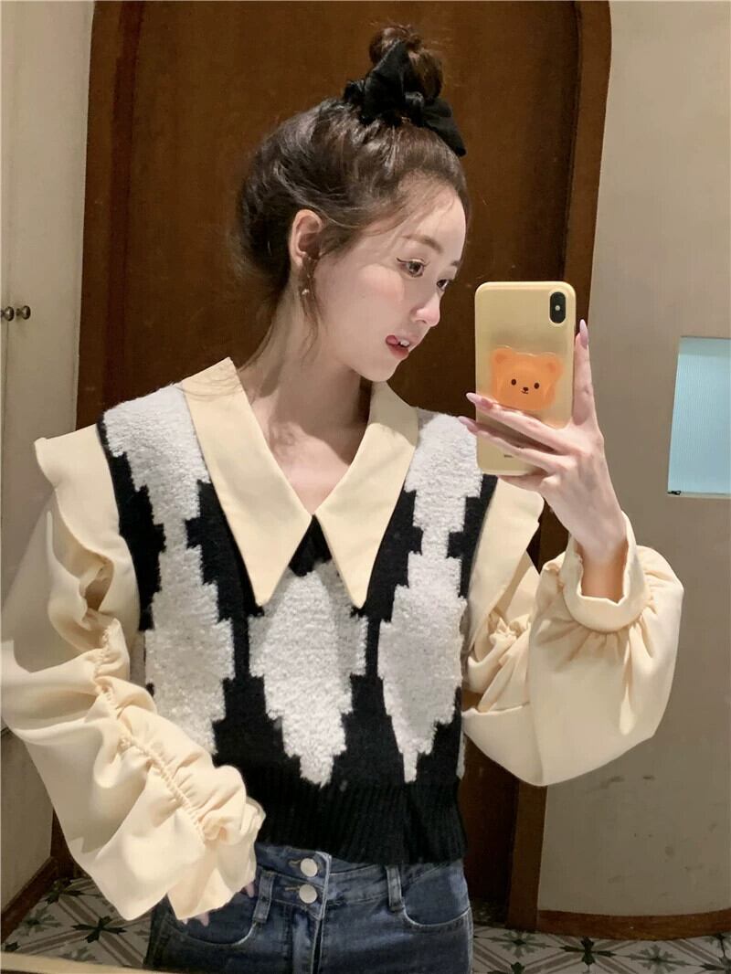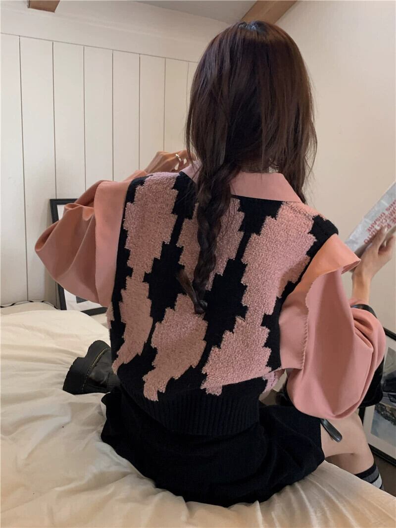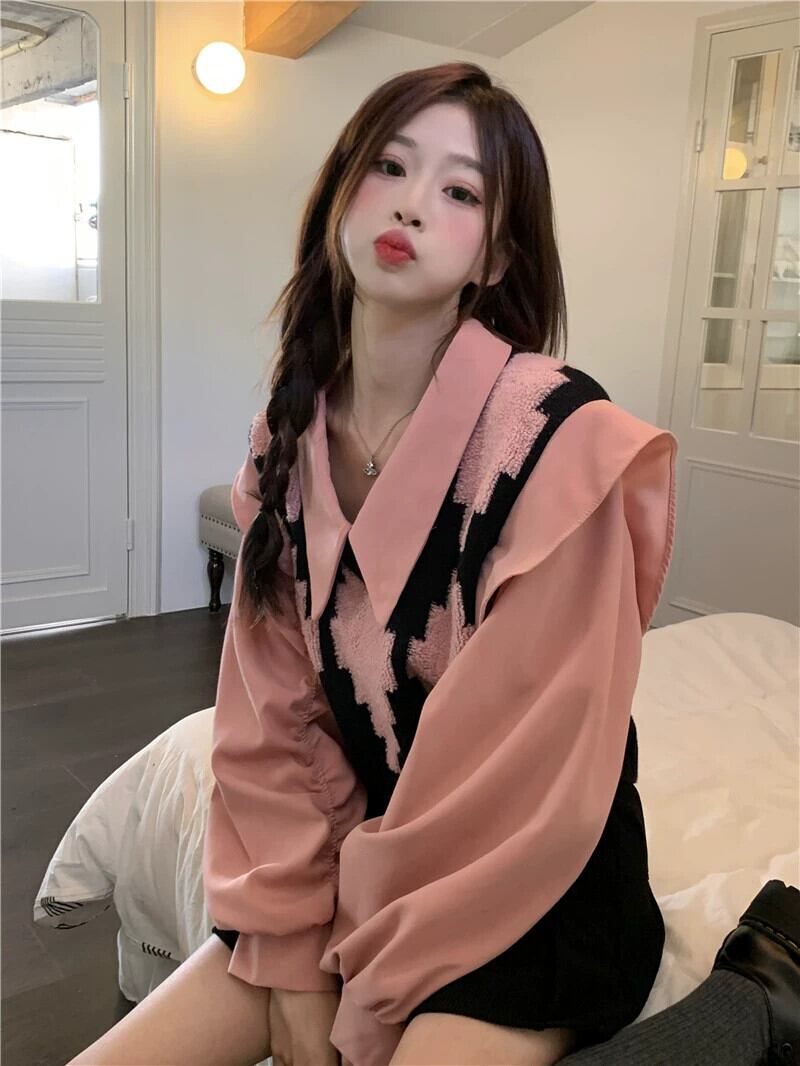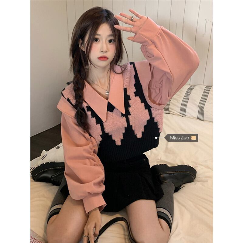 偽ツーピース菱形ニットセーター女性の春と秋の 2023 新デザインピンクポロカラートップ小人 スプリング 春物 オータム 秋物 8571634103818709
