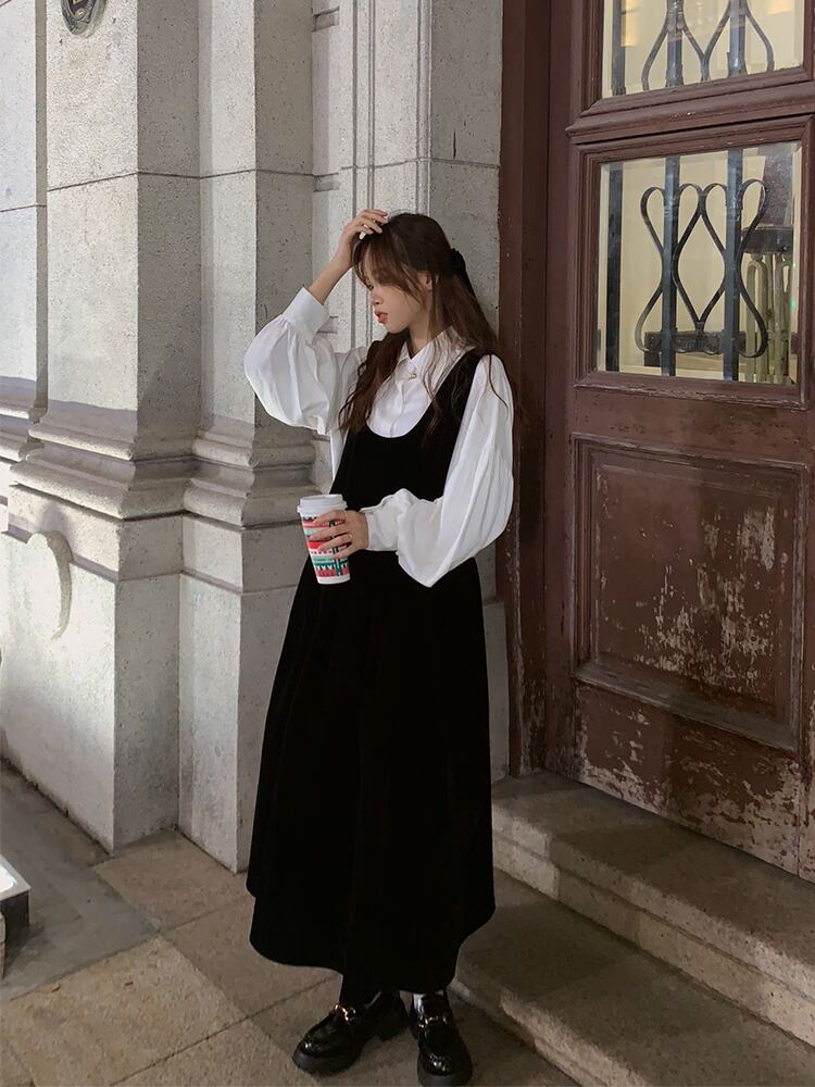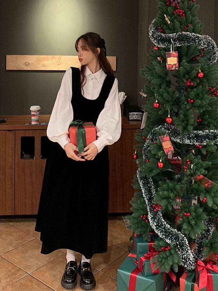 赤いベルベットのストラップドレス女性の秋の気質女神スタイル 2023 新しいハイエンドの弓ロングスカート レッド リボン オータム 秋物 8571660679835011