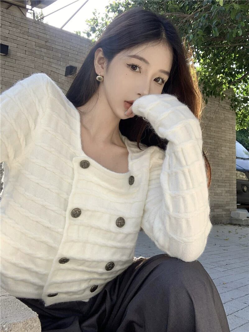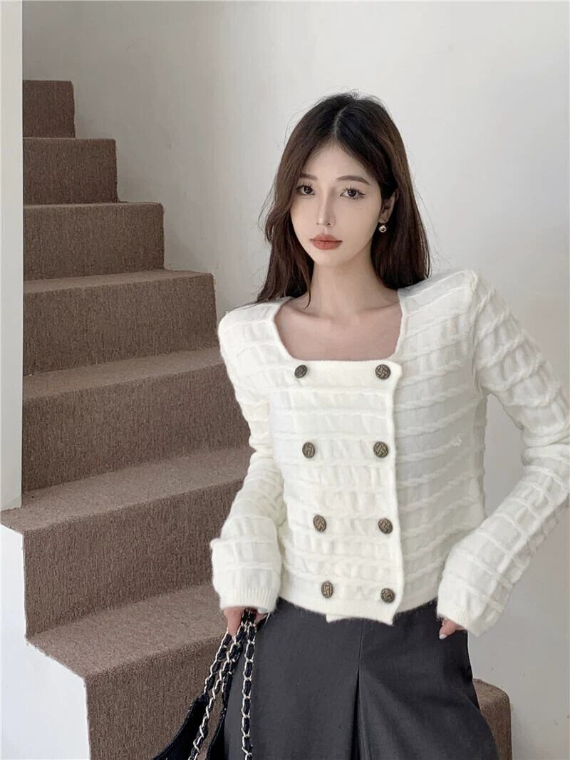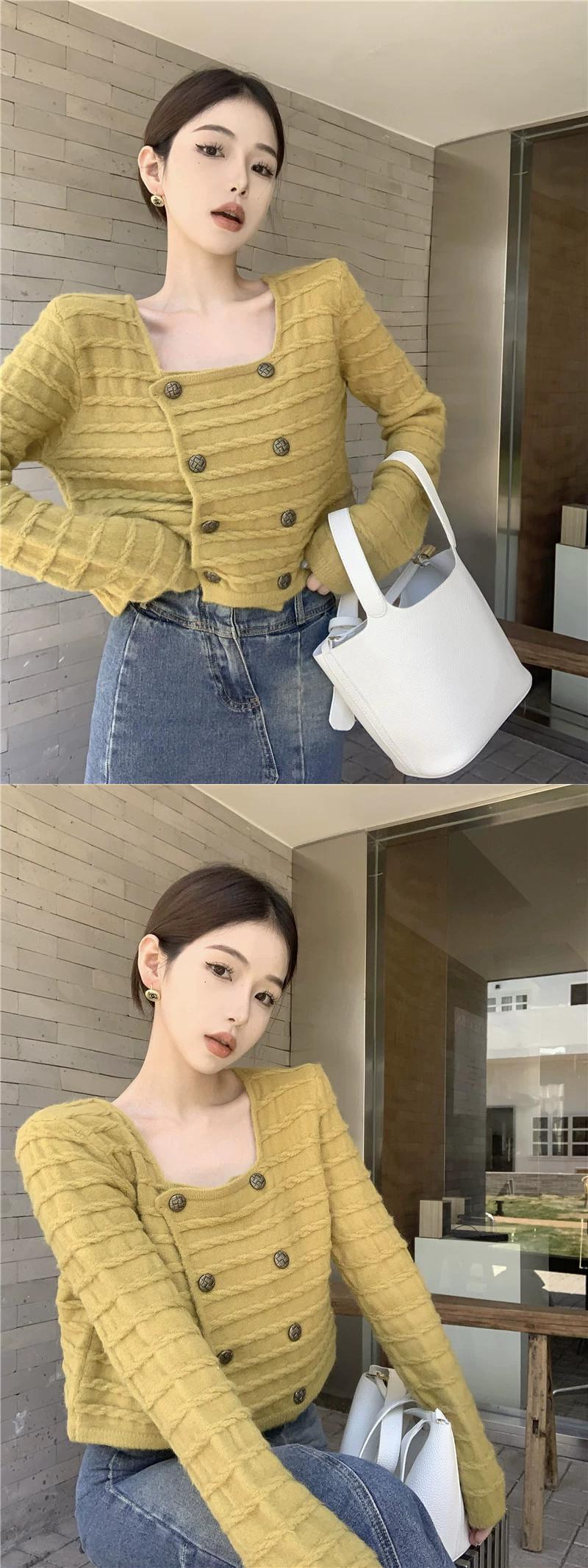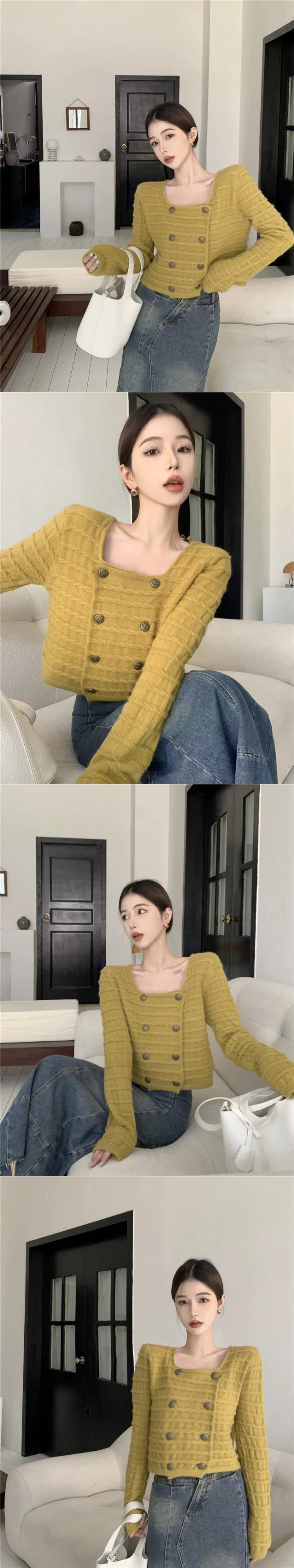ダブルブレストのセーターの女性秋デザインニッチスクエアネックセーター 2023 新しいフレンチスタイルの優しいショートトップ オータム 秋物 スクウェア 8571660332697388