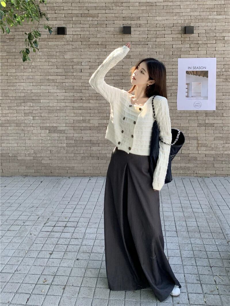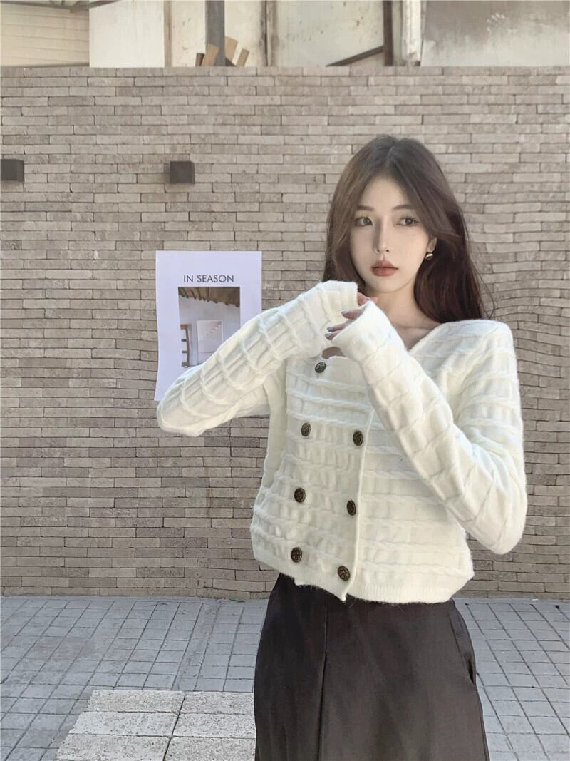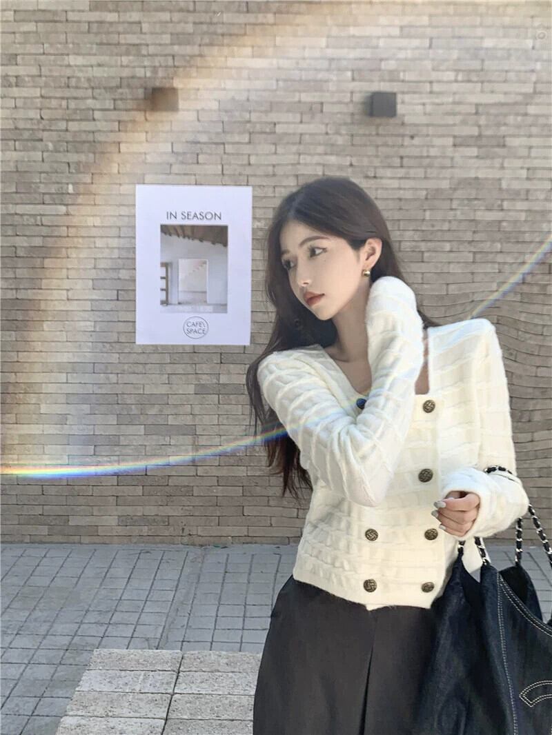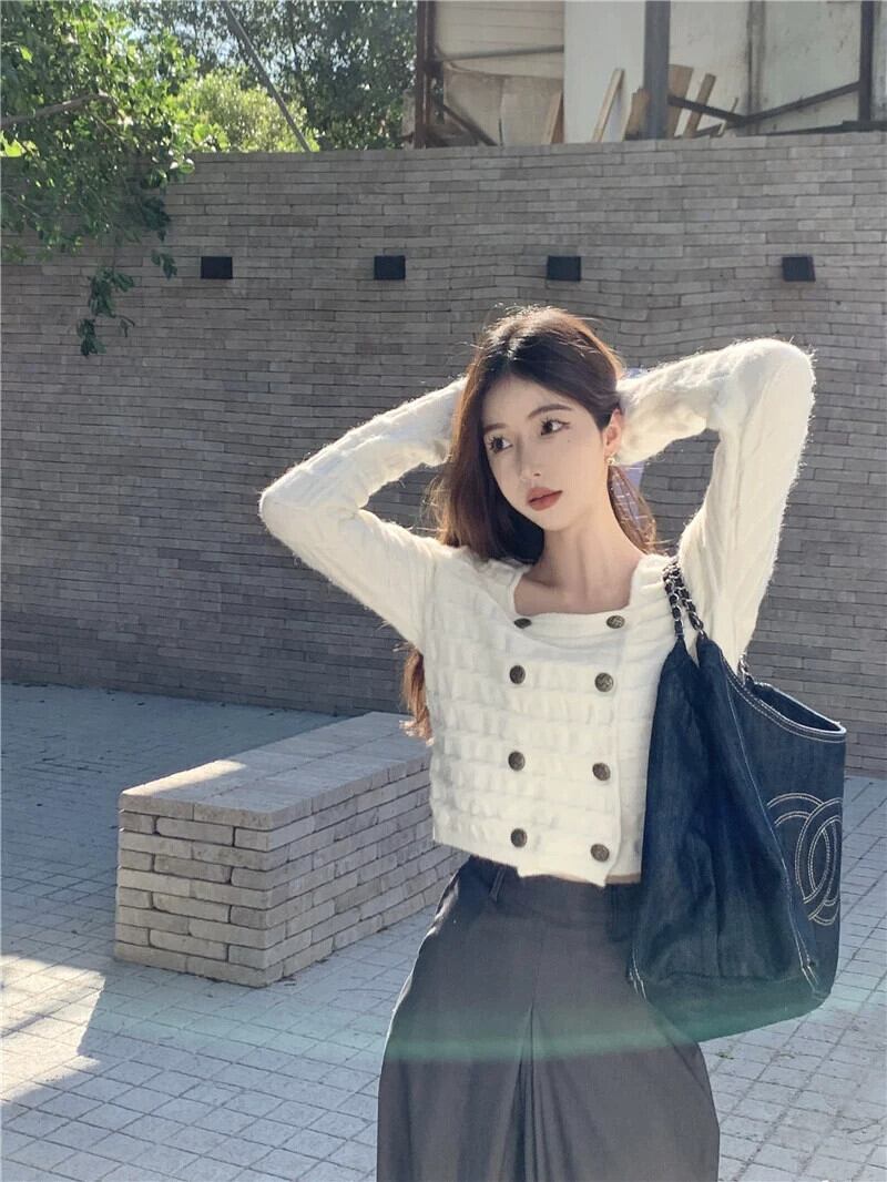 ダブルブレストのセーターの女性秋デザインニッチスクエアネックセーター 2023 新しいフレンチスタイルの優しいショートトップ オータム 秋物 スクウェア 8571660332697388