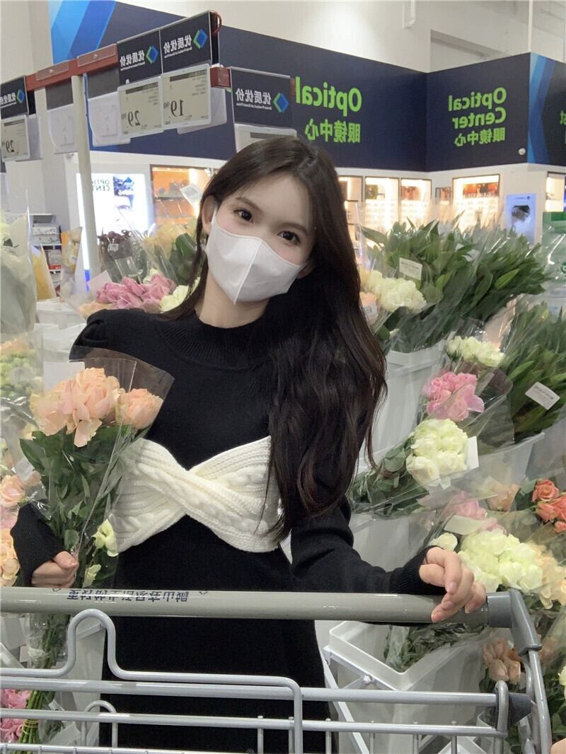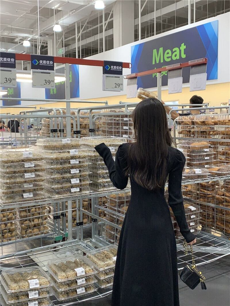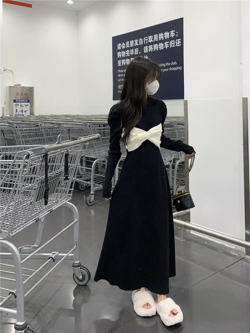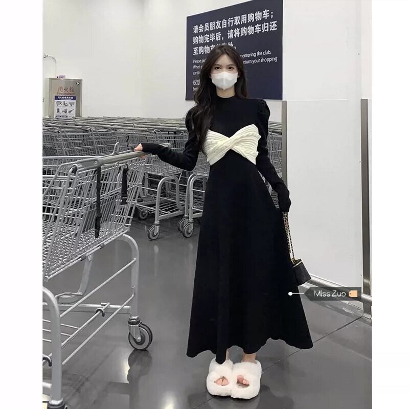 秋と冬のヘップバーンスタイルのニットドレスの女性、ハイエンドのレトロなパフスリーブとリボンウエストの痩身スカート オータム 秋物 ウィンター 冬物 8571634860654496