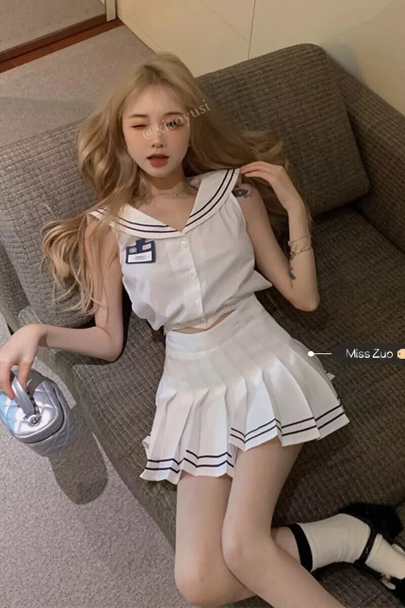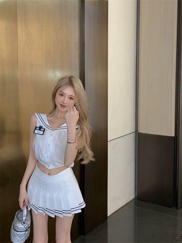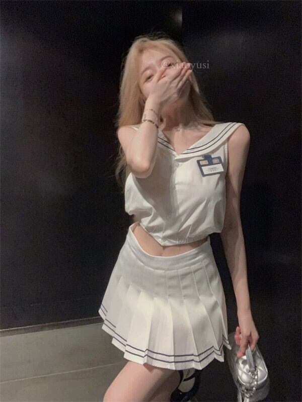 ネイビーカラーショートトップ女性の夏 2023 新しい甘いカレッジスタイルプチシックなユニークなノースリーブシャツ 大人ガーリー スウィート キュート カジュアル サマー 夏物 8571698429343453