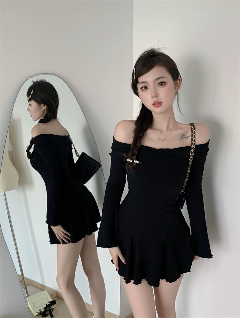 ワンショルダー長袖ドレスの女性 2023 秋の新リトルブラックドレス小さなウエスト痩身ショートスカート ロング オータム 秋物 857169947024194