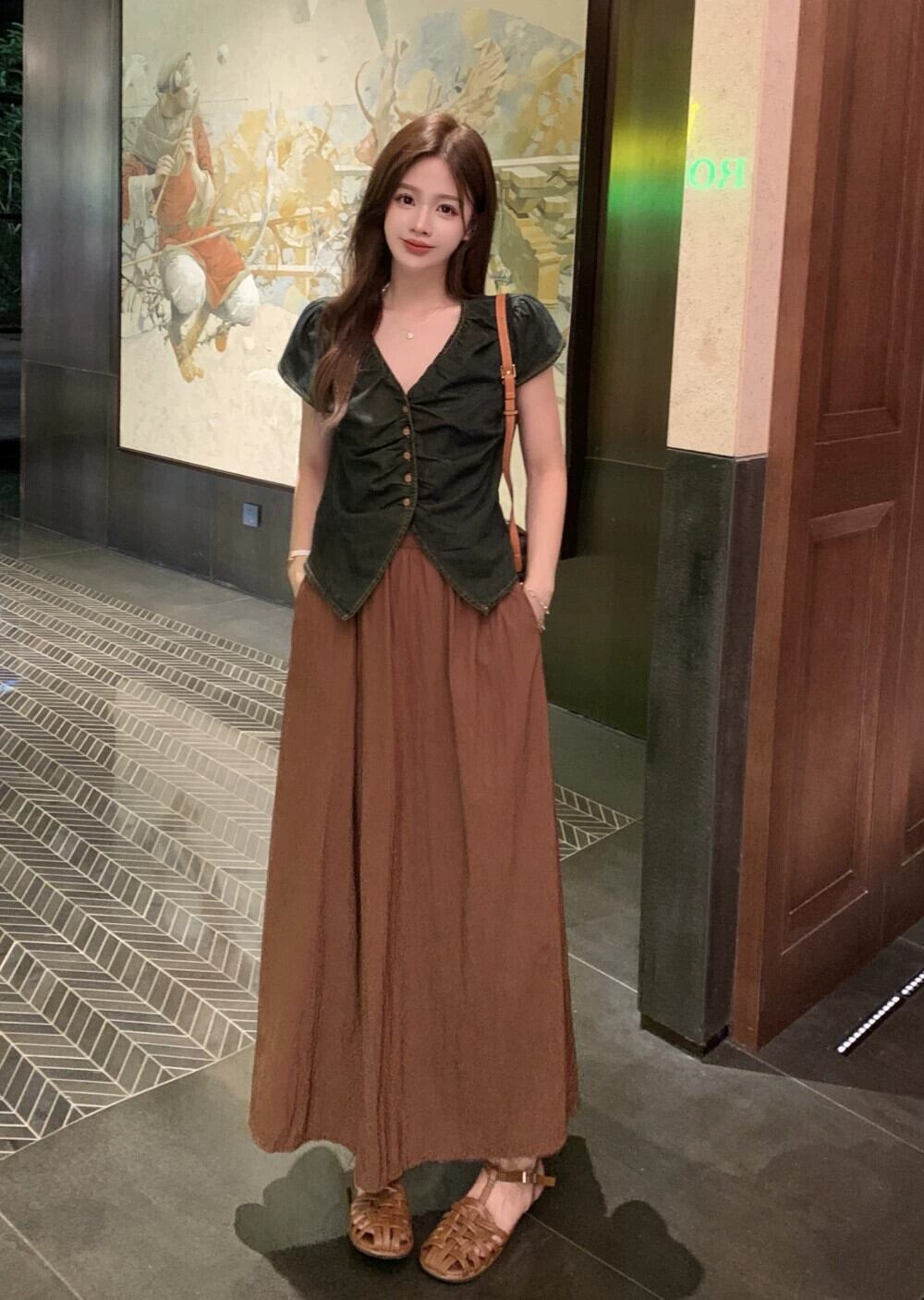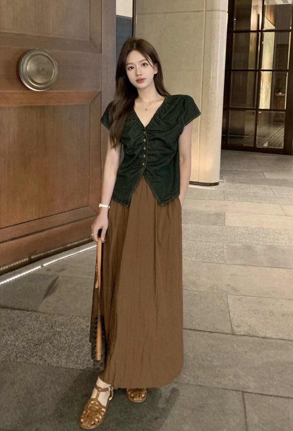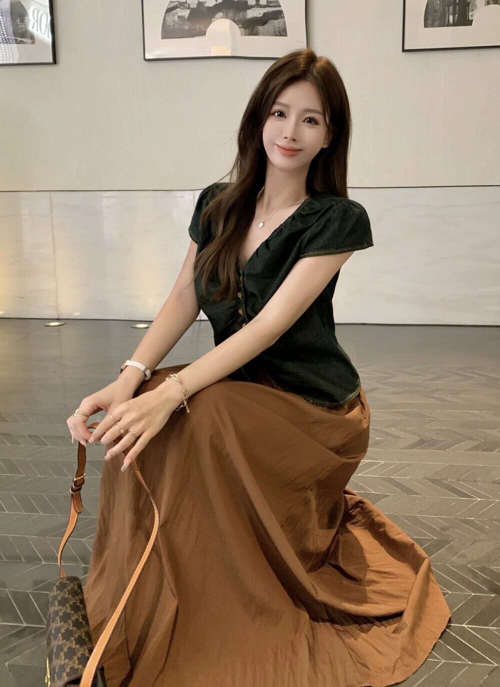 色:デニムシャツ,コーヒー色のスカート
