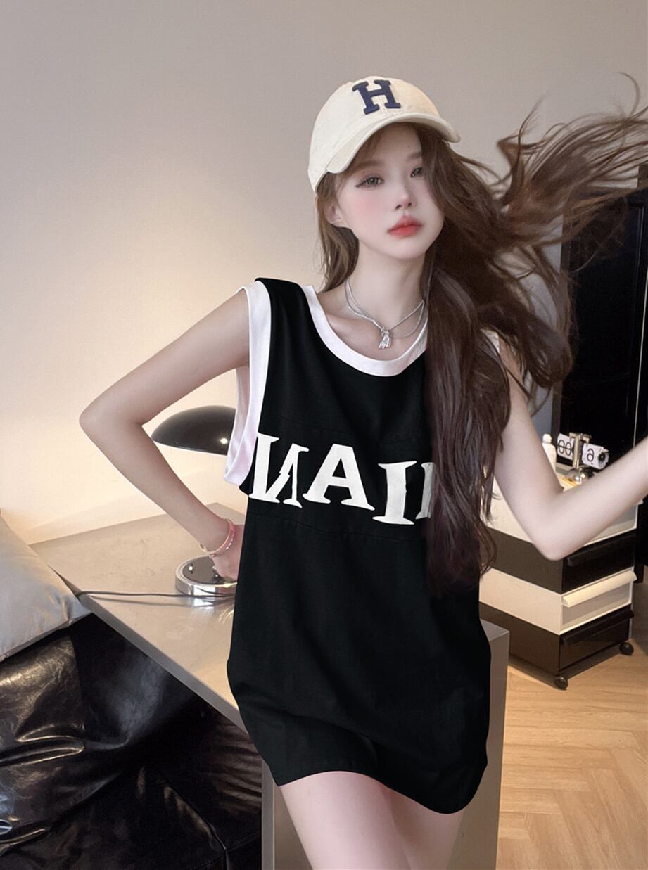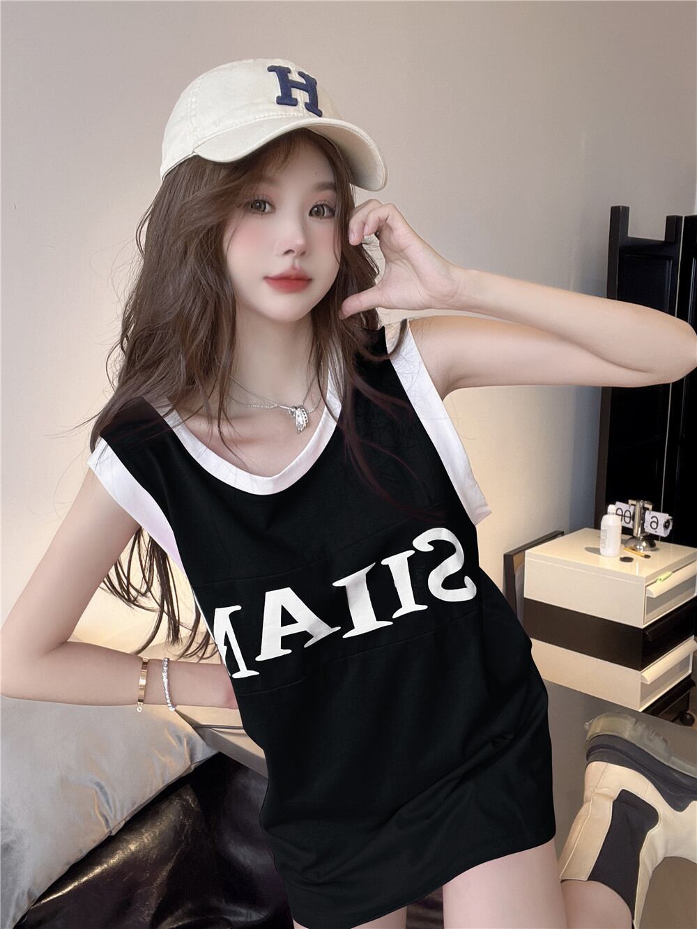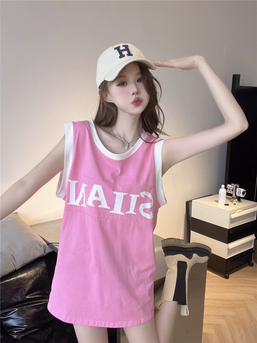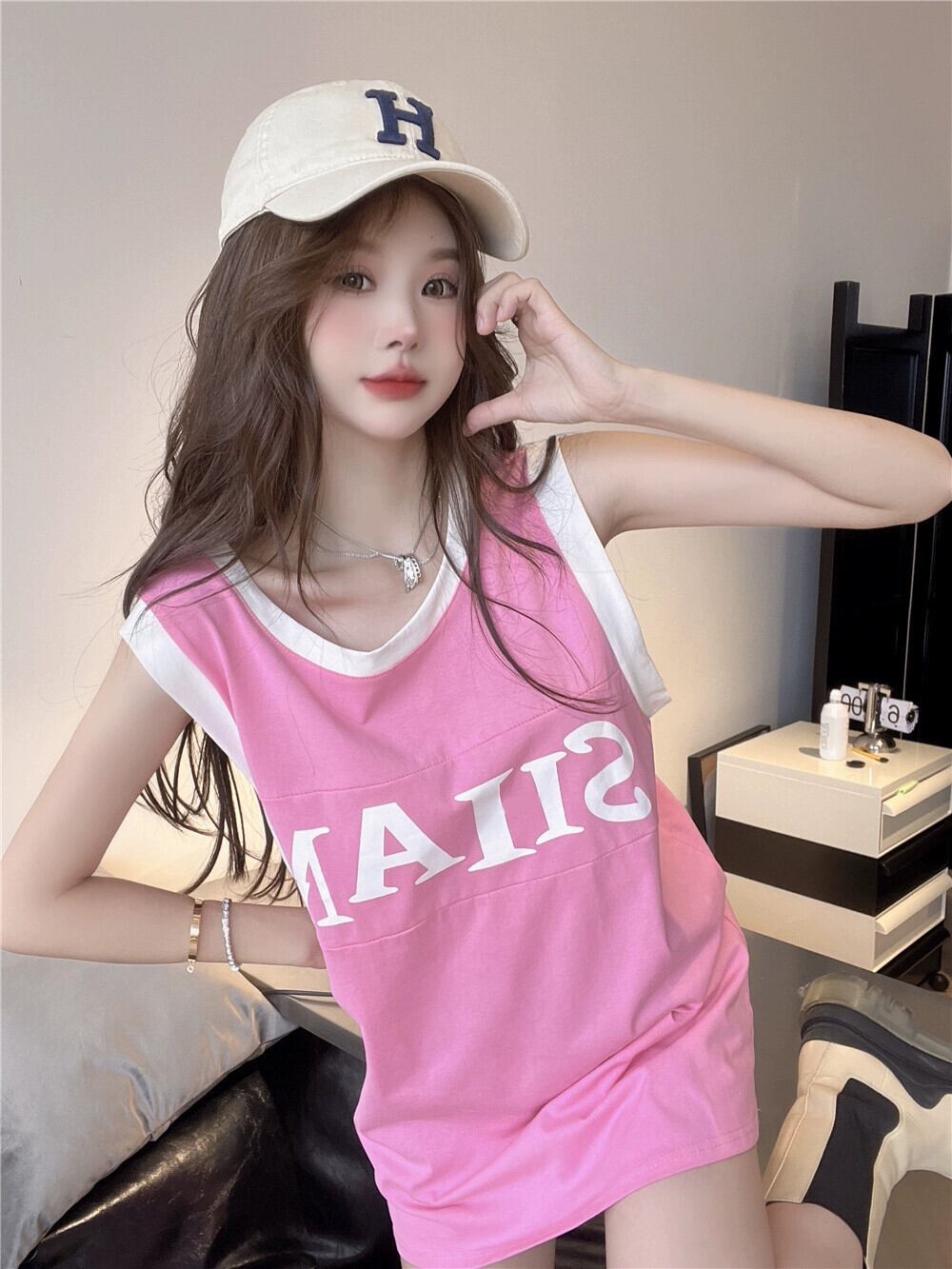 ピンク ノースリーブ Tシャツ ベスト レディース 夏 アメリカン レトロ スポーツ スタイル ミドル丈 ボトムス トップが欠けています サマー 夏物 8571675838553623