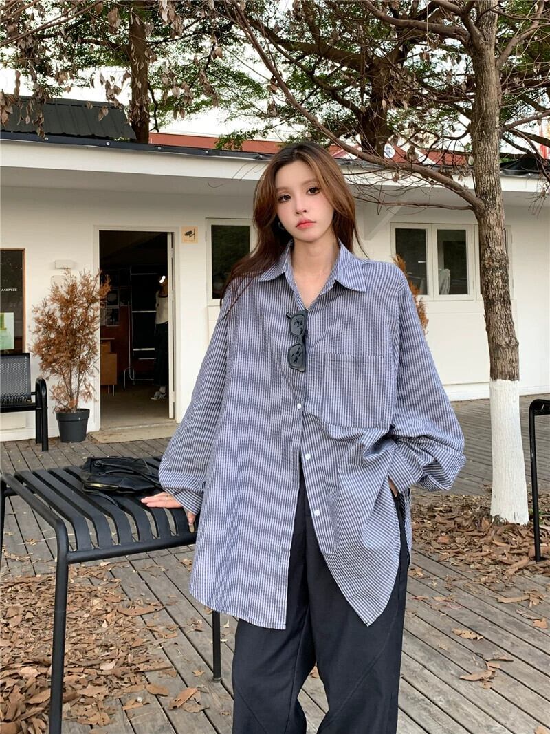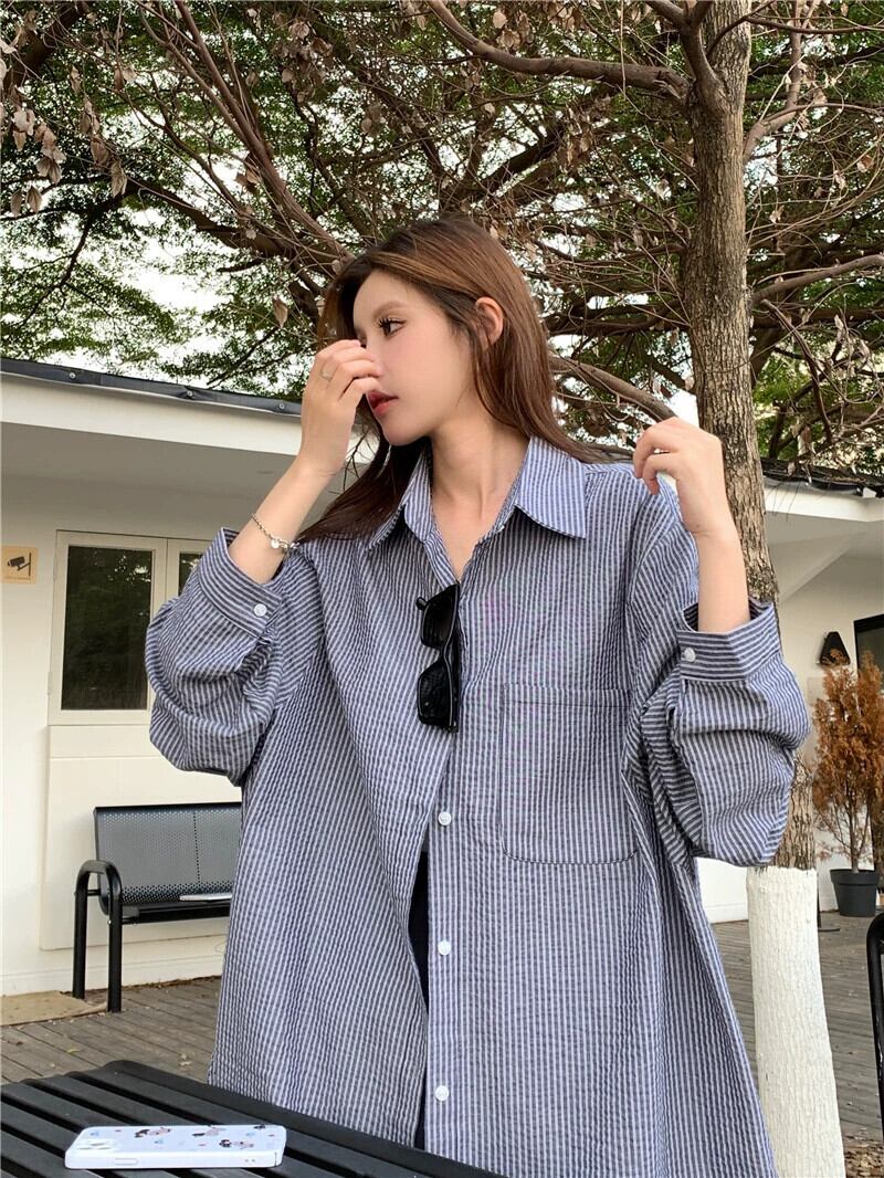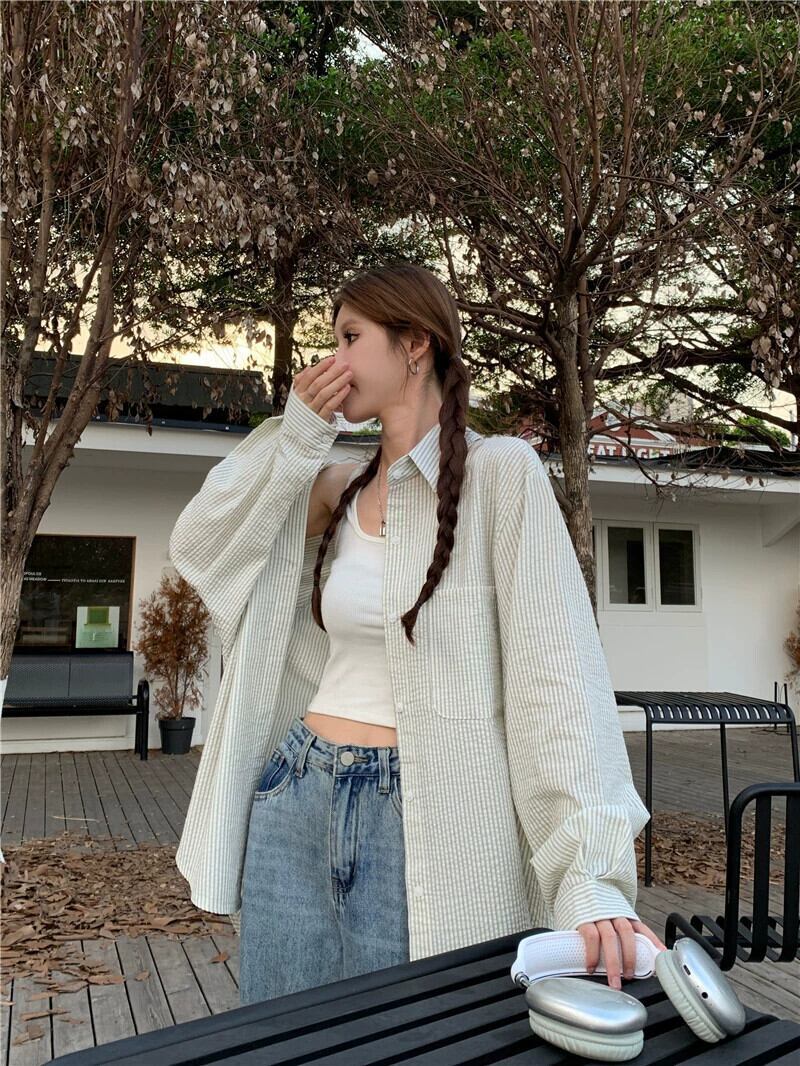 グリーンストライプシャツジャケット女性 2023 秋の新ミッドレングスシャツルーズ BF 怠惰なスタイル長袖トップ ロング オータム 秋物 8571664817465354