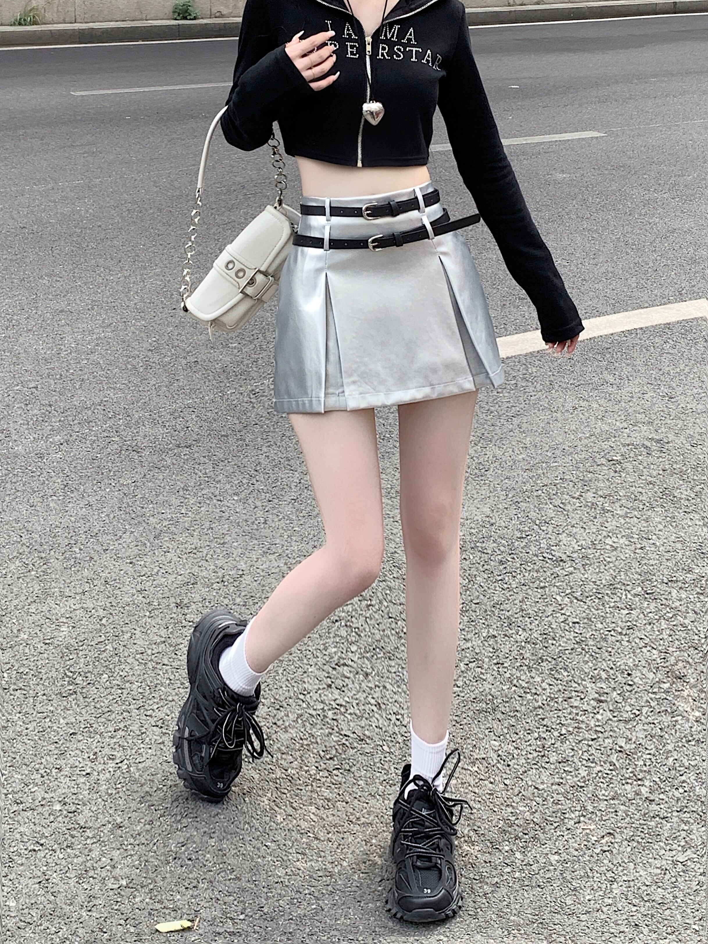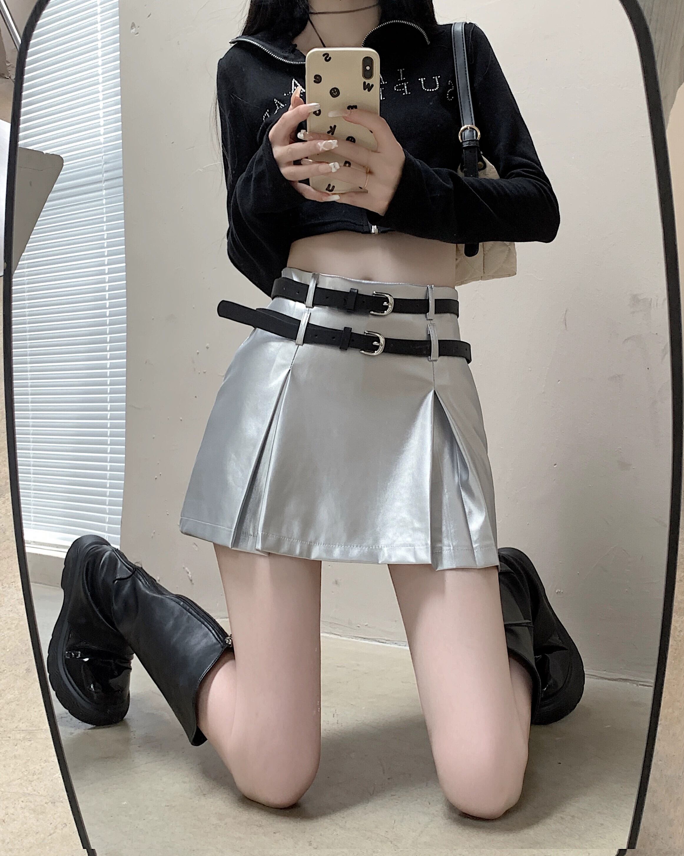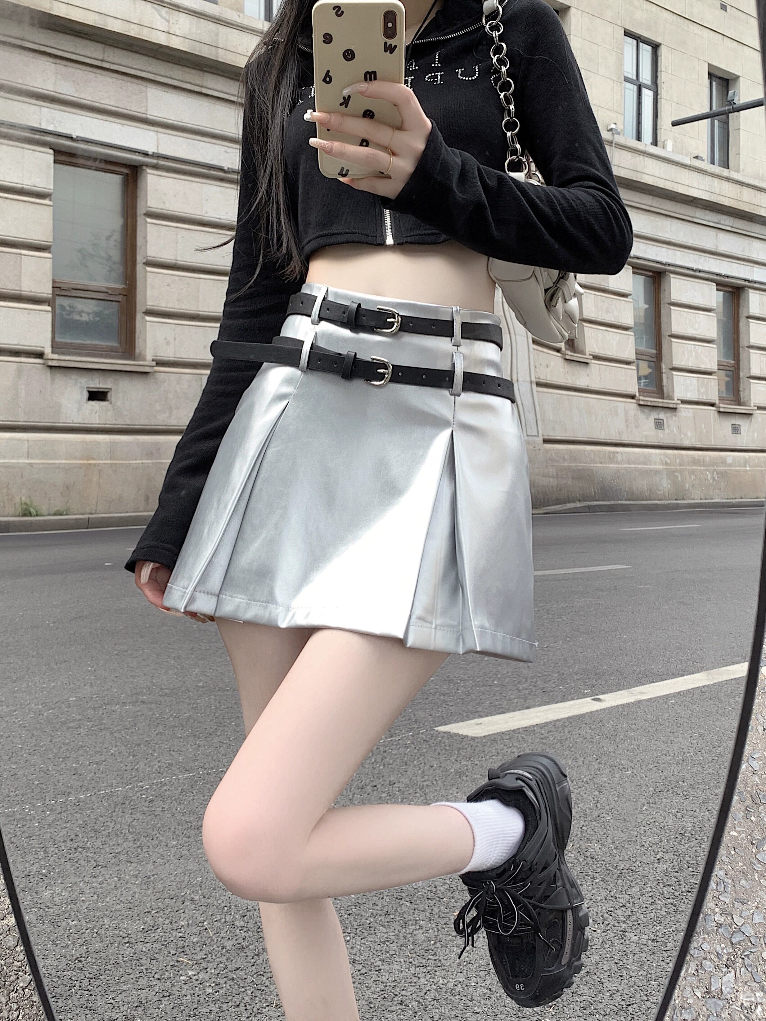 シルバー PU レザースカートスカート女性秋 2023 新デザイン小さなハイウエスト A ラインショートスカート ハイウェスト オータム 秋物 Aライン 銀 8571670844555942