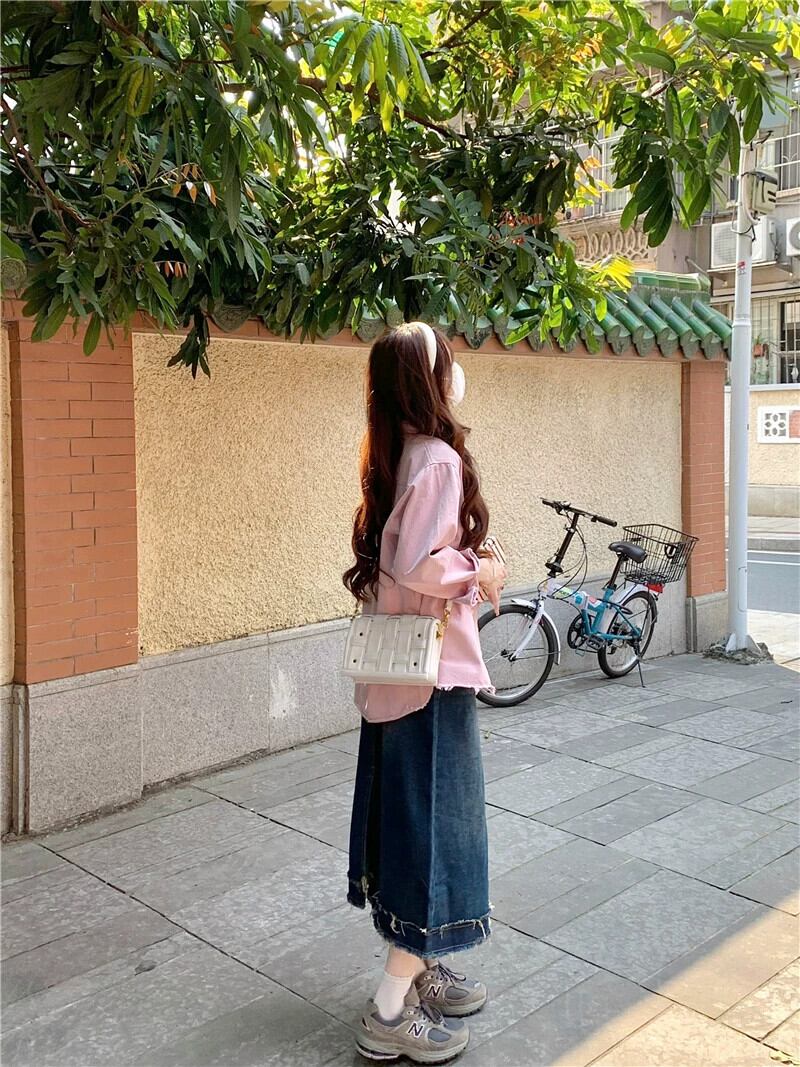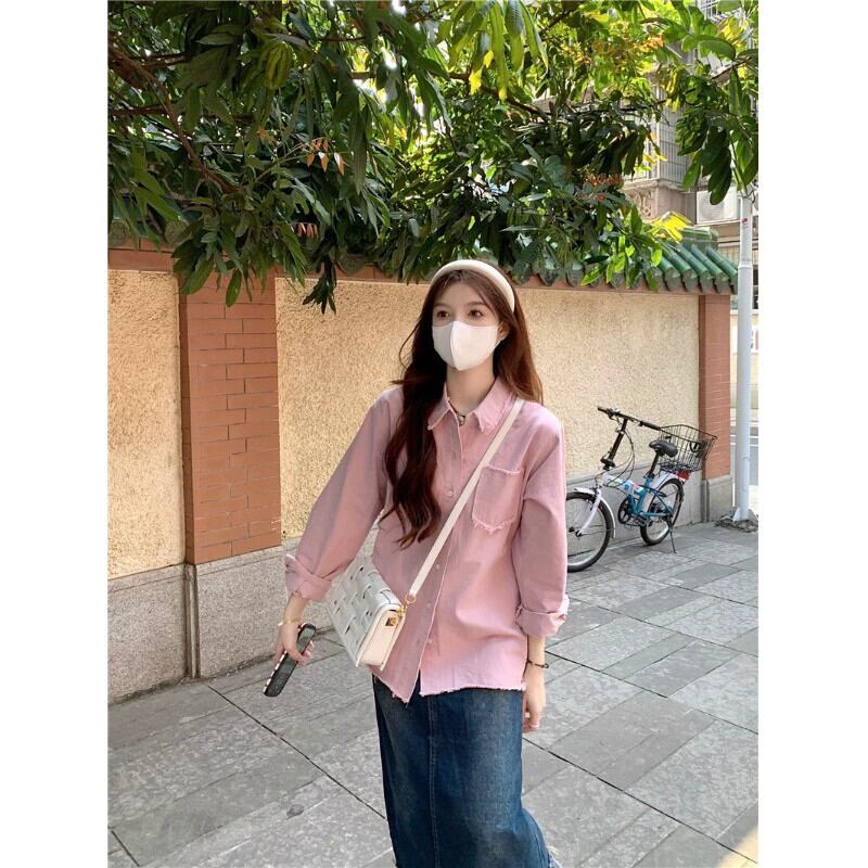 ピンクローエッジシャツジャケット女性の 2023 秋の新作長袖シャツ香港スタイルのレトロシックなルーズトップ ロング オータム 秋物 8571690710606879