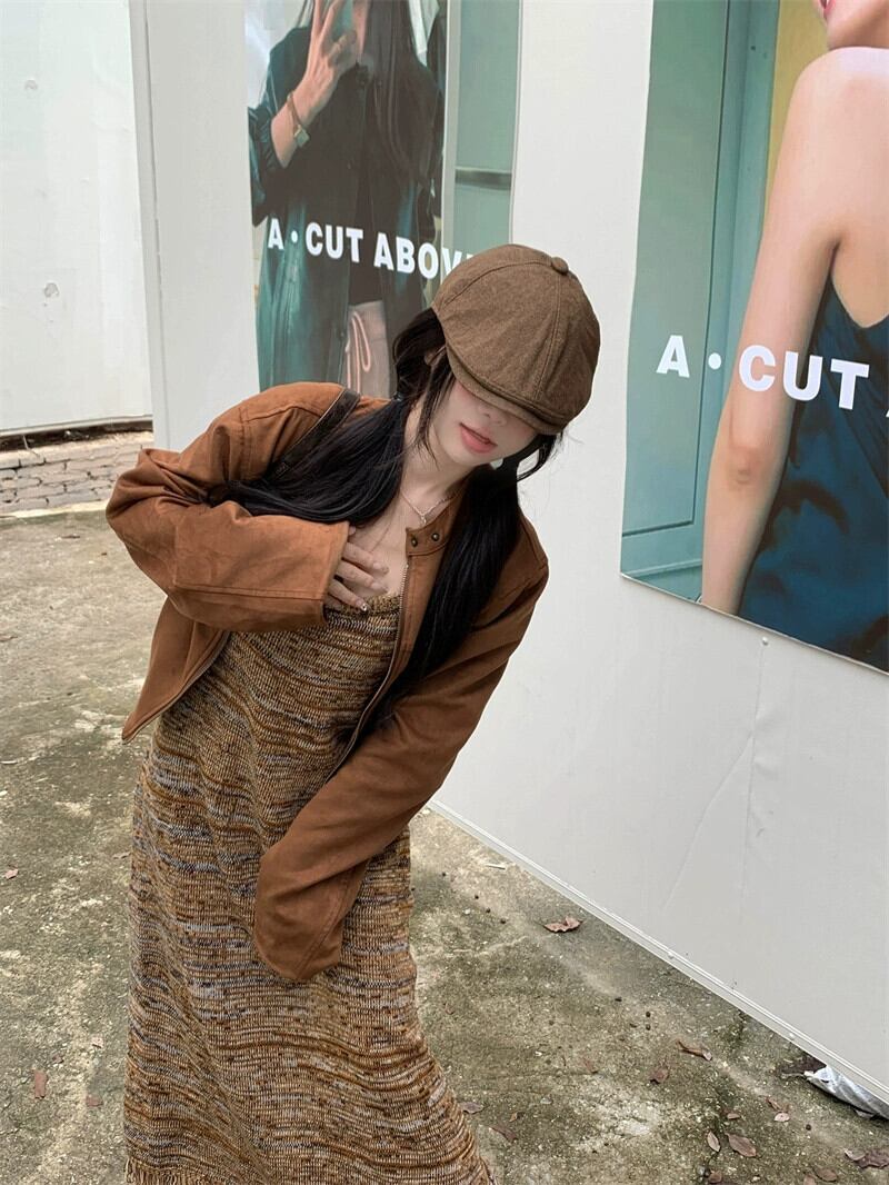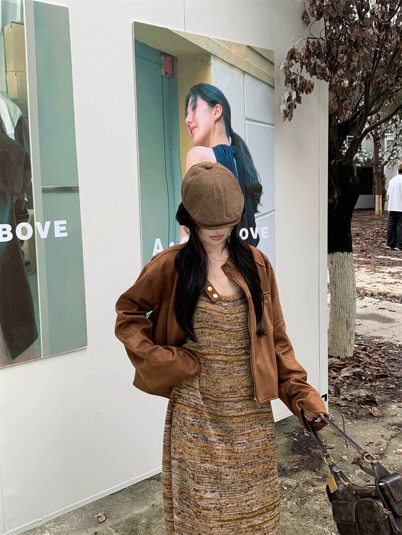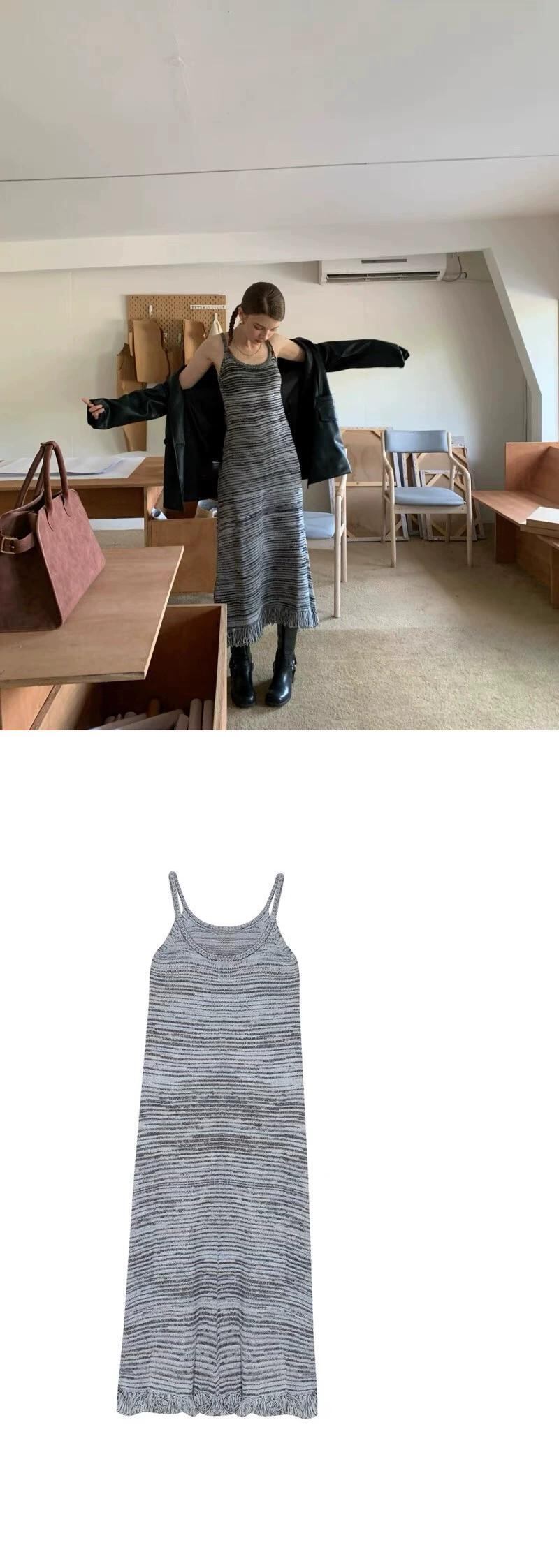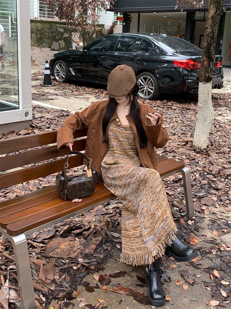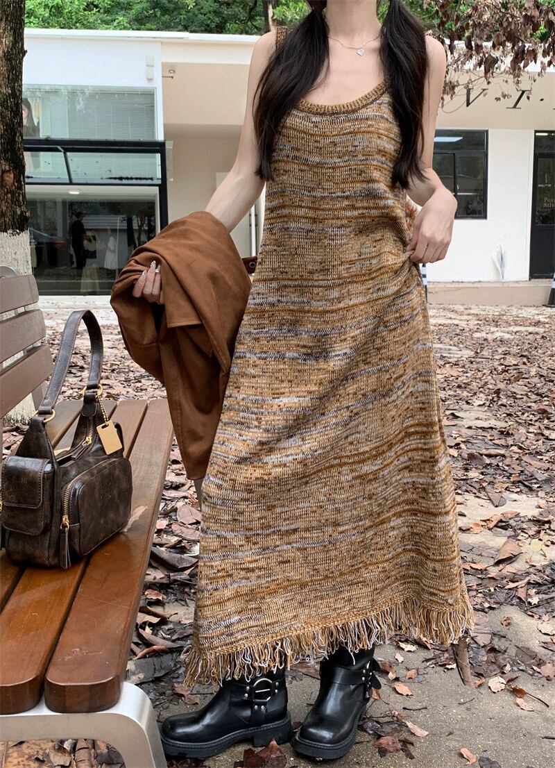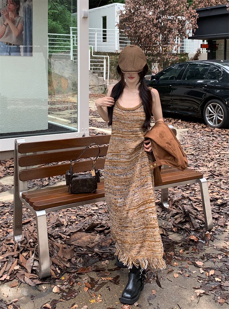 ニットサスペンダードレスの女性、秋のメイラードウェア、2023新しいレトロなインナーボトムフリンジ付きロングスカート オータム 秋物 8571646542037853