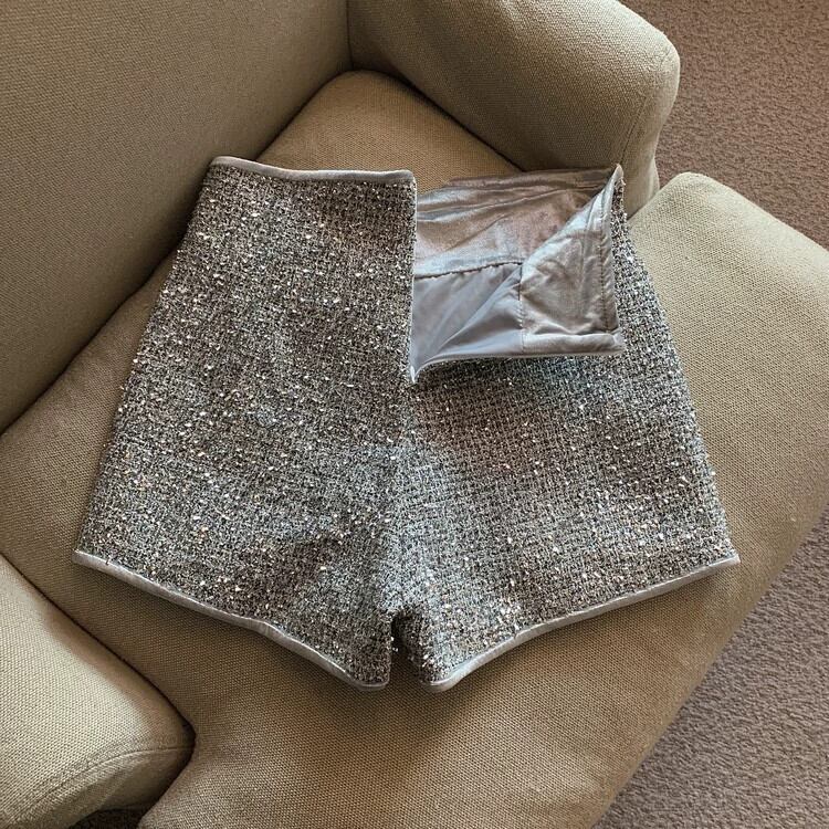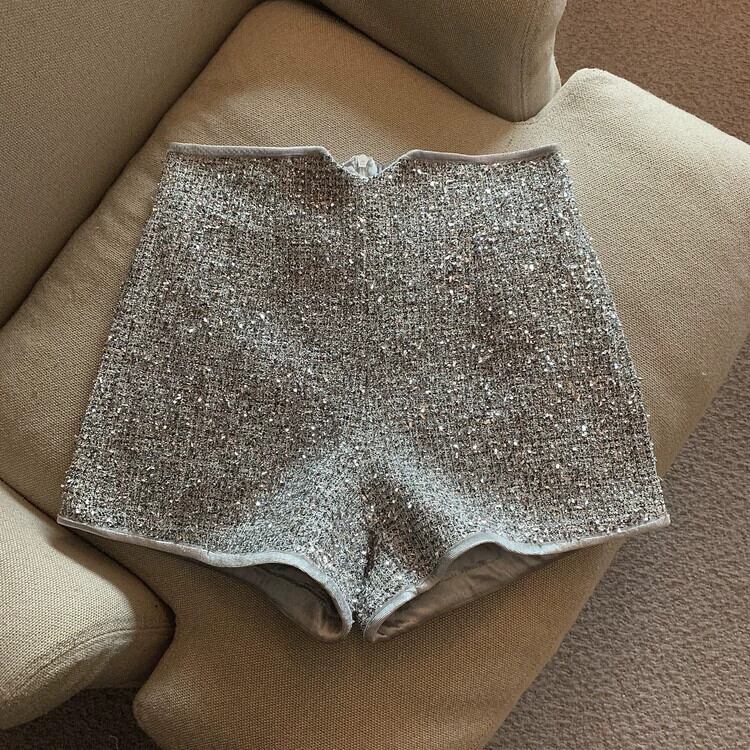 シルバーのスパンコール付き A ライン ショーツ レディース 夏外で着用 2023 新しいハイウエスト ストレート パンツ 小柄な人、カジュアルで多用途 サマー 夏物 ブルマー Aライン 銀 8571651809999967
