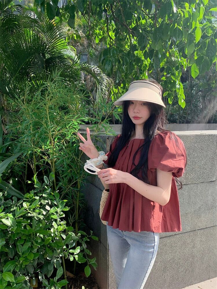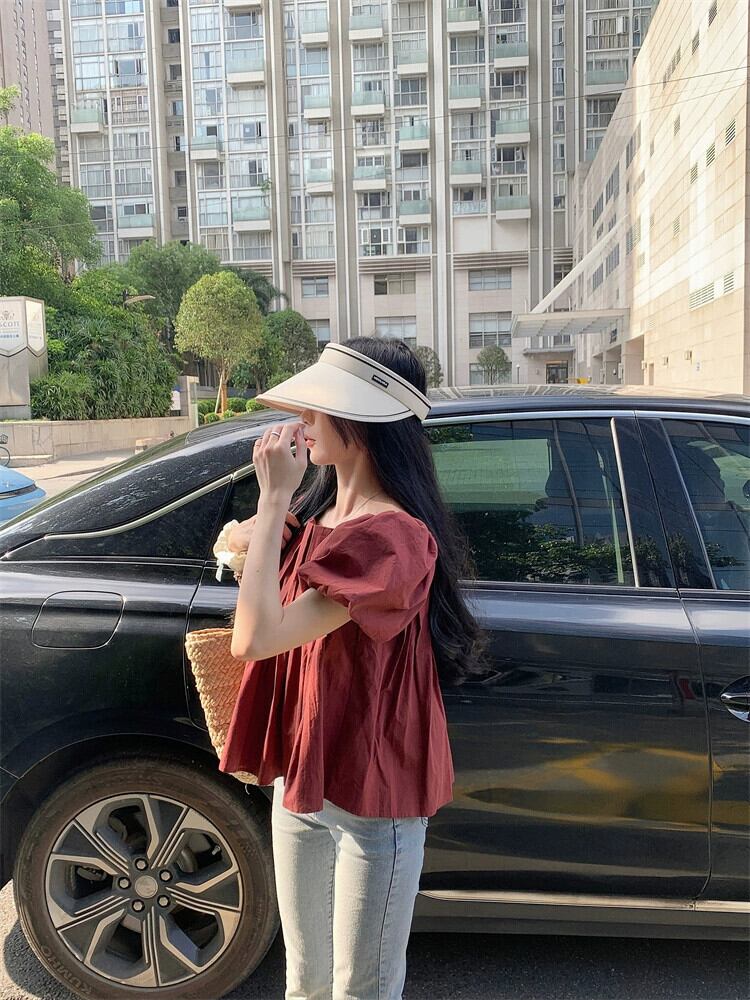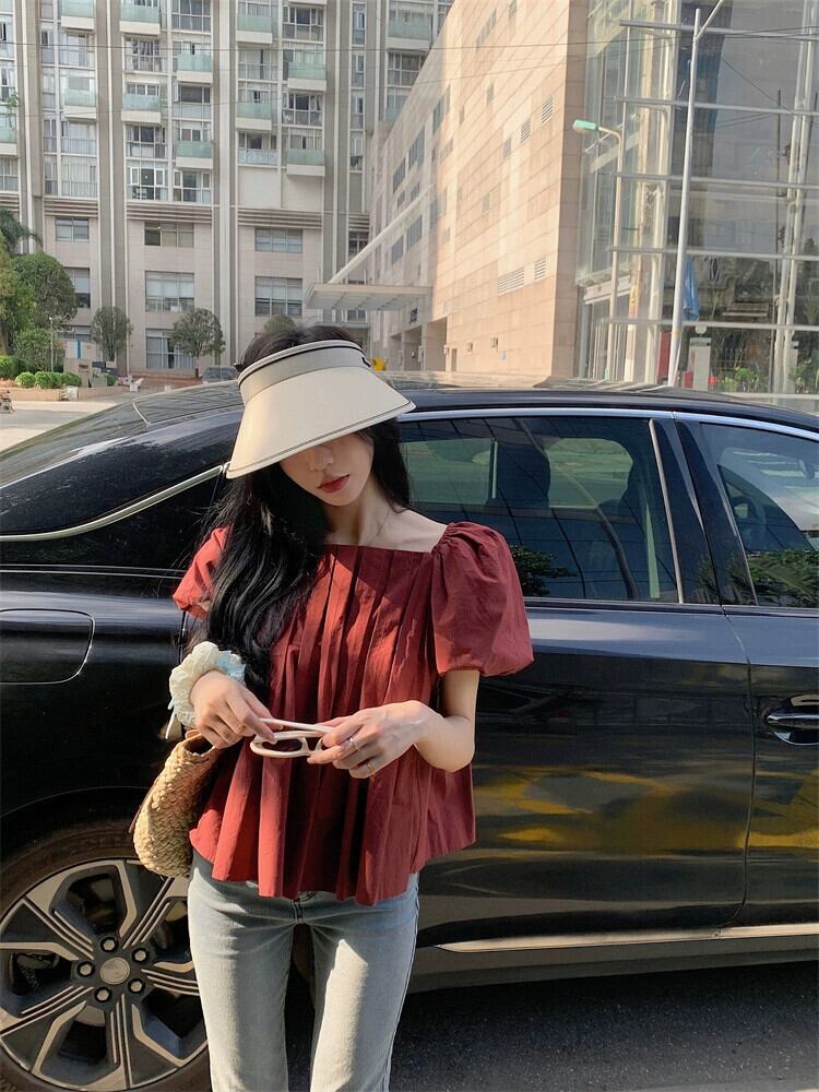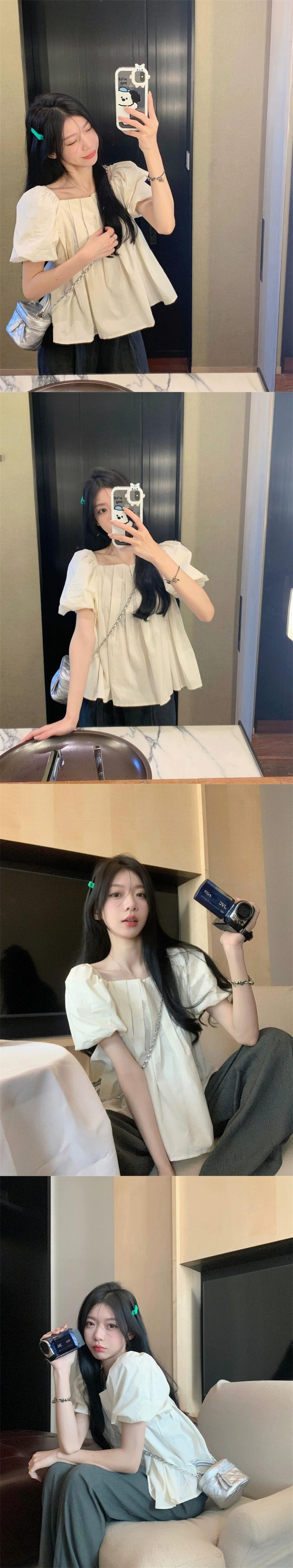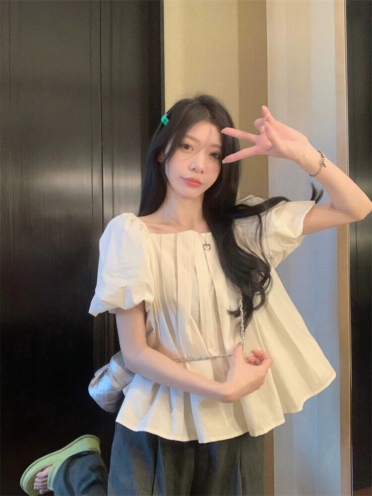 ベビードールスクエアカラートップ女性の夏 2023 新しいスタイルフレンチ優しい腹カバーバーガンディパフ半袖シャツ サマー 夏物 スクウェア 8571614157541658