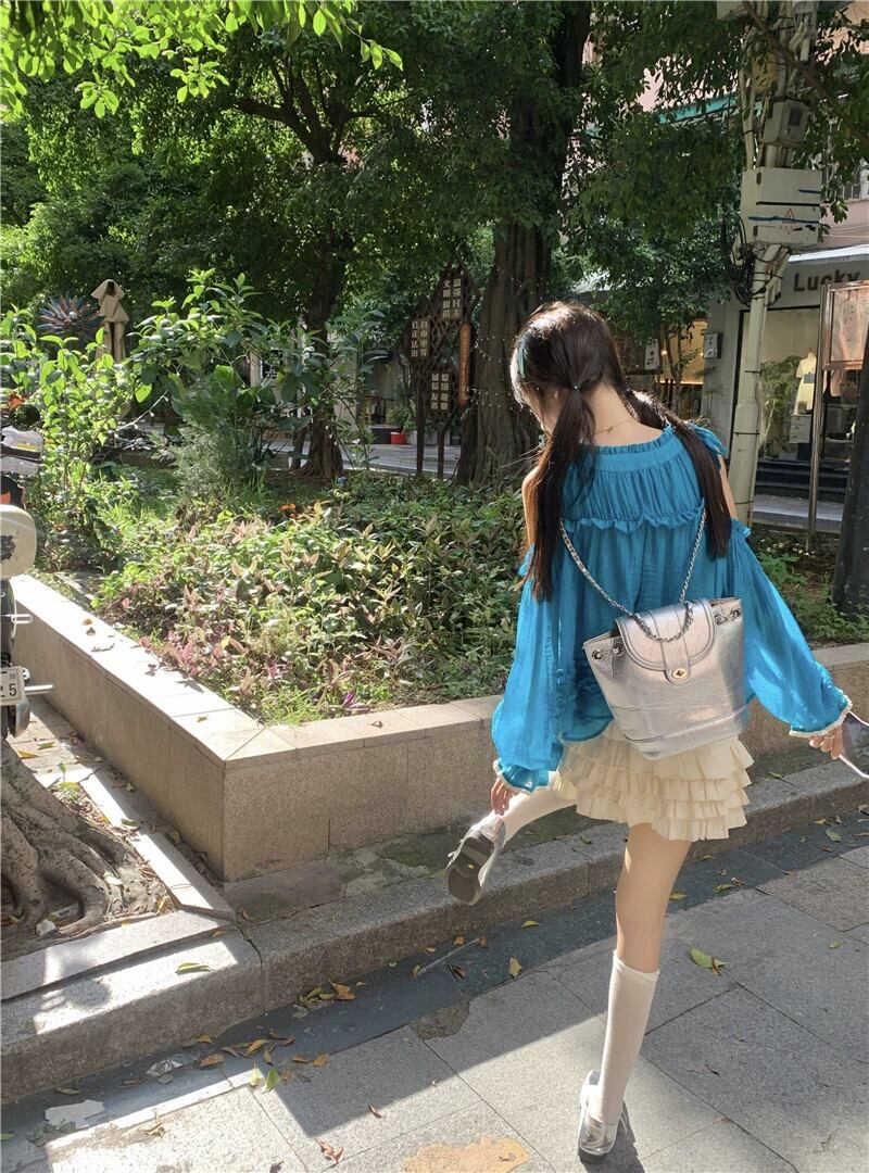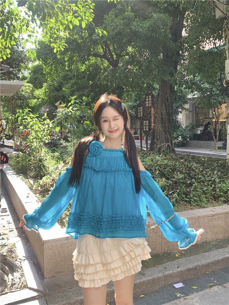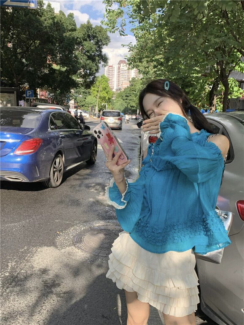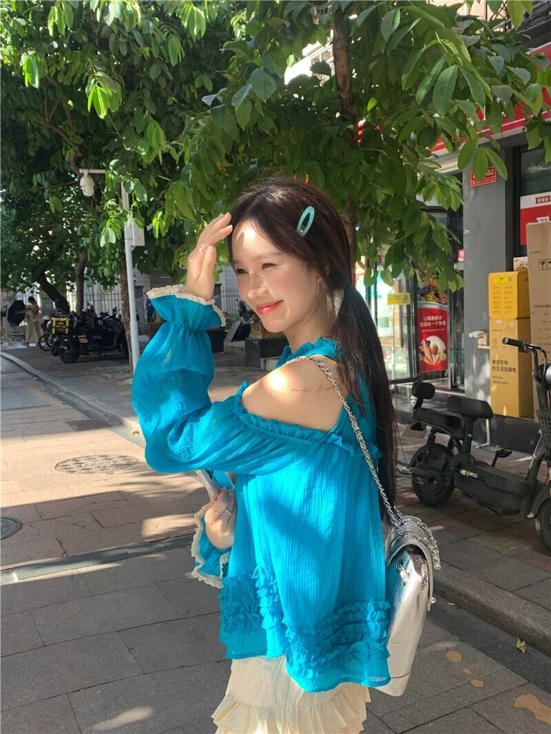 ホルターネックオフショルダートップ女性の夏のドーパミンウェア2023新しい甘くてスタイリッシュな年齢を減らす青い長袖シャツ ロング ブルー 大人ガーリー スウィート キュート カジュアル サマー 夏物 8571684203651363