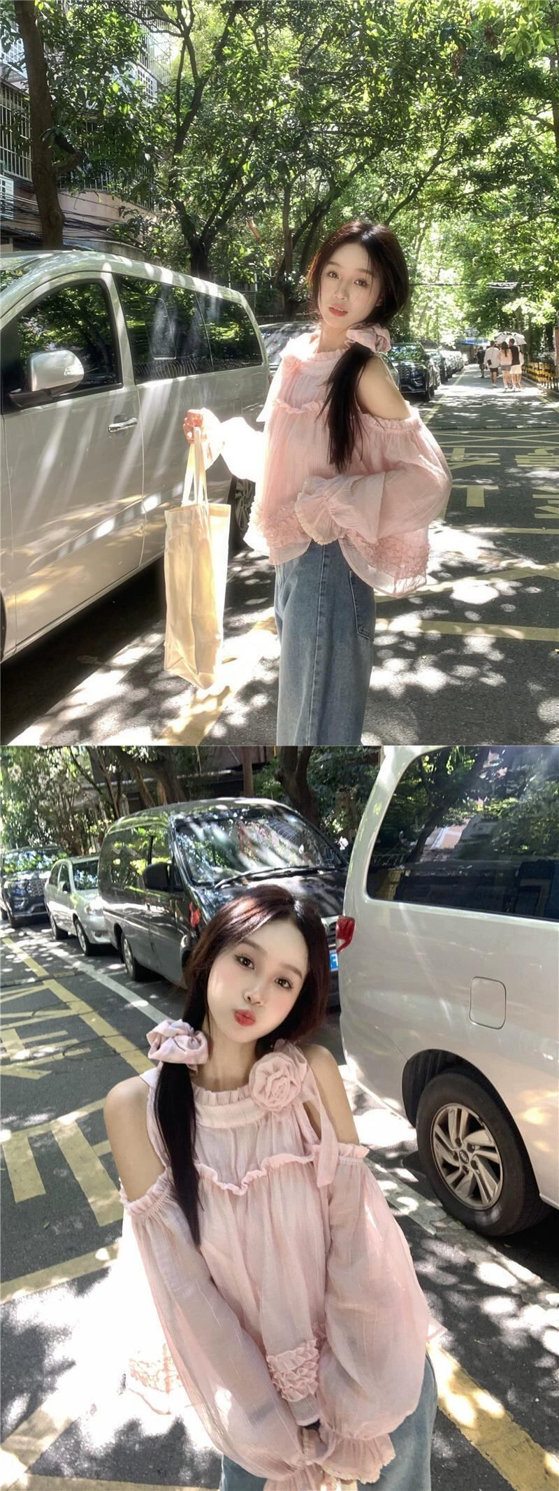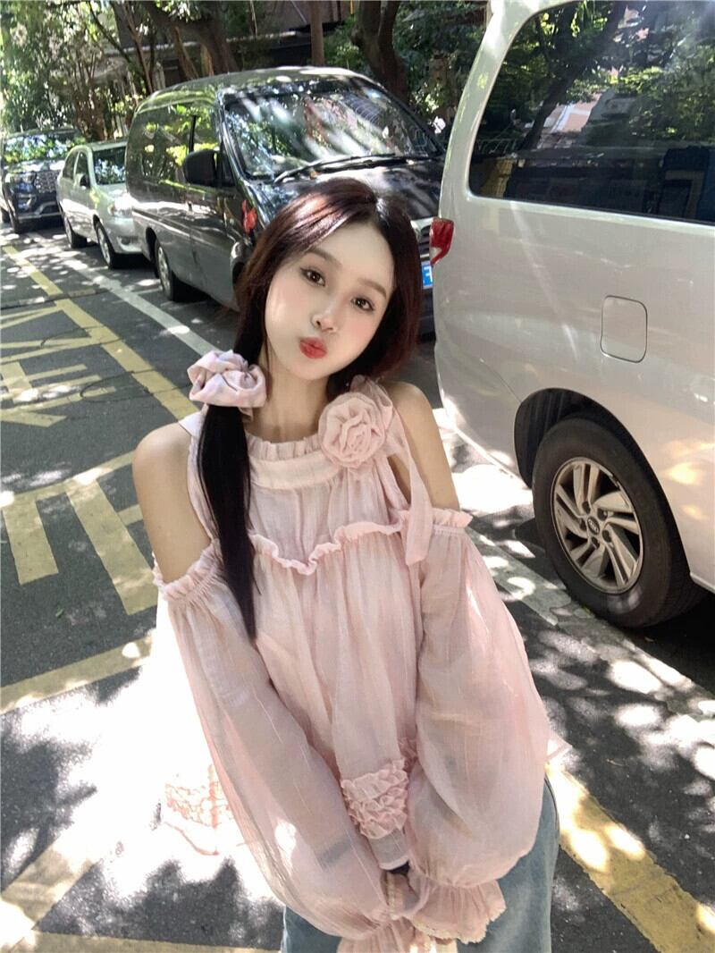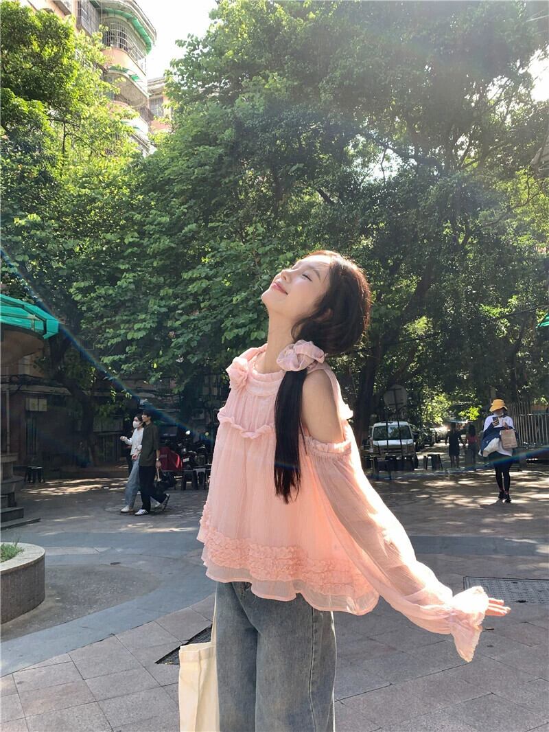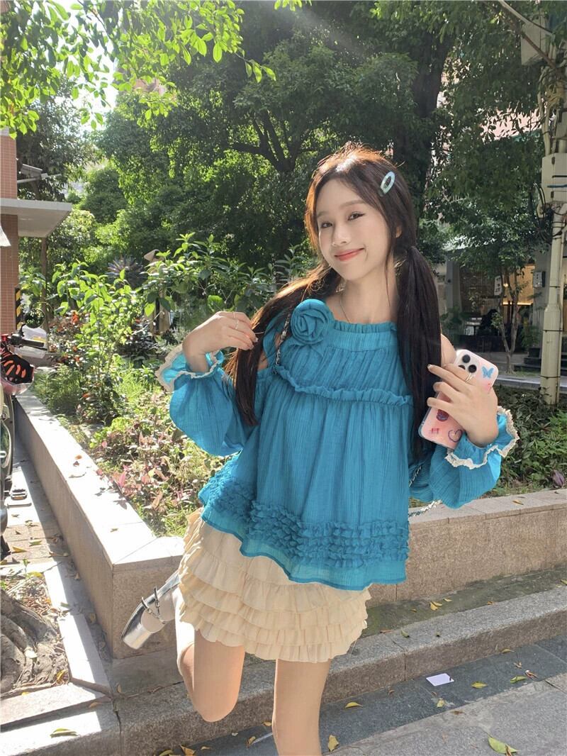 ホルターネックオフショルダートップ女性の夏のドーパミンウェア2023新しい甘くてスタイリッシュな年齢を減らす青い長袖シャツ ロング ブルー 大人ガーリー スウィート キュート カジュアル サマー 夏物 8571684203651363