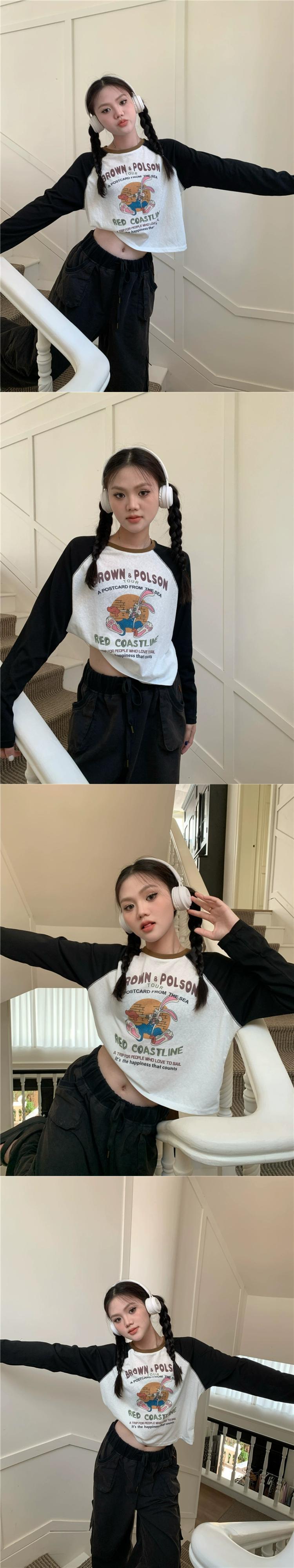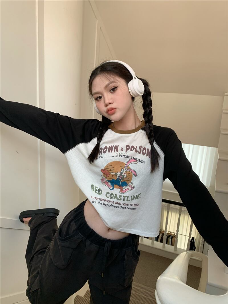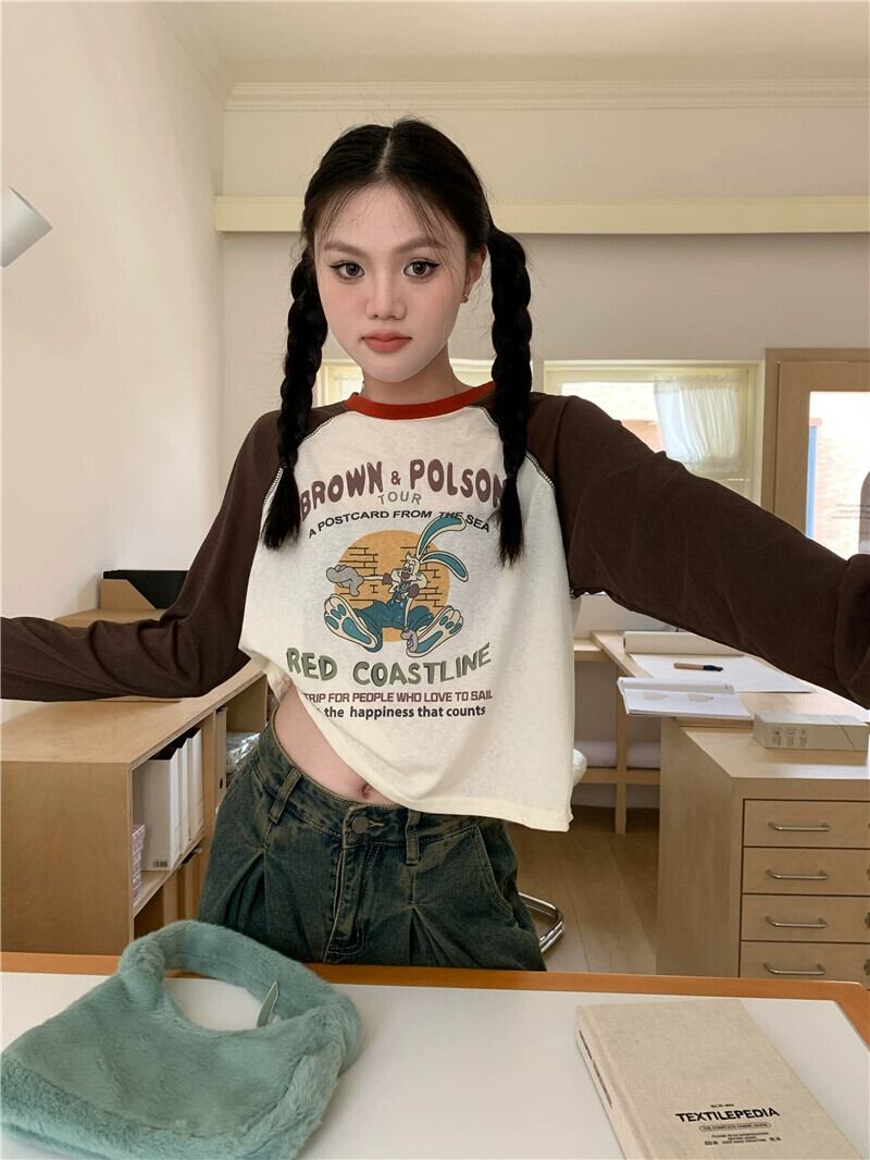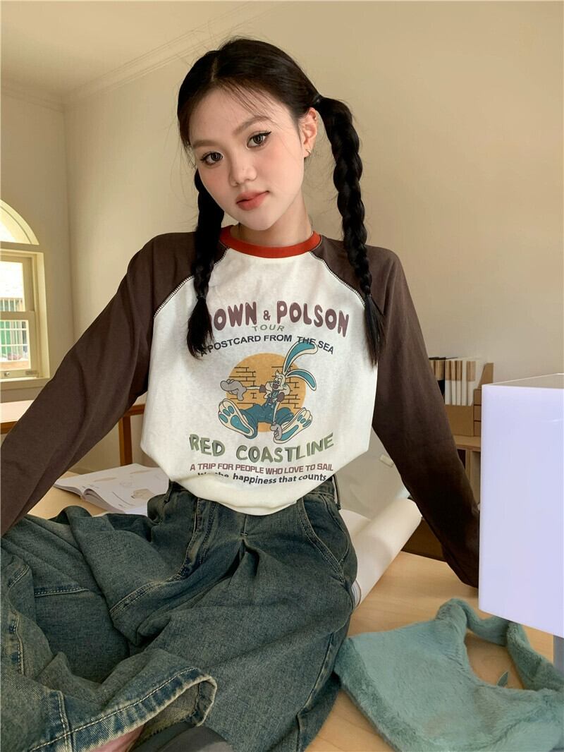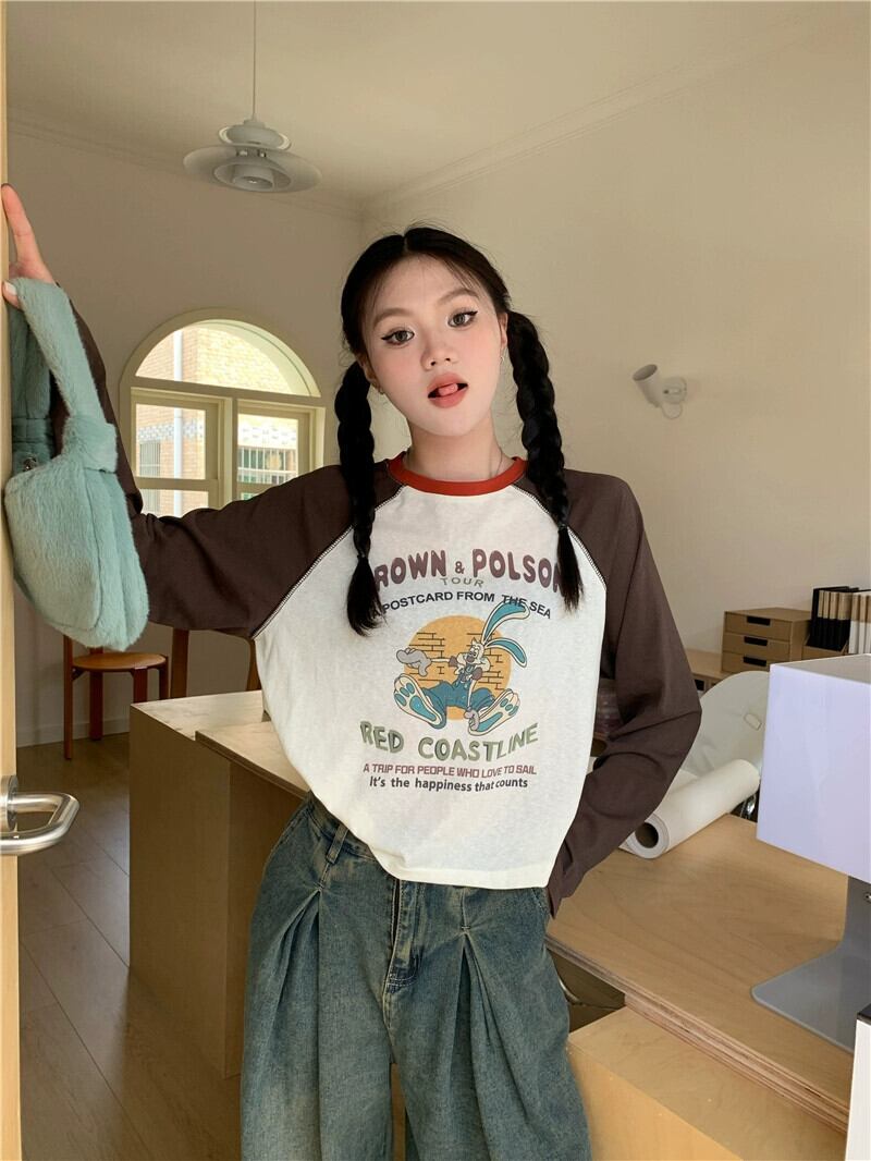 コントラストカラーラグラン長袖 Tシャツ女性の 2023 秋の新アメリカンレトロ小人漫画プリント上部服 ロング オータム 秋物 8571623904339456