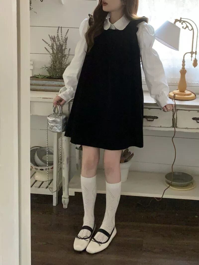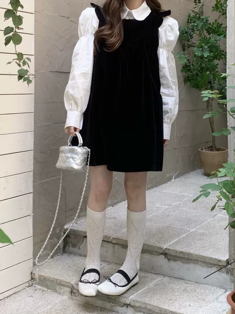 色:白い人形の襟のシャツ,ブラックレースサスペンダースカート