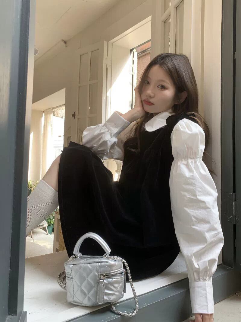 秋の黒のサスペンダードレスの女性、ニッチなデザイン、セクシーな胸、ふふ、甘い、お腹カバー、年齢を減らすスカート ブラック 大人ガーリー スウィート キュート カジュアル オータム 秋物 8571666316248355