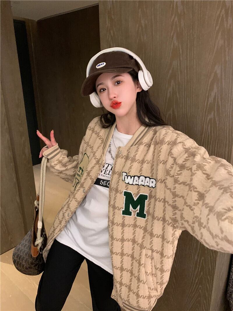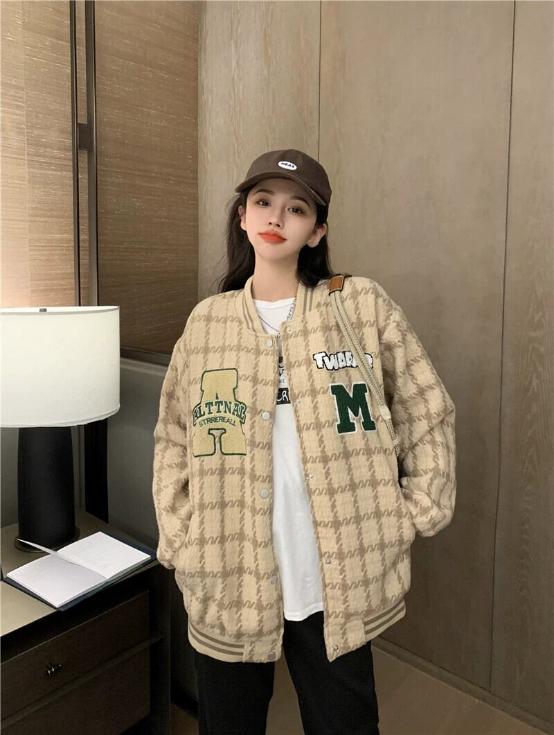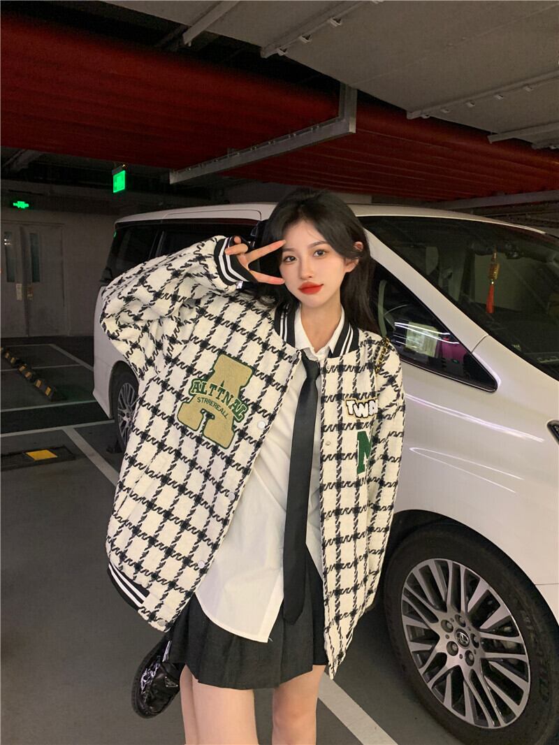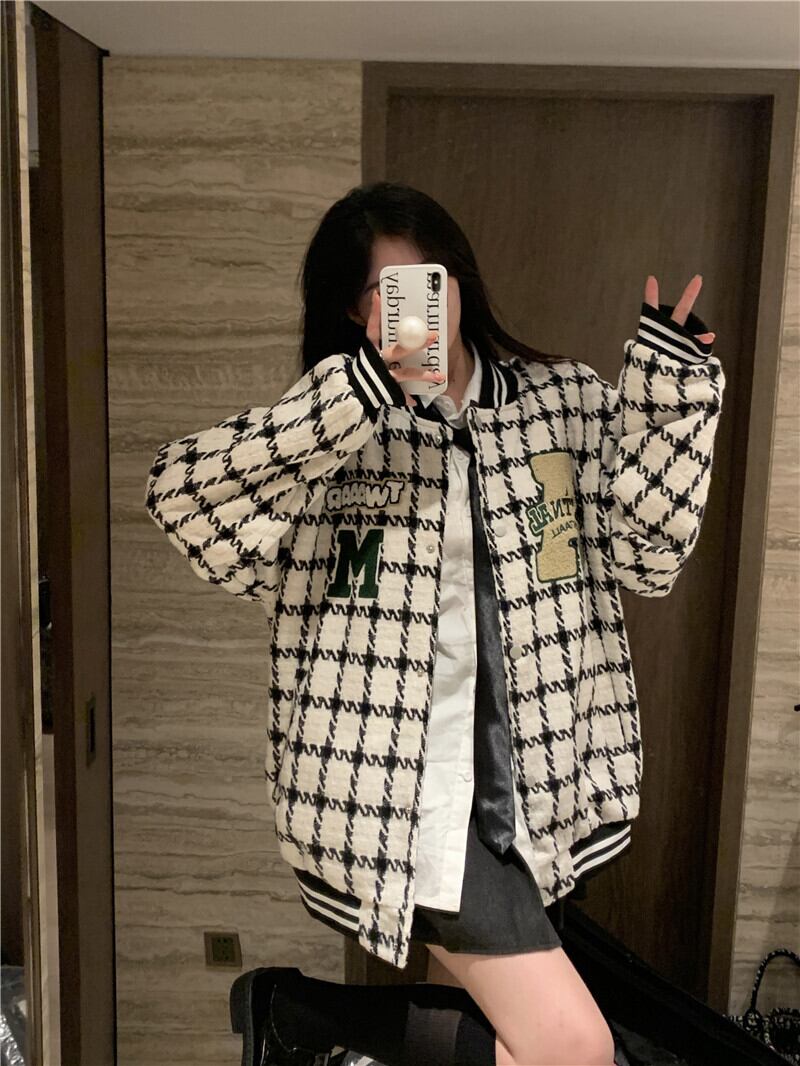 チェック柄ベースボールジャケット レディース 2023 秋 アメリカン レトロ トレンディ ルーズ レイジー スタイル ジャケット トップ オータム 秋物 8571613606161747