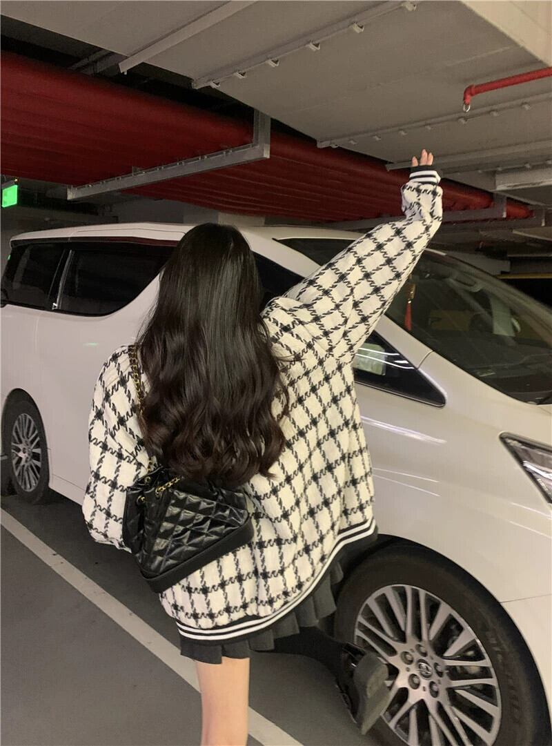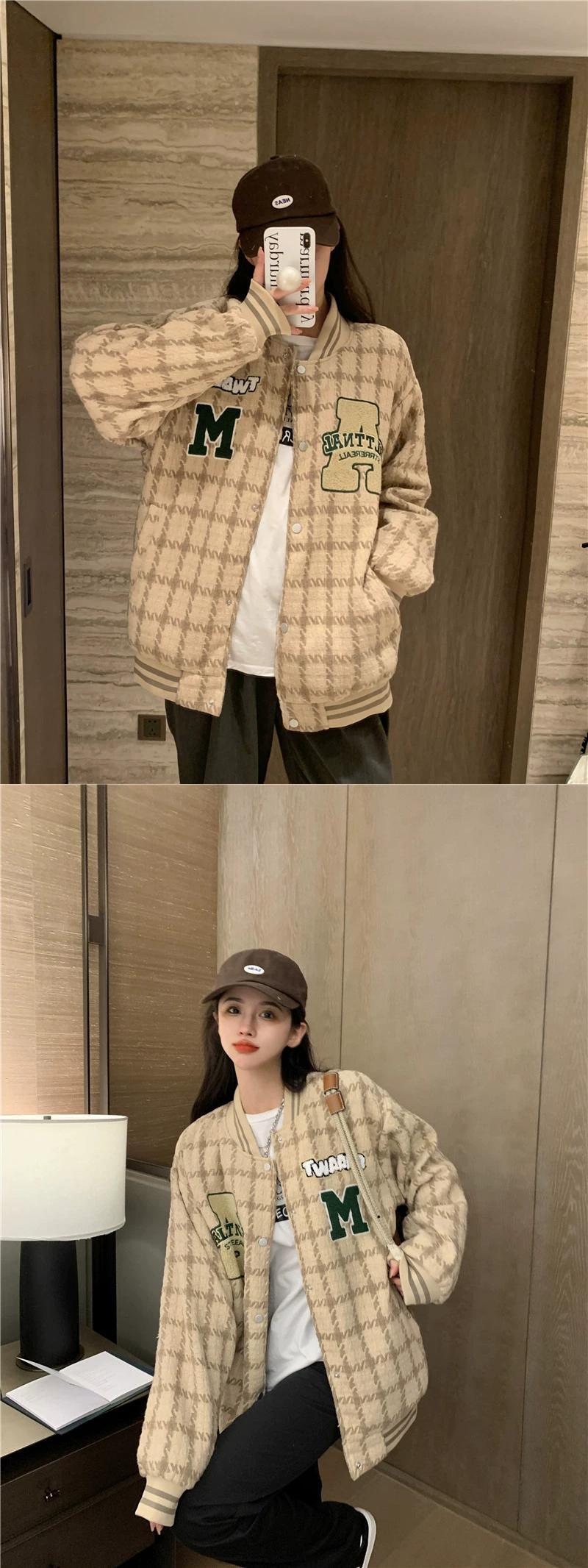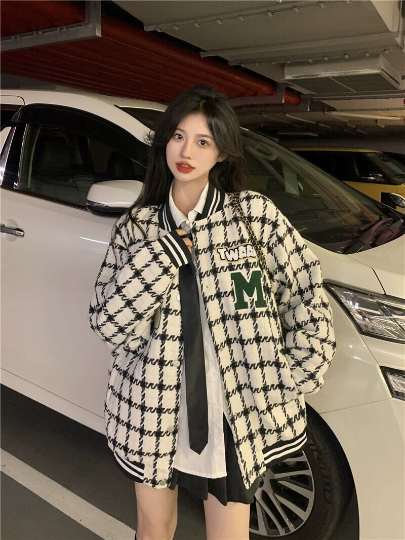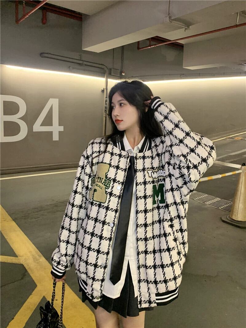 チェック柄ベースボールジャケット レディース 2023 秋 アメリカン レトロ トレンディ ルーズ レイジー スタイル ジャケット トップ オータム 秋物 8571613606161747