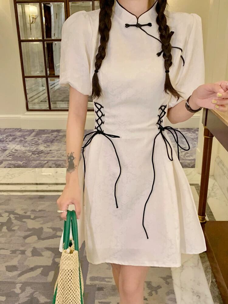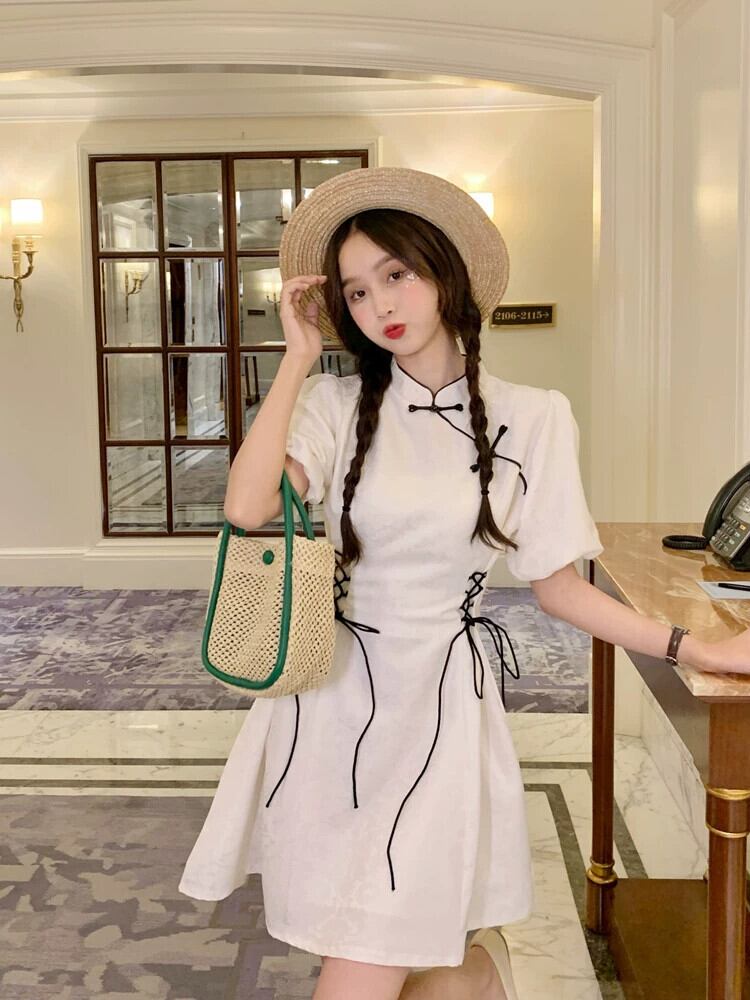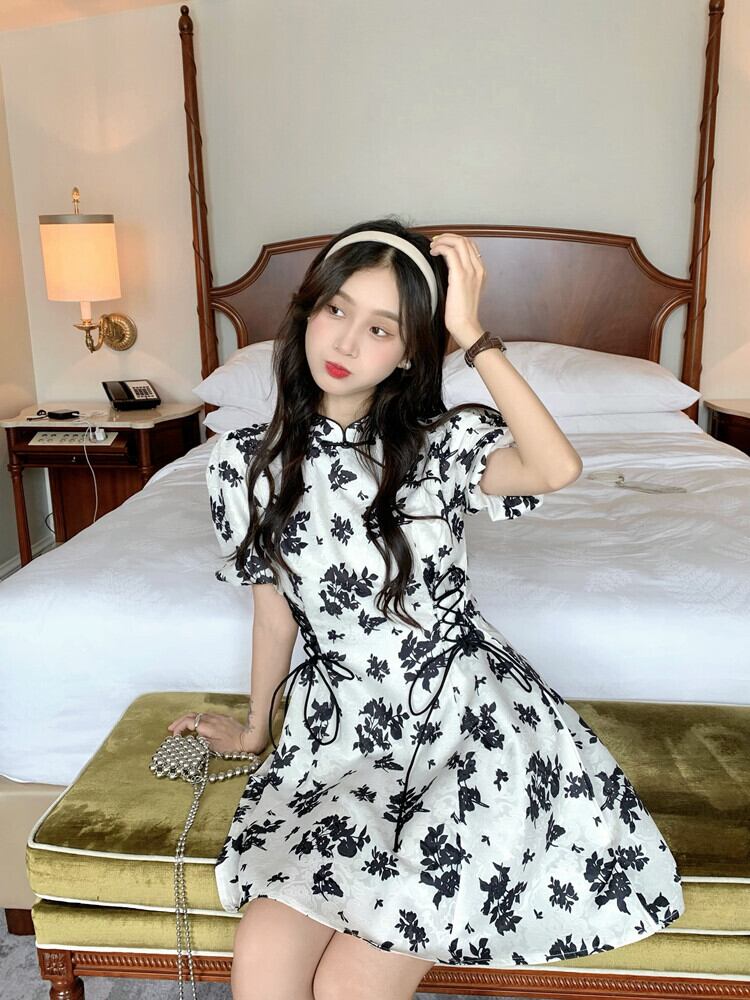 改良されたチャイナドレス花柄ドレス女性の夏の新しい中国風の優しい気質パフスリーブスカート小人 サマー 夏物 8571689889153804