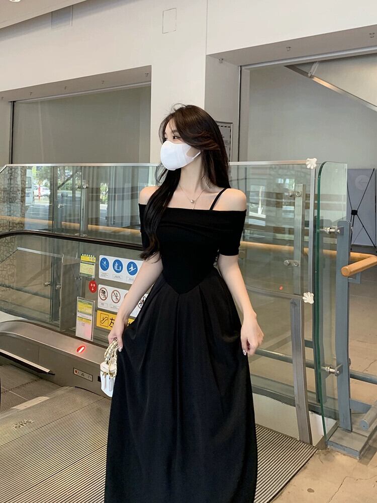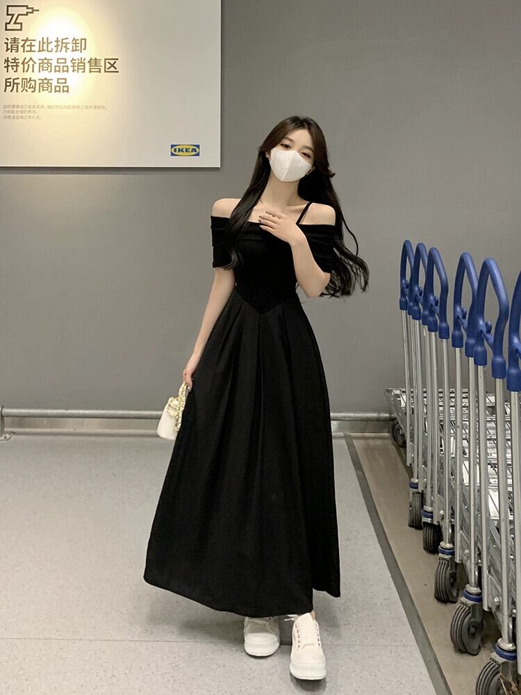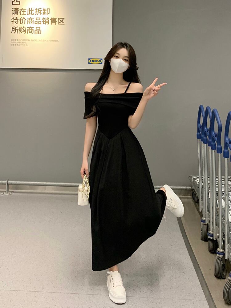 黒のワンショルダードレスの女性の 2023 夏の新しいスタイルフランスの優しい気質の高級オフショルダーロングスカート ブラック サマー 夏物 857168888420249