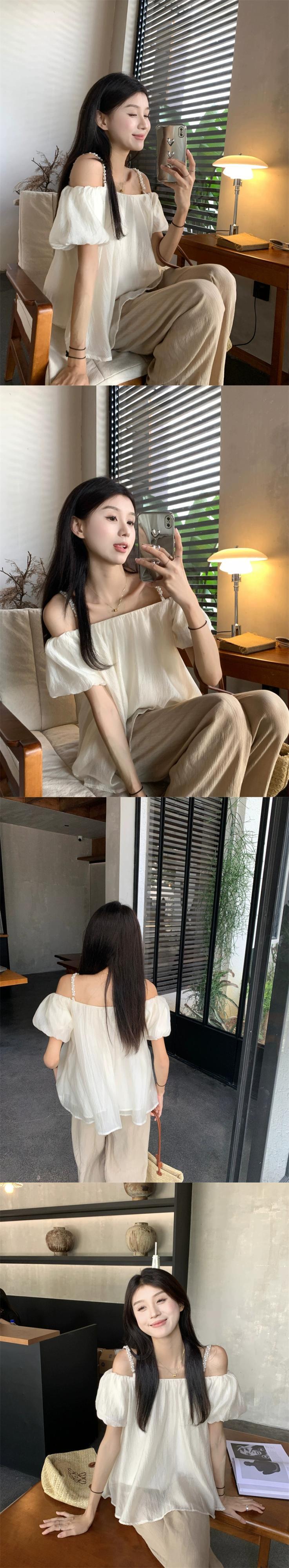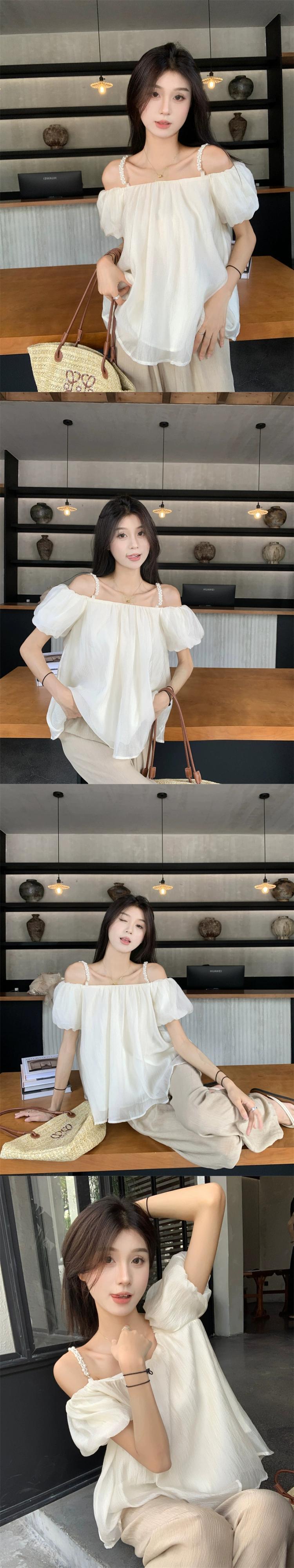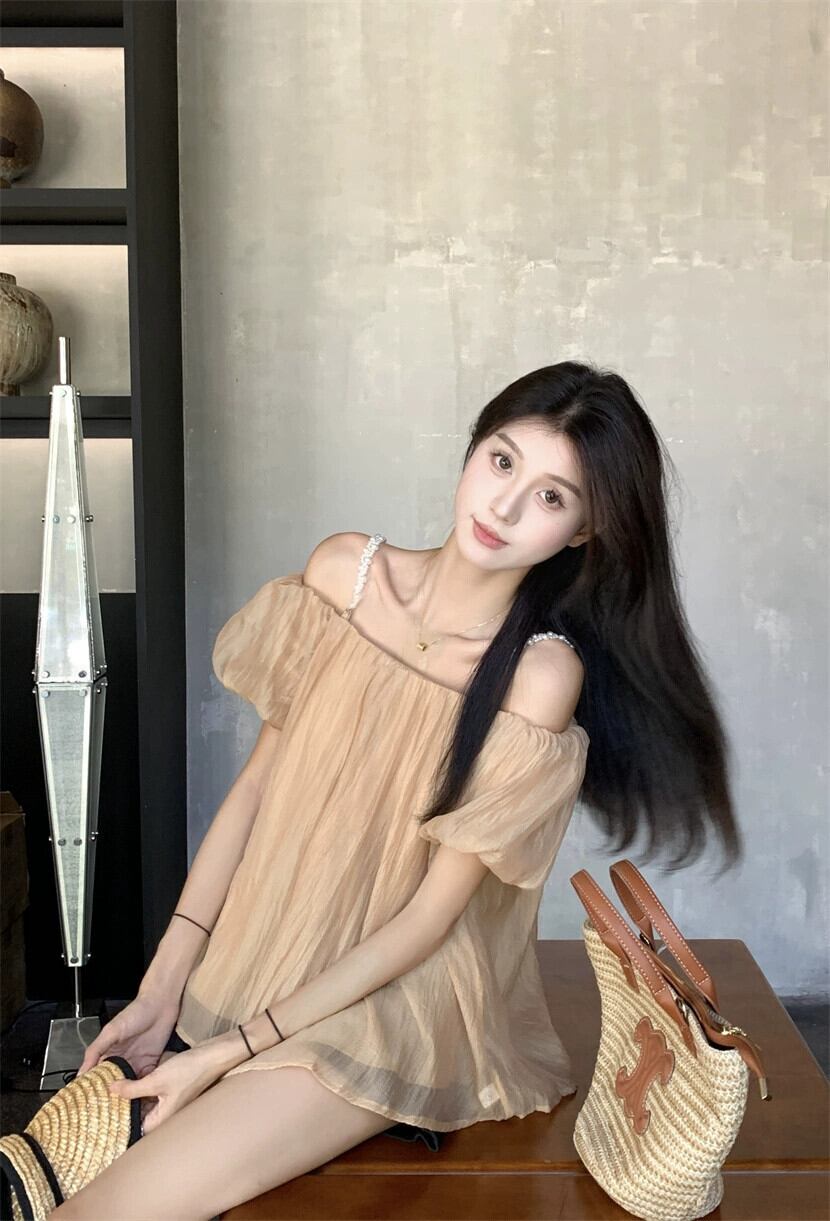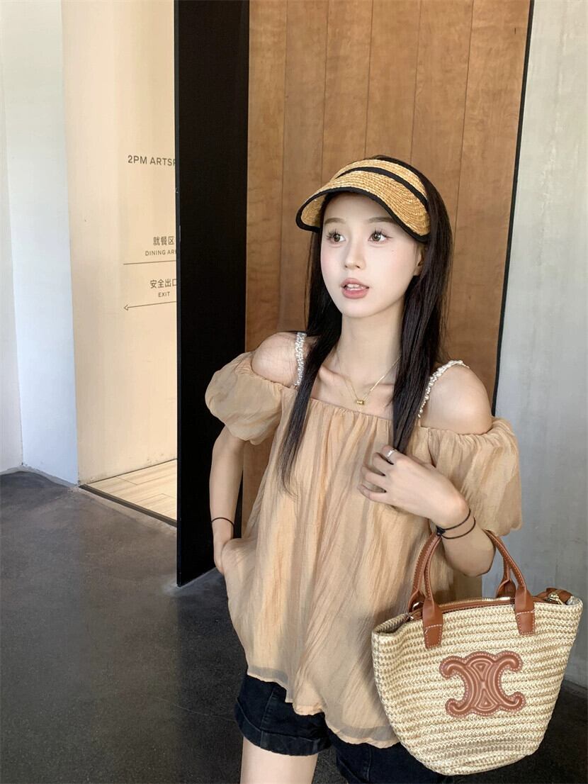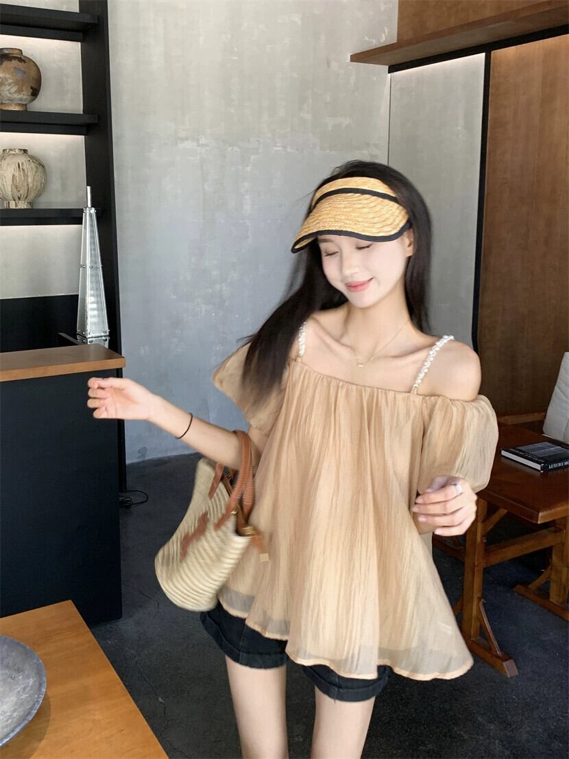 ワンショルダーサスペンダートップレディース2023夏新スタイルフランスの優しい気質スーパーフェアリーアプリコットパフスリーブシャツ サマー 夏物 8571692869182672