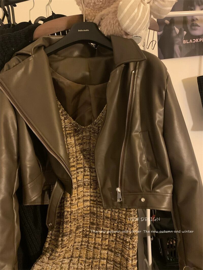 色:コーヒー色のドレス,革のコート