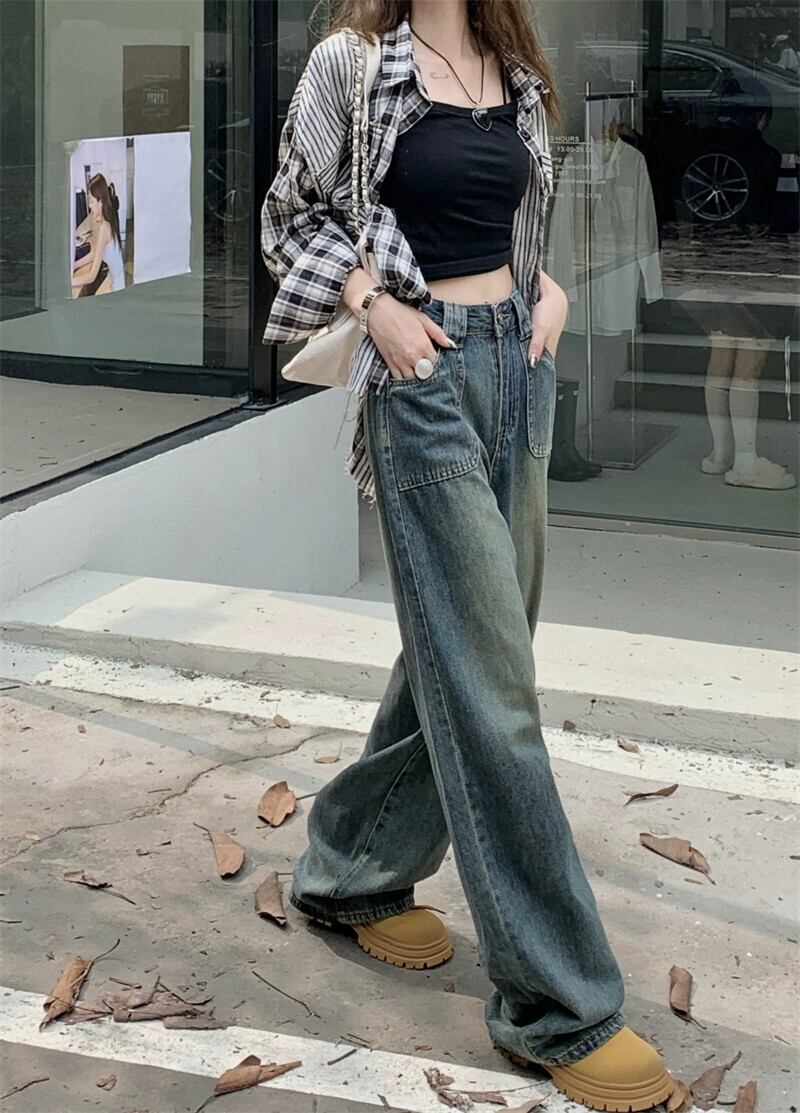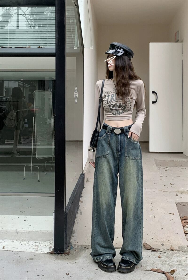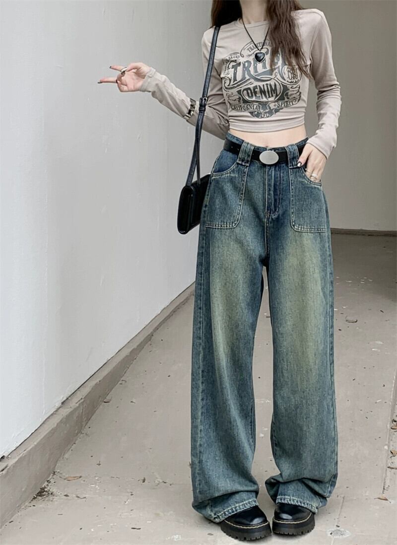 レトロジーンズレディースルーズストレート2023年秋新作ハイウエストとドレープ感のあるアメリカンハイストリートフロアレングスワイドレッグパンツ オータム 秋物 857169926152771