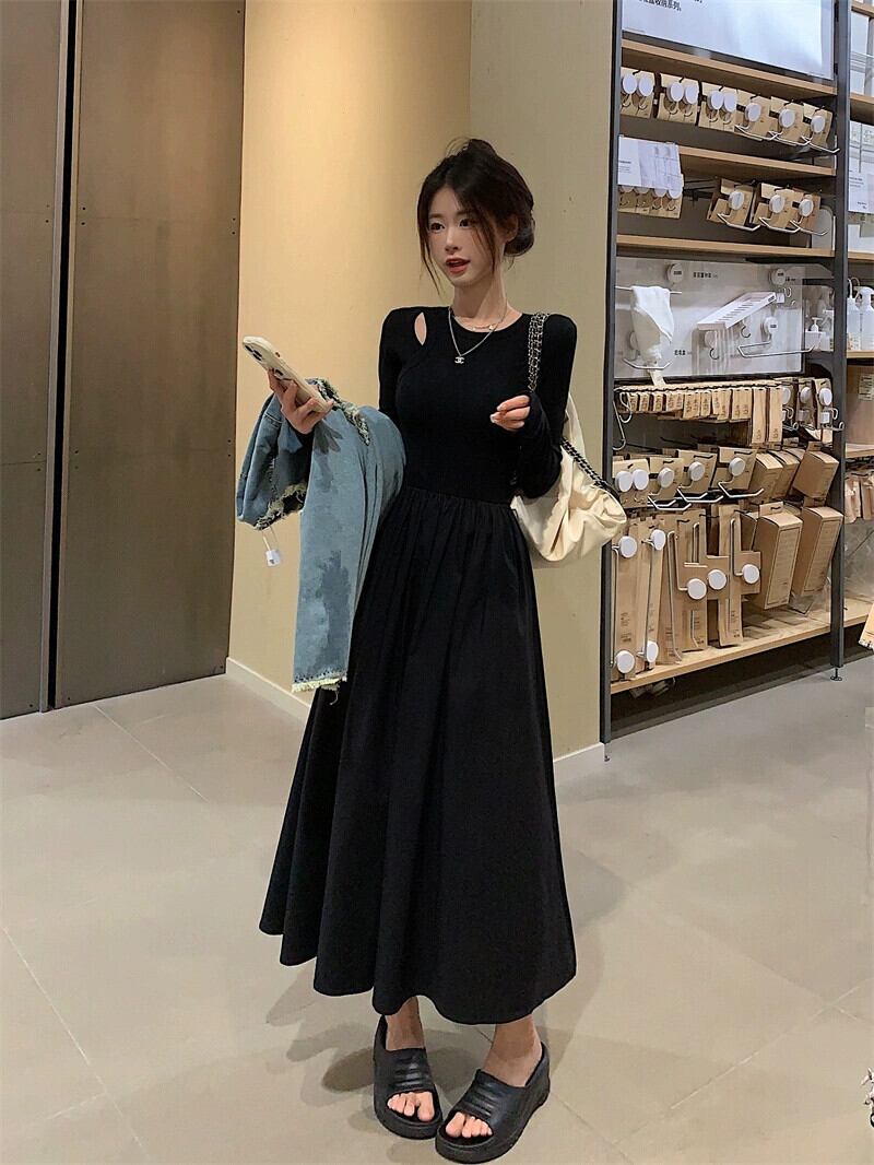 中空長袖ドレスの女性の秋と冬のフレンチ ヘップバーン スタイルのリトル ブラック ドレス コートとボトリング スカート ロング スカート オータム 秋物 ウィンター 冬物 8571655306214068
