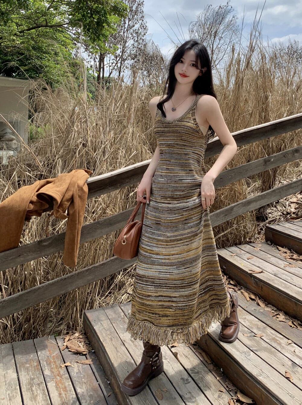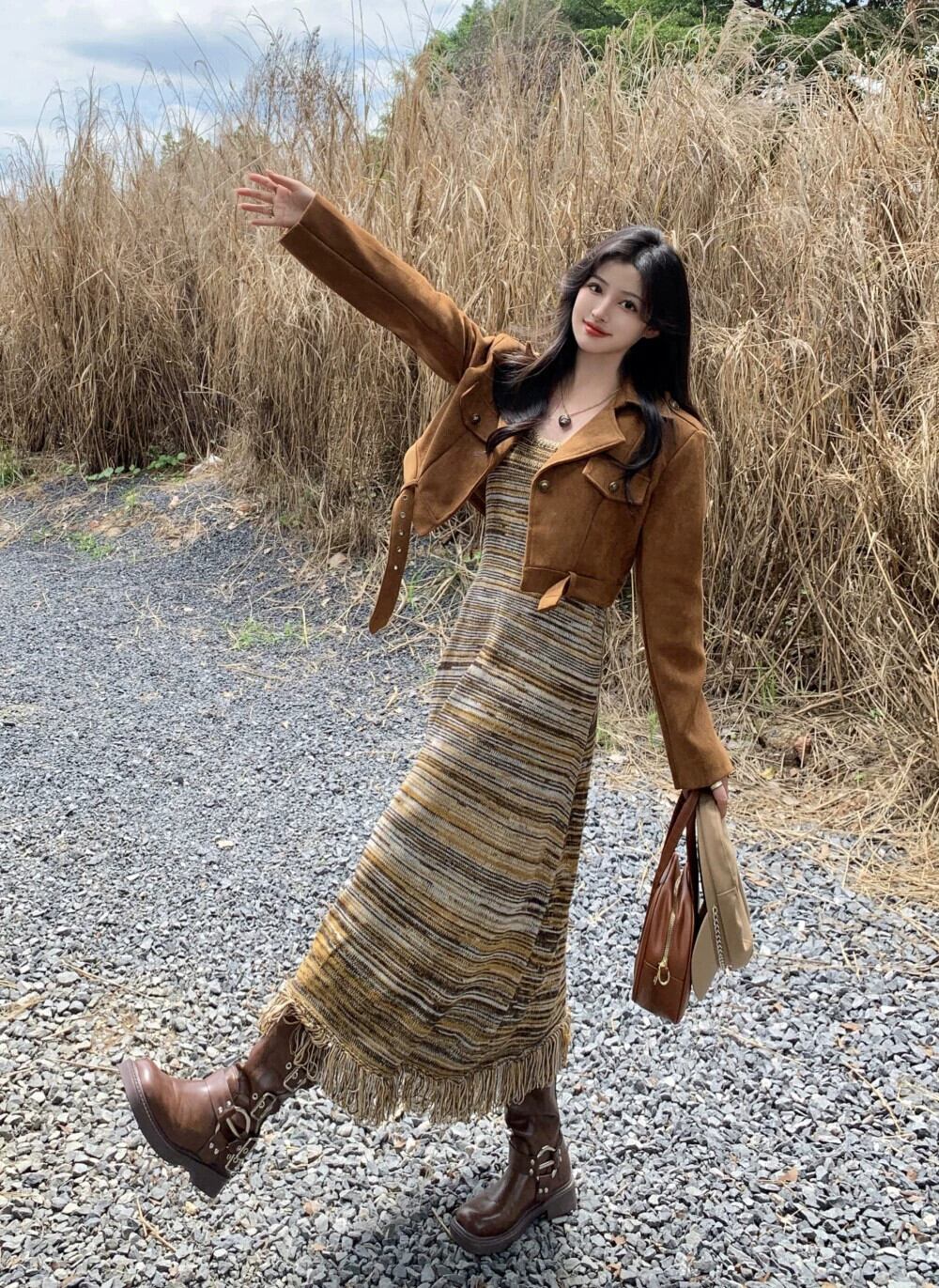 色:ブラウンのモーターサイクルジャケット,ニットワンピース,ブロガー募集オーダー