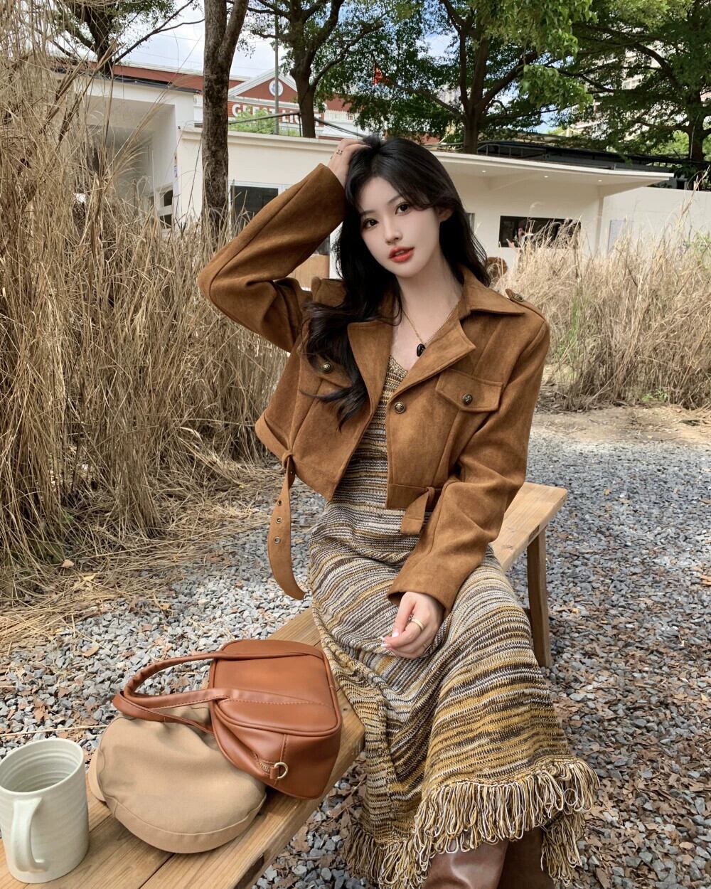 フェイクスエードブラウンジャケット女性秋 2023 新しいメイラード着用ハイエンドショートオートバイジャケット スウェード オータム 秋物 ファー 8571656913060005