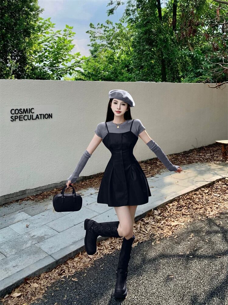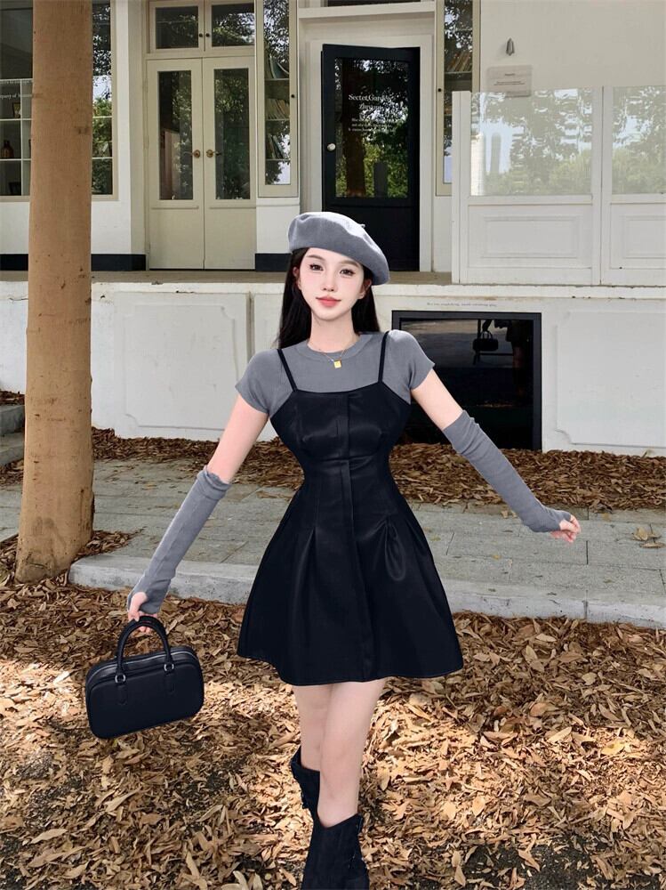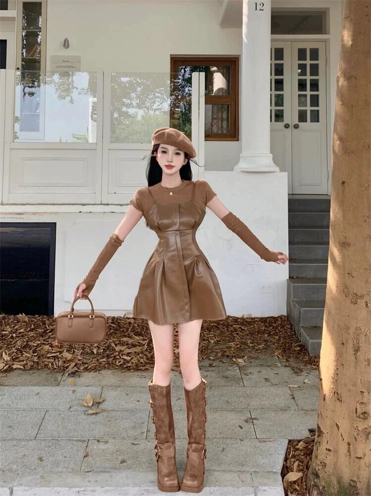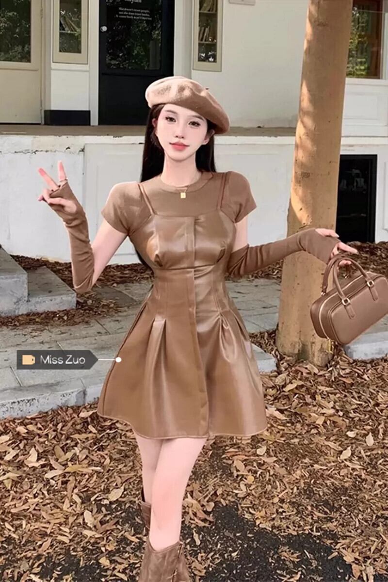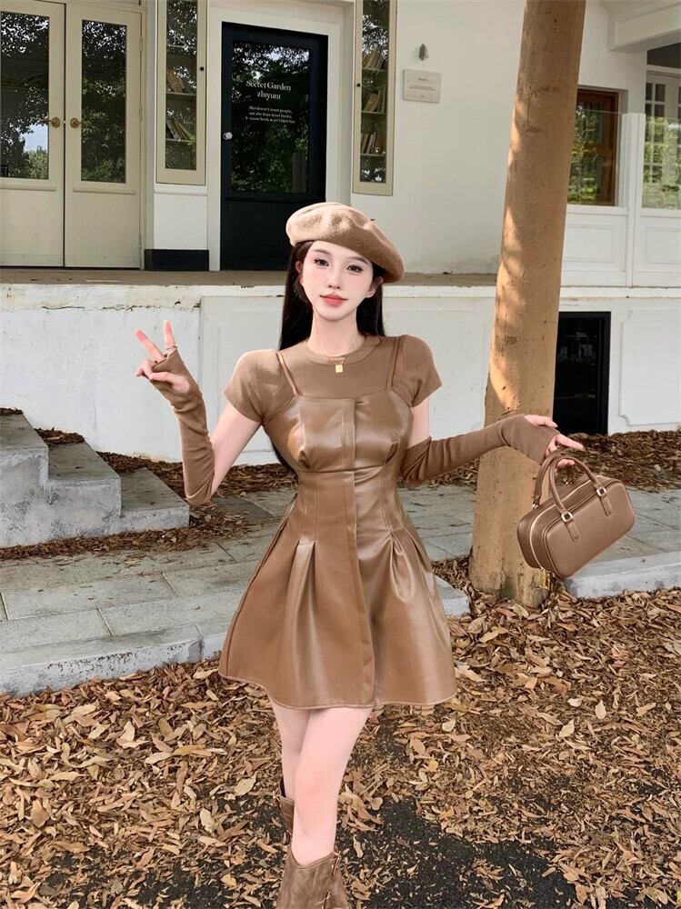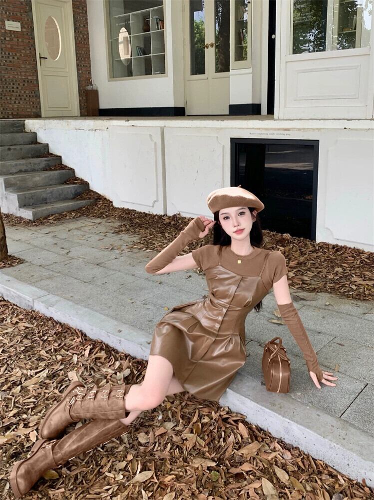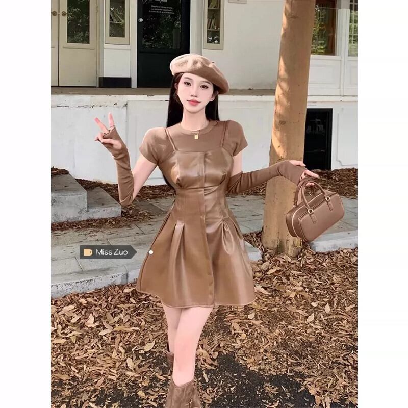 カーキレザースカートサスペンダードレス女性の秋のショートメイラードは、甘くてスパイシーなショートスカートの完全なセットを着ています 大人ガーリー スウィート キュート カジュアル オータム 秋物 8571620744442210