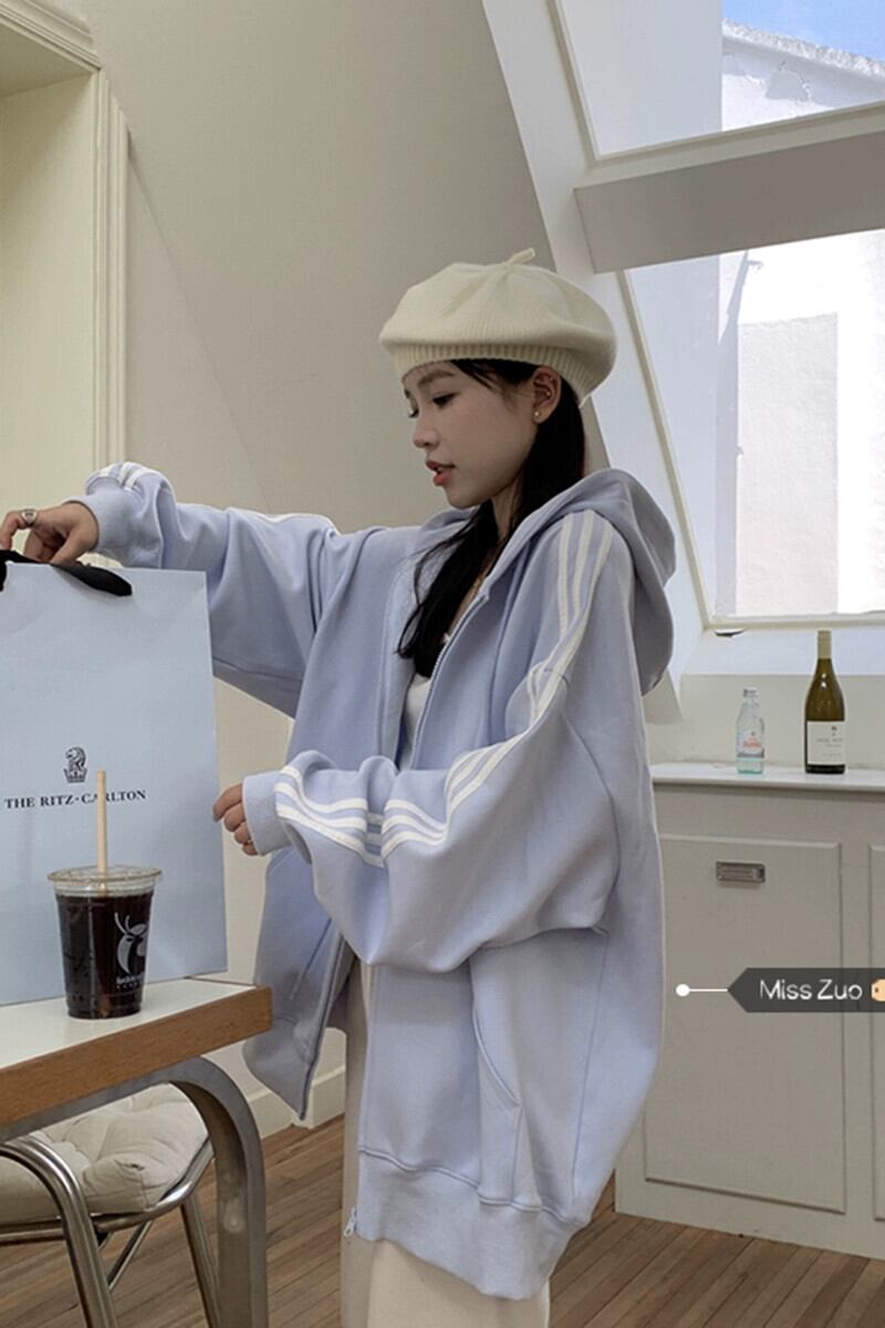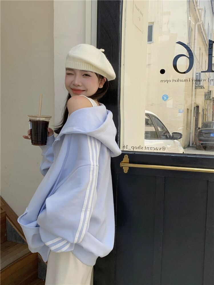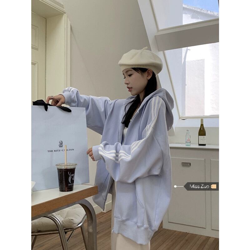 ブルーのフード付きスウェットシャツカーディガンコート女性の秋と冬の新しいスタイルベルベット肥厚アメリカンスタイル怠惰なスタイルのスリーストライプトップ オータム 秋物 ウィンター 冬物 8571697792361365