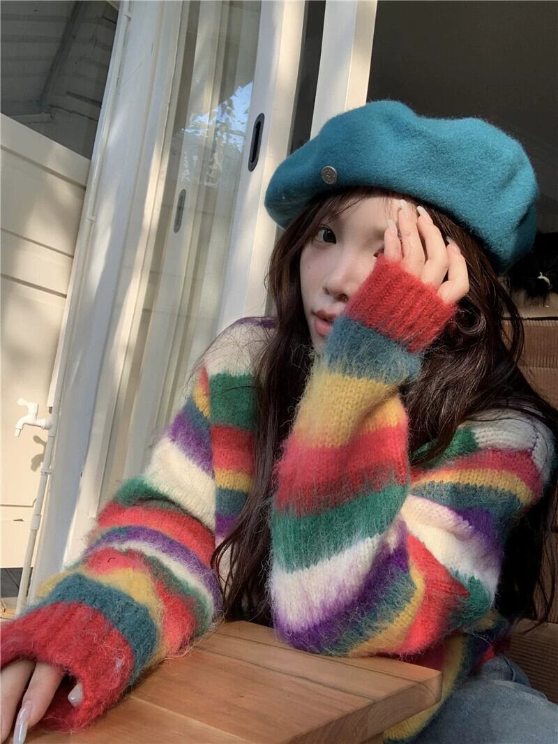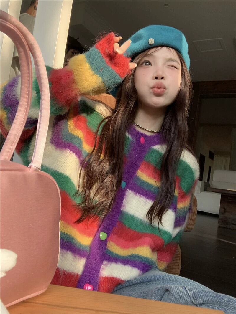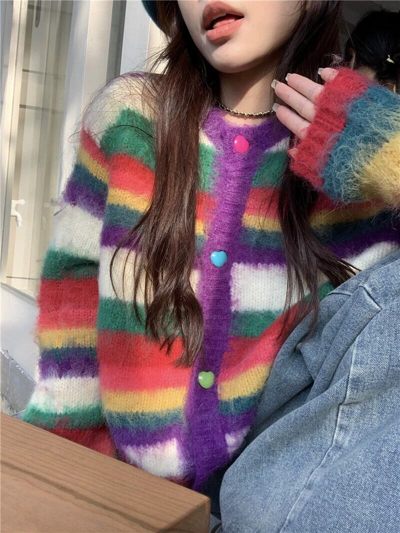 レインボーストライプセータージャケットレディース秋ドーパミン衣装2023甘くて優しいショートニットカーディガン 大人ガーリー スウィート キュート カジュアル オータム 秋物 8571683841971822