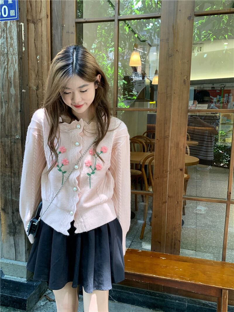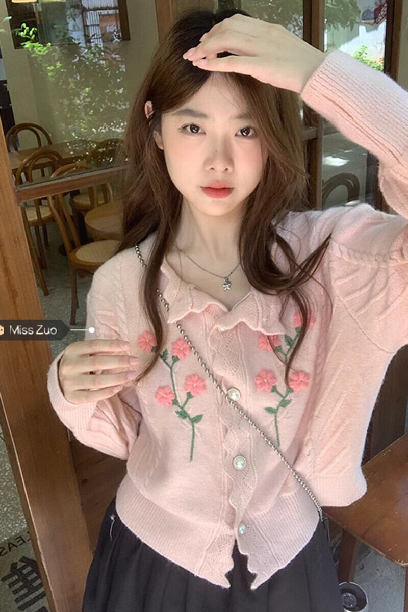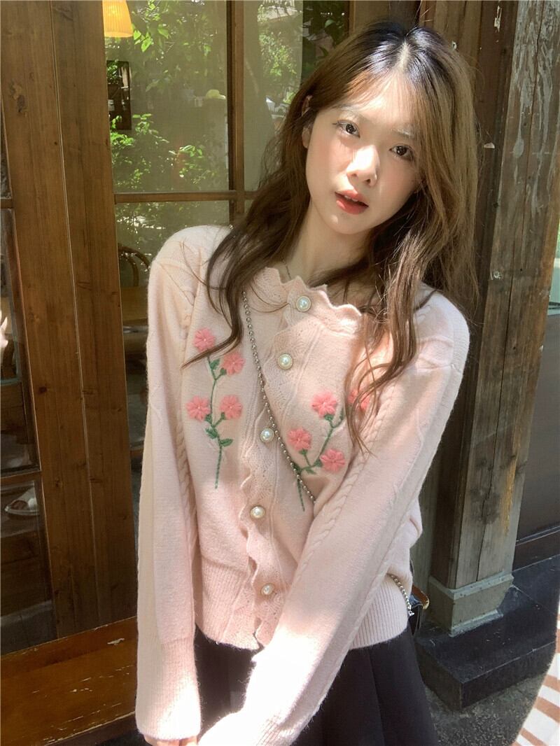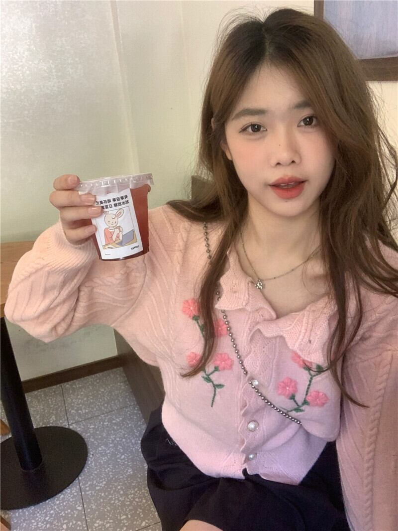 ピンクの立体花セータージャケット女性の 2023 秋の新作ミルクフフ怠惰で優しいスタイルのニットカーディガン オータム 秋物 フラワーデザイン 857161656557475
